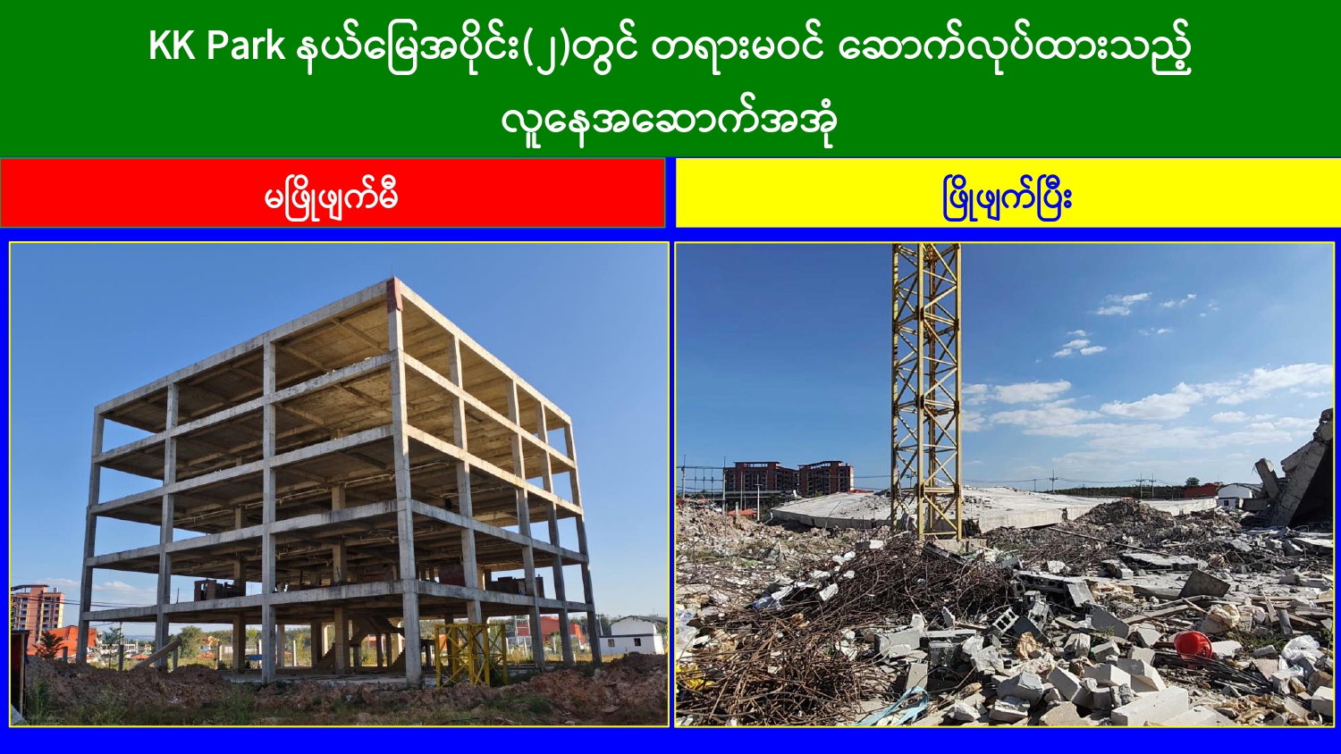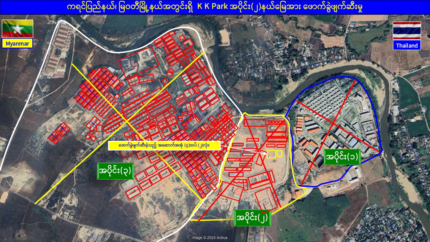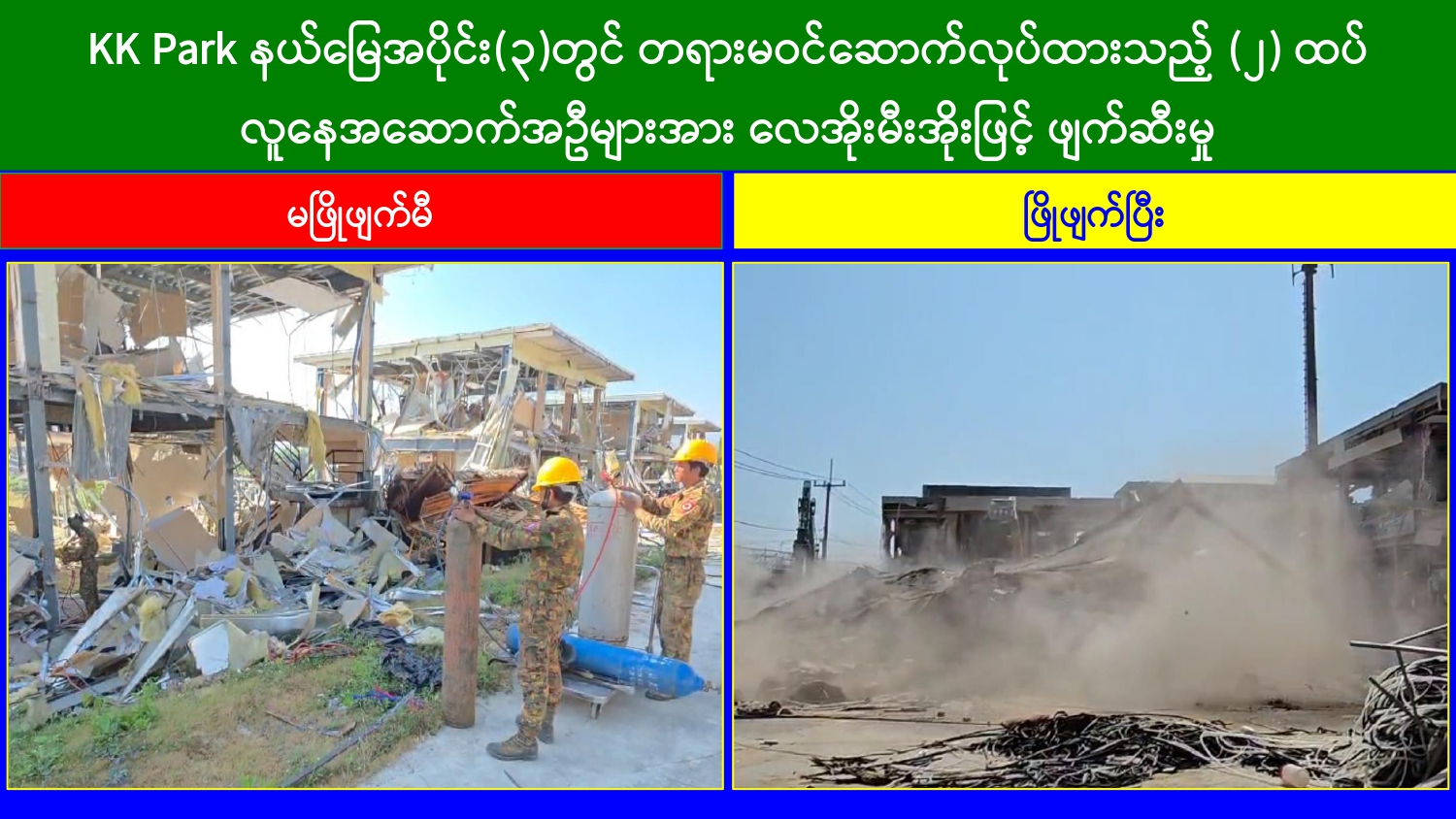 မြန်မာနိုင်ငံအစိုးရအနေဖြင့် အွန်လိုင်းလိမ်လည်လောင်းကစားမှုများ အများဆုံး အခြေချလုပ်ကိုင်လျက်ရှိကြသည့် ရွှေကုက္ကိုလ်နယ်မြေနှင့် KK Park နယ်မြေများရှိ တရားမဝင် အဆောက်အအုံများအတွင်း ဝင်ရောက်ရှင်းလင်း၍ အွန်လိုင်းလိမ်လည် လောင်းကစားမှုလုပ်ငန်းစဉ်များတွင် အသုံးပြုခဲ့သည့် သိမ်းဆည်းရမိပစ္စည်းများအား စနစ် တကျဖျက်ဆီးခြင်းနှင့် တရားမဝင်အဆောက်အအုံများအား စနစ်တကျဖြိုချ ဖျက်ဆီးခြင်း များကို အဖွဲ့စုံပါဝင်သည့် ပူးပေါင်းအဖွဲ့ဖြင့် ဆောင်ရွက်လျက်ရှိရာ ယနေ့တွင် လည်း KK Park နယ်မြေအတွင်းရှိ တရားမဝင်အဆောက်အအုံ ၂ လုံးကို ထပ်မံဖြိုချ ဖျက်ဆီး ခဲ့ကြောင်း သိရှိရသည်။
