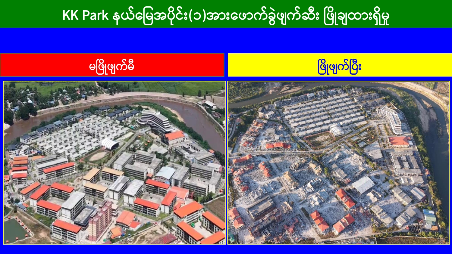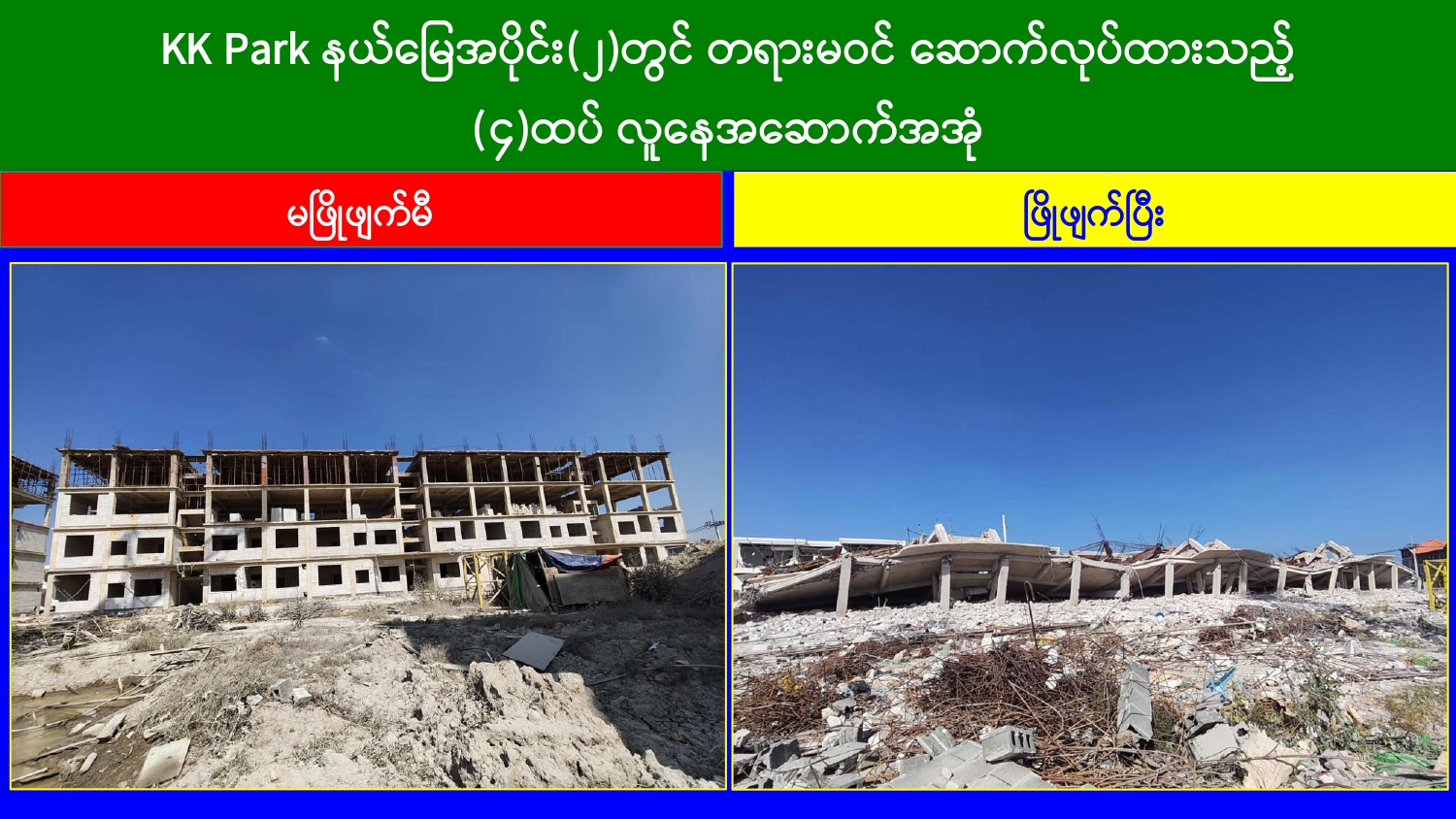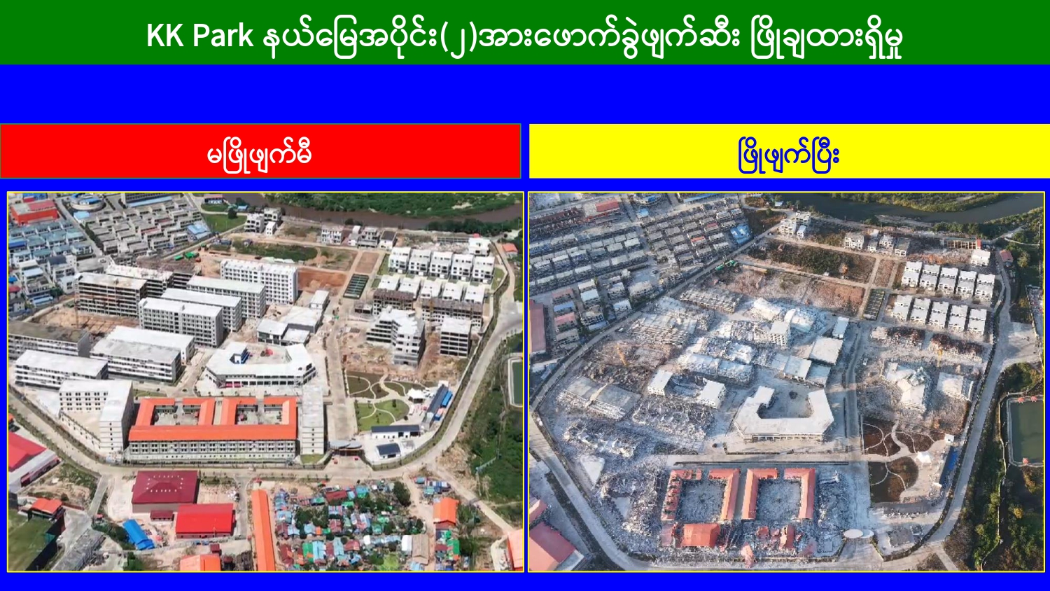 မြန်မာနိုင်ငံအစိုးရအနေဖြင့် အွန်လိုင်းလိမ်လည်လောင်းကစားမှုများ အများဆုံး အခြေချလုပ်ကိုင်လျက်ရှိကြသည့် ရွှေကုက္ကိုလ်နယ်မြေနှင့် KK Park နယ်မြေများရှိ တရားမဝင် အဆောက်အအုံများအတွင်း ဝင်ရောက်ရှင်းလင်း၍ အွန်လိုင်းလိမ်လည် လောင်းကစားမှုလုပ်ငန်းစဉ်များတွင် အသုံးပြုခဲ့သည့် သိမ်းဆည်းရမိပစ္စည်းများအား စနစ် တကျဖျက်ဆီးခြင်းနှင့် တရားမဝင်အဆောက်အအုံများအား စနစ်တကျဖြိုချ ဖျက်ဆီးခြင်း များကို အဖွဲ့စုံပါဝင်သည့် ပူးပေါင်းအဖွဲ့ဖြင့် ဆောင်ရွက်လျက်ရှိရာ ယနေ့တွင် လည်း KK Park နယ်မြေအတွင်းရှိ တရားမဝင်အဆောက်အအုံ ၂ လုံးကို ထပ်မံဖြိုချ ဖျက်ဆီး ခဲ့ကြောင်း သိရှိရသည်။