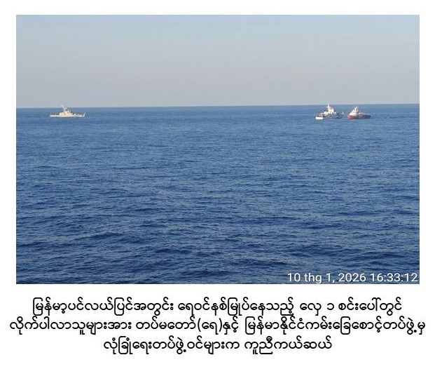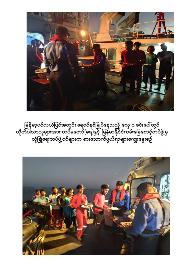 ရန်ကုန်တိုင်းဒေသကြီး၊ ရန်ကုန်မြို့၏ တောင်ဘက် ရေမိုင် ၁၅၆ မိုင်ခန့် အကွာရှိ မြန်မာ့ပင်လယ်ပြင်အတွင်း ရေဝင်နစ်မြုပ်နေသည့် လှေတစ်စင်းပေါ်မှ လိုက်ပါလာသူ များအား တပ်မတော်(ရေ)နှင့် မြန်မာနိုင်ငံကမ်းခြေစောင့်တပ်ဖွဲ့မှ လုံခြုံရေးတပ်ဖွဲ့ဝင်များ က ကူညီကယ်ဆယ်ရေးလုပ်ငန်းများ ဆောင်ရွက်ပေးခဲ့ကြောင်း သိရှိရသည်။
