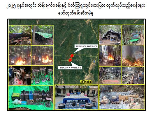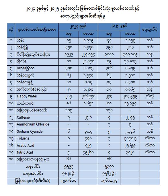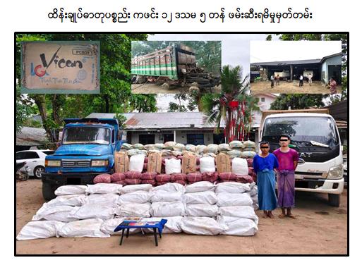 အလားတူ မူးယစ်ဆေးဝါးထုတ်လုပ်ရာတွင်အသုံးပြုရန် တရားမဝင်တင်သွင်းလာသည့် ထိန်းချုပ် ဓာတုပစ္စည်း Caffeine ၂၂ ဒသမ ၇ တန်ကျော်၊ Acetone ၉၆၀ လီတာ၊ Toluene ၅,၀၄၀ လီတာကျော်၊ Ammonium Chloride ၅ တန်၊ Sodium Cyanide ၂ တန်ကျော်၊ အခြားဓာတုပစ္စည်းများဖြစ်သည့် Sodium Carbonate ၅ တန်၊ Acetic Acid ၂၅,၆၀၀ လီတာကျော်၊ Nitric Acid ၃,၈၂၀ လီတာ အပါအဝင် ထိန်းချုပ်ဓာတုပစ္စည်းများနှင့် အခြားဓာတုပစ္စည်းများကို ဖမ်းဆီးရမိခဲ့ပြီး ရှမ်းပြည်နယ် (မြောက်ပိုင်း)၊ မိုင်းရယ်မြို့နယ်၊ ပုံတတ်ကျေးရွာအနီး၌ ဘိန်းချက်စခန်း ၁ ခုအား ဆက်စပ်ပစ္စည်းများနှင့် လည်းကောင်း၊ ရှမ်းပြည်နယ်(အရှေ့ပိုင်း)၊ တာချီလိတ်မြို့နယ်၊ မိုင်းဟဲ(အောက်)ကျေးရွာအနီး၌ စိတ်ကြွ ရူးသွပ်ဆေးပြား ထုတ်လုပ်သည့်စခန်း ၂ ခုအား ဆက်စပ်ပစ္စည်းများနှင့်လည်းကောင်း၊ တာချီလိတ် မြို့နယ်၊ ဝမ်ကောင်းမွန်ကျေးရွာရှိနေအိမ်မှ ဆေးပြားရိုက်စက်နှင့် ဆက်စပ်ပစ္စည်းများကိုလည်းကောင်း ဖော်ထုတ်ဖမ်းဆီး အရေးယူနိုင်ခဲ့ကြောင်း သိရှိရသည်။