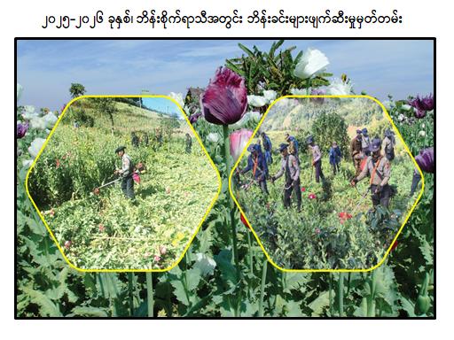 ထို့ပြင် ၂၀၂၅-၂၀၂၆ ဘိန်းစိုက်ရာသီတွင် ရှမ်းပြည်နယ်(တောင်ပိုင်း)နှင့် ရှမ်းပြည်နယ် (အရှေ့ပိုင်း)တို့ရှိ ဘိန်းစိုက်ခင်းစုစုပေါင်း ၅၀၈၄ ဒသမ ၅ ဧက (၂၀၅၇ ဒသမ ၆၆ ဟက်တာ)ကို တပ်မတော်၊ မြန်မာနိုင်ငံရဲတပ်ဖွဲ့နှင့် ဆက်စပ်ဌာနဆိုင်ရာများ၊ ဌာနေပြည်သူ့စစ်အဖွဲ့ဝင်များ၊ ဒေသခံပြည်သူ့လုံခြုံရေးနှင့် အကြမ်းဖက်နှိမ်နင်းရေးအဖွဲ့ဝင်များပါဝင်သော ပူးပေါင်းအဖွဲ့ဖြင့် ဖျက်ဆီးနိုင်ခဲ့ပြီး ကျန်ရှိသည့် ဘိန်းစိုက်ခင်းများအားလည်း ဆက်လက်ဖျက်ဆီးလျက်ရှိကြောင်း သတင်းရရှိသည်။