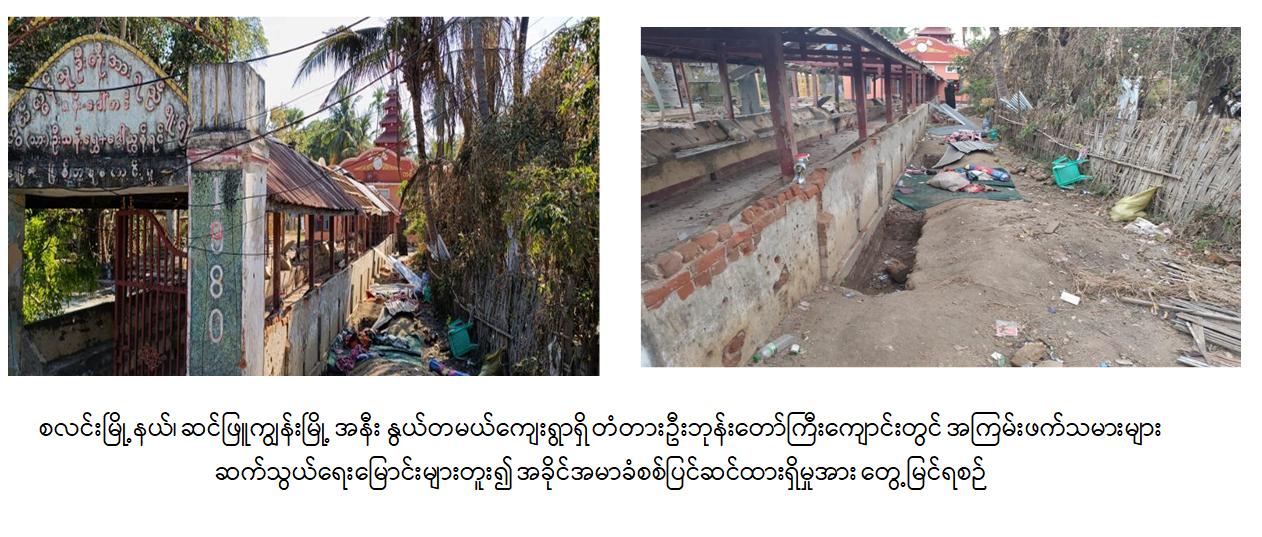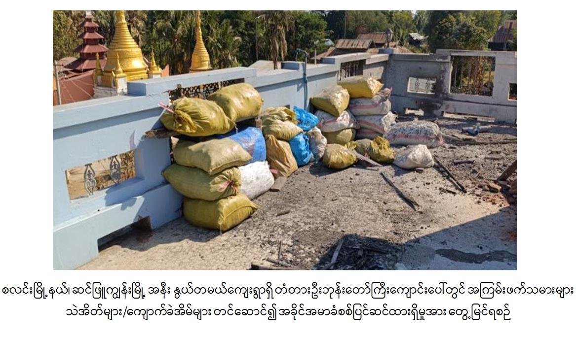 ထို့ပြင် အကြမ်းဖက်သမားများသည် ကျေးရွာရှိ ဘုရားစေတီပုထိုးများ၊ တံတားဦးဘုန်းတော်ကြီးကျောင်း၊ ပဒေသာဘုန်းတော်ကြီးကျောင်းနှင့် သာသနိက အဆောက်အအုံများ၊ ဌာနဆိုင်ရာအဆောက်အအုံများ၊ ကျေးရွာအခြေခံပညာ အလယ်တန်းကျောင်းခွဲနှင့် ဒေသခံပြည်သူများ၏ နေအိမ်များအတွင်းနှင့် ခြံဝန်းများ အတွင်း၌ အခြေပြု၍ ဘန်ကာများ၊ သဲအိတ်များ၊ ကတုတ်ကျင်းများဖြင့် အခိုင်အမာ ခံစစ်တည်ဆောက်ပြီး ဘုရားစေတီများ၊ သာသနိကအဆောက်အအုံများ၊ တန်ဆောင်းများနှင့် စာသင်ကျောင်းများကို အကာအကွယ်ရယူ၍ ခုခံတိုက်ခိုက် ခြင်း၊ ကျေးရွာတံတားအား ဖောက်ခွဲဖျက်ဆီးပြီး အကာအကွယ်ပြုလုပ်ထားခြင်း၊ ဘုန်းတော်ကြီးကျောင်းဝန်းများနှင့် ကျေးရွာလမ်းများ၌ လက်လုပ်မိုင်းများ ထောင် ထားခြင်းတို့ လုပ်ဆောင်ထားသည်ကို တွေ့ရှိခဲ့ရကြောင်းနှင့် ကျေးရွာအတွင်း၌ လက်လုပ်မိုင်းအန္တရာယ်ကင်းဝေးစေရေးအတွက် လုံခြုံရေးတပ်ဖွဲ့ဝင်များက မိုင်းရှင်း လင်းရေး လုပ်ငန်းများကို ဆောင်ရွက်ပေးလျက်ရှိကြောင်း သိရှိရသည်။