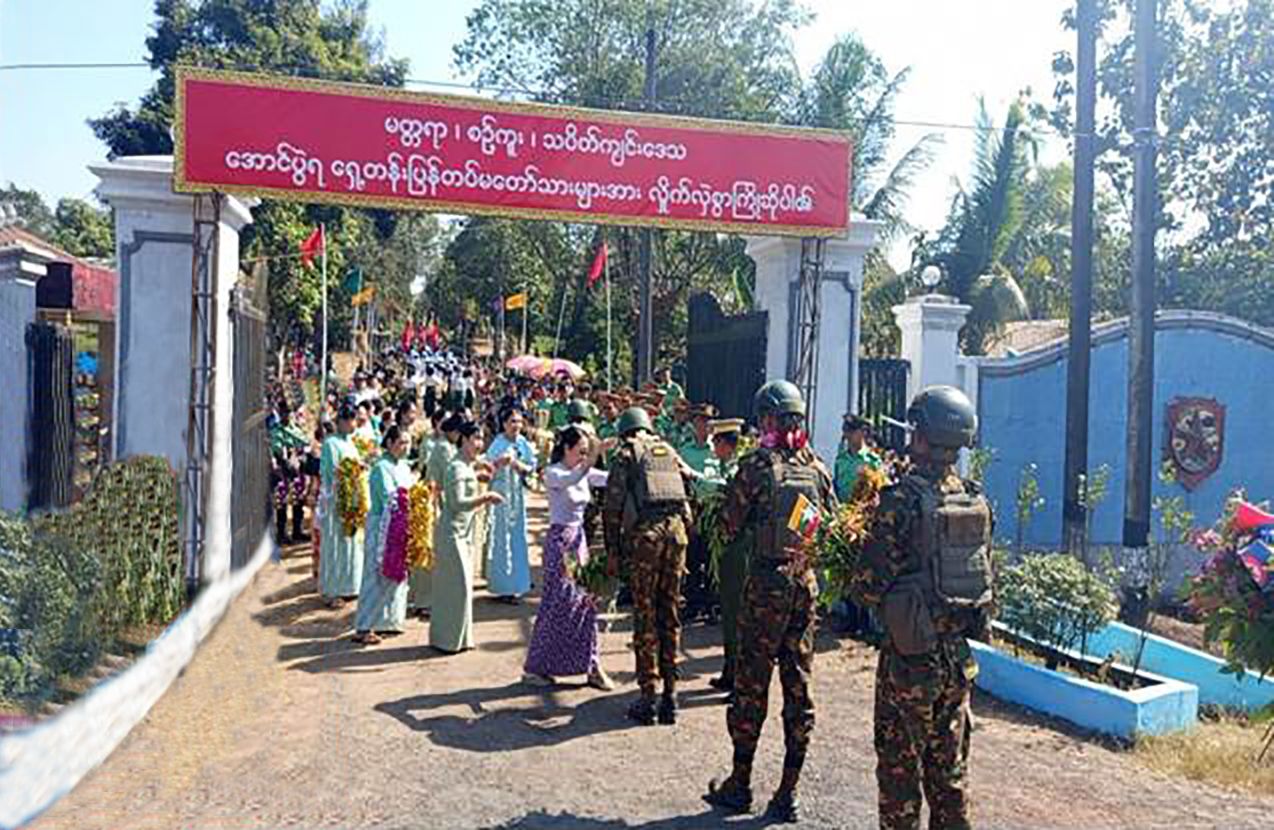 ပြည်သူများအား နှိပ်စက်ညှင်းပန်း၍ ဒေသဖွံ့ဖြိုးတိုးတက်မှုကို ချွတ်ခြုံကျစေ သည့် အကြမ်းဖက်လုပ်ရပ်များကို လုပ်ဆောင်ခဲ့သော မန္တလေးတိုင်းဒေသကြီး မတ္တရာ၊ စဉ့်ကူး၊ သပိတ်ကျင်း ဒေသတစ်ဝိုက်ရှိ လက်နက်ကိုင်အကြမ်းဖက်အဖွဲ့များနှင့် PDF အမည်ခံအကြမ်းဖက်အဖွဲ့များအား ရွပ်ရွပ်ချွံချွံတိုက်ပွဲဝင်၍ အောင်ပွဲအလီလီရယူနိုင် ခဲ့သော ရှေ့တန်းပြန်နိုင်ငံ့သားကောင်း တပ်မတော်သားများအား ဂုဏ်ပြုကြိုဆိုခြင်းကို ယနေ့နံနက်ပိုင်းတွင် ရန်ကုန်တိုင်းဒေသကြီး၊ မှော်ဘီမြို့နယ်ရှိ နယ်မြေခံတပ်ရင်း၌ ပြုလုပ်ရာ ရန်ကုန်တိုင်းစစ်ဌာနချုပ် တိုင်းမှူး ဗိုလ်ချုပ် ပြည့်စုံလင်းနှင့် ဌာနဆိုင်ရာ တာဝန်ရှိသူများ၊ ကျောင်းသား/ကျောင်းသူများ၊ အနုပညာရှင်များနှင့် ဒေသခံပြည်သူ များ တက်ရောက်ကြသည်။