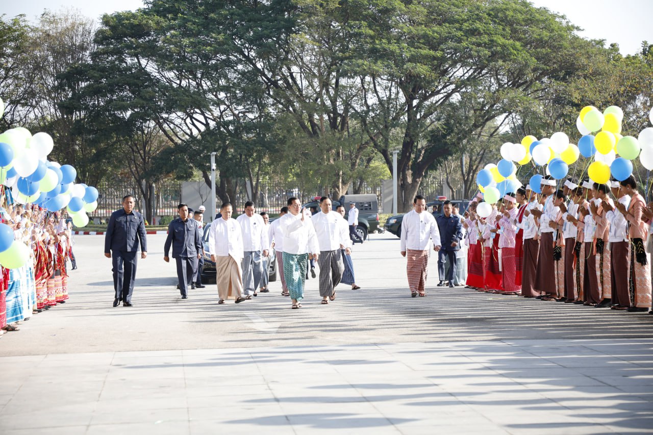 ဦးစွာ နိုင်ငံတော် ယာယီသမ္မတ နိုင်ငံတော်လုံခြုံရေး နှင့် အေးချမ်းသာယာရေး ကော်မရှင်ဥက္ကဋ္ဌနှင့် အဖွဲ့ဝင်များအား တိုင်းရင်းသားလူငယ်မောင်မယ်များက လှိုက်လှဲ နွေးထွေးစွာ ကြိုဆိုနှုတ်ဆက်ကြသည်။