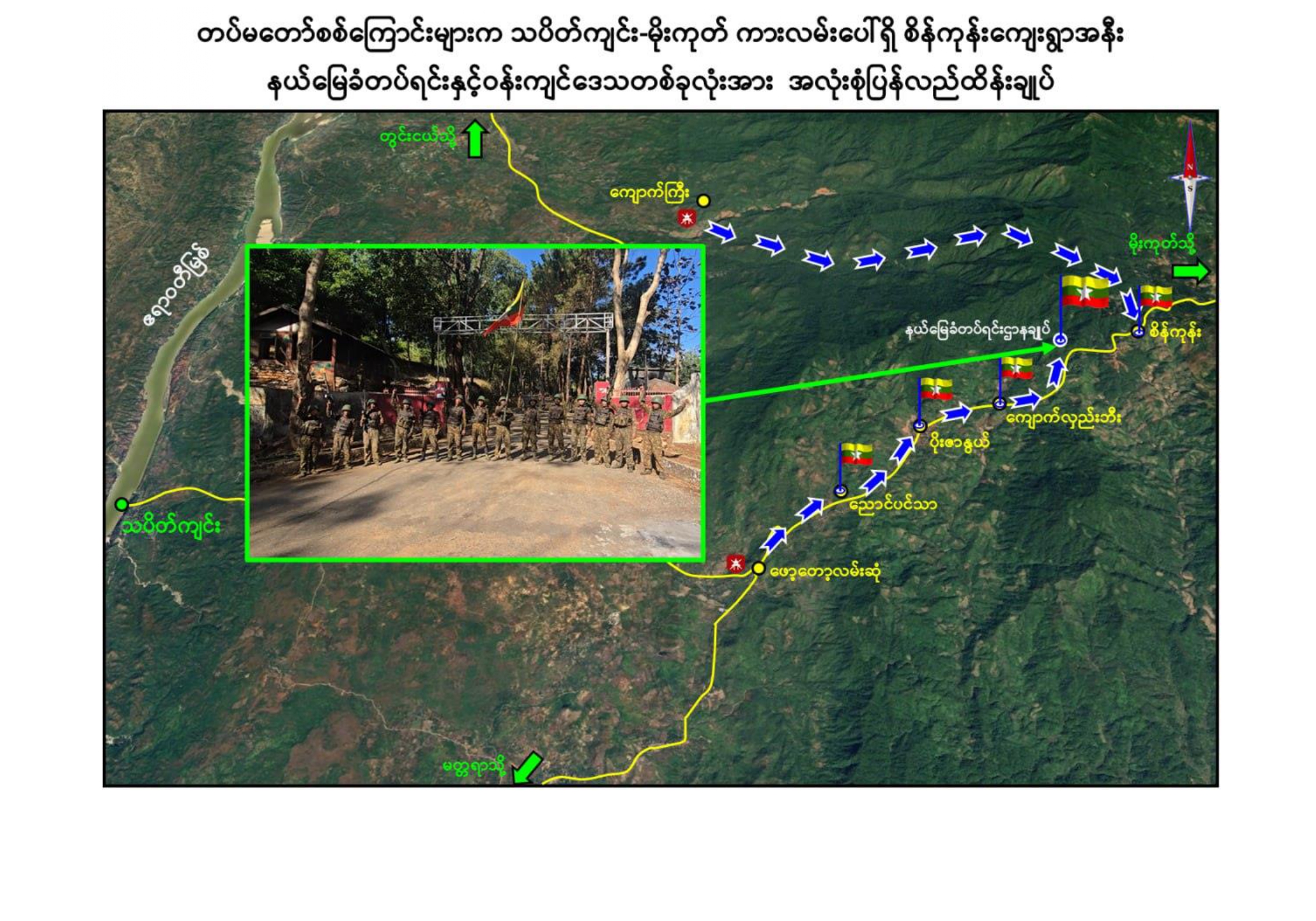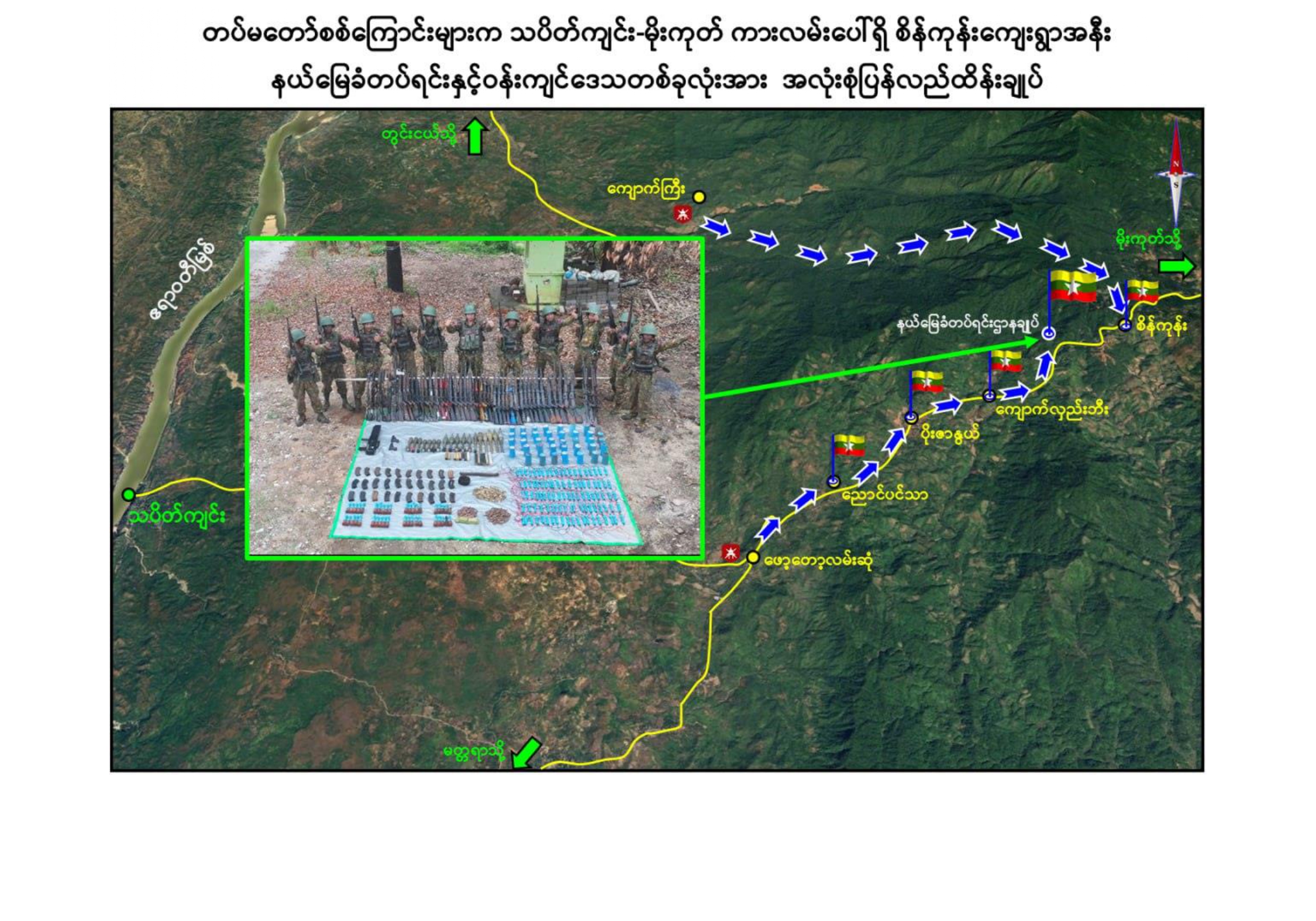 တပ်မတော်စစ်ကြောင်းများအနေဖြင့် သပိတ်ကျင်း-မိုးကုတ် ဒေသအနီး ဝန်းကျင်ရှိ ဒေသခံပြည်သူများ၏ လူမှုစီးပွားဘဝများ လုံခြုံမှုရှိစေရေး၊ ကုန်စည် ကူးသန်းရောင်းဝယ်မှု လွယ်ကူလျင်မြန်စွာချောမွေ့စေရေးနှင့် နိုင်ငံ့စီးပွားတိုးတက်ရေး တို့အတွက် အထောက်အကူပြုသည့် မြေပေါ်/မြေအောက် သယံဇာတများ စနစ်တကျ စီမံဆောင်ရွက်နိုင်ရေးတို့အတွက် သပိတ်ကျင်း-မိုးကုတ် ဆက်သွယ်ရေး လမ်းကြောင်း အား အမြန်ဆုံး ပြန်လည်ဖွင့်လှစ်နိုင်ရေး အကြမ်းဖက်သောင်းကျန်းသူများ ယာယီ စိုးမိုးထားသည့် နယ်မြေခံတပ်ရင်းဌာနချုပ်နှင့် ၎င်းဒေသတစ်ဝိုက်အား ပြန်လည် သိမ်းပိုက်ရရှိရေးအတွက် ဒေသခံပြည်သူများနှင့် အလင်းဝင်ရောက်လာသည့် PDF အဖွဲ့ဝင်များ၏ သတင်းပေးပို့မှုများကို စနစ်တကျပေါင်းစပ် သုံးသပ်ပြီး နယ်မြေလုံခြုံ ရေးလုပ်ငန်းများကို စစ်ကြောင်းများခွဲ၍ ဟန်ချက်ညီစွာ အရှိန်အဟန်ဖြင့် ဆက်လက် ချီတက်ခဲ့ရာ ၂၀၂၆ ခုနှစ်၊ ဇန်နဝါရီ ၁၁ ရက်နေ့တွင် ညောင်ပင်သာကျေးရွာအား လည်းကောင်း၊ ဇန်နဝါရီ ၁၂ ရက်နေ့တွင် ပိုးဇာနွယ်ကျေးရွာ အားလည်းကောင်း၊ ဇန်နဝါရီ ၁၃ ရက်နေ့တွင် ကျောက်လှည်းဘီးကျေးရွာအား လည်းကောင်း၊ ဇန်နဝါရီ ၁၄ ရက် ယနေ့တွင် အဆိုပါလမ်းကြောင်းပေါ်ရှိ နယ်မြေခံတပ်ရင်းဌာနချုပ်နှင့် စိန်ကုန်း ကျေးရွာတစ်ဝိုက်တို့အားလည်းကောင်း တပ်မတော်စစ်ကြောင်းများက အပြည့်အဝ ပြန်လည်သိမ်းပိုက် ထိန်းချုပ်နိုင်ခဲ့သည်။