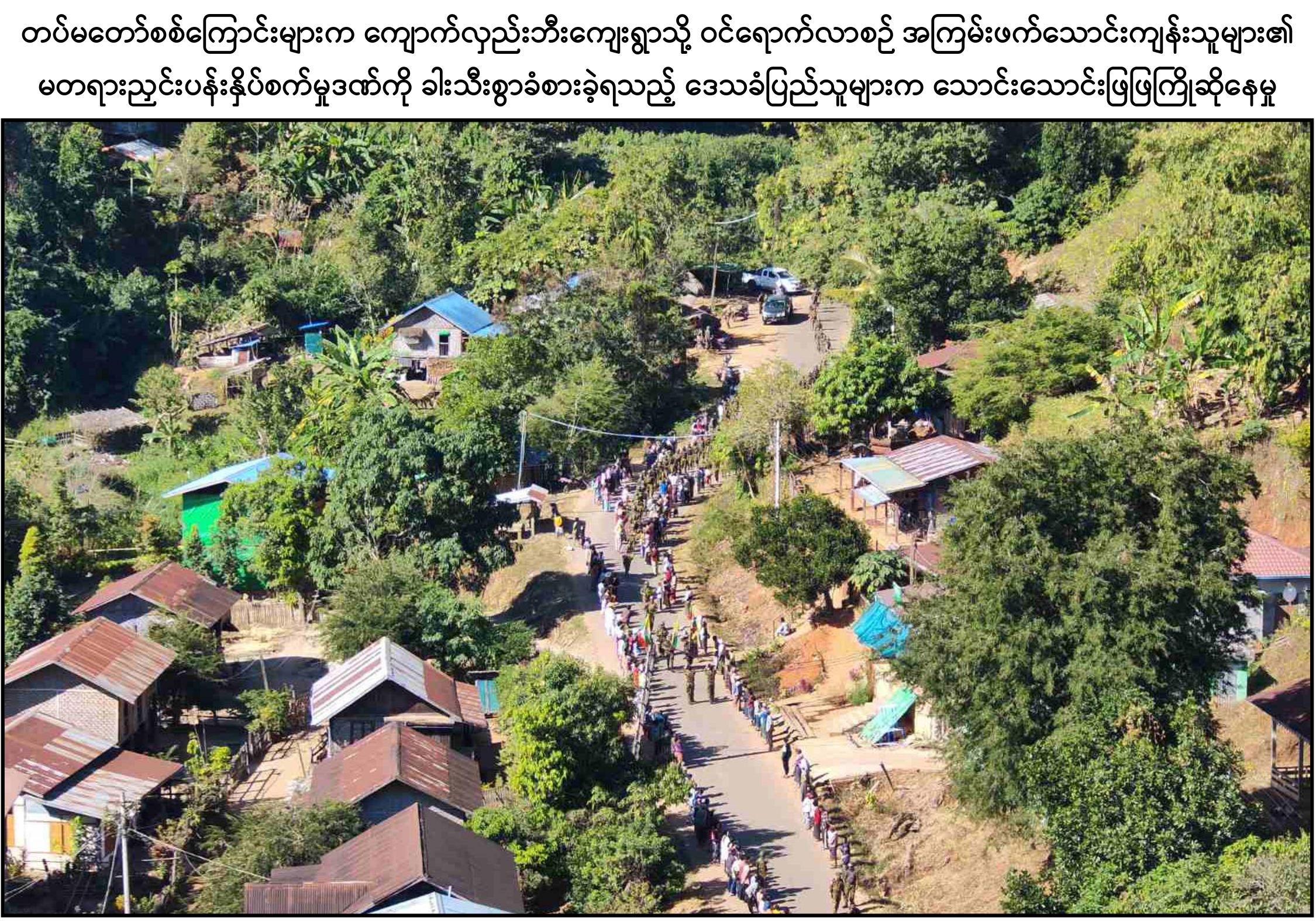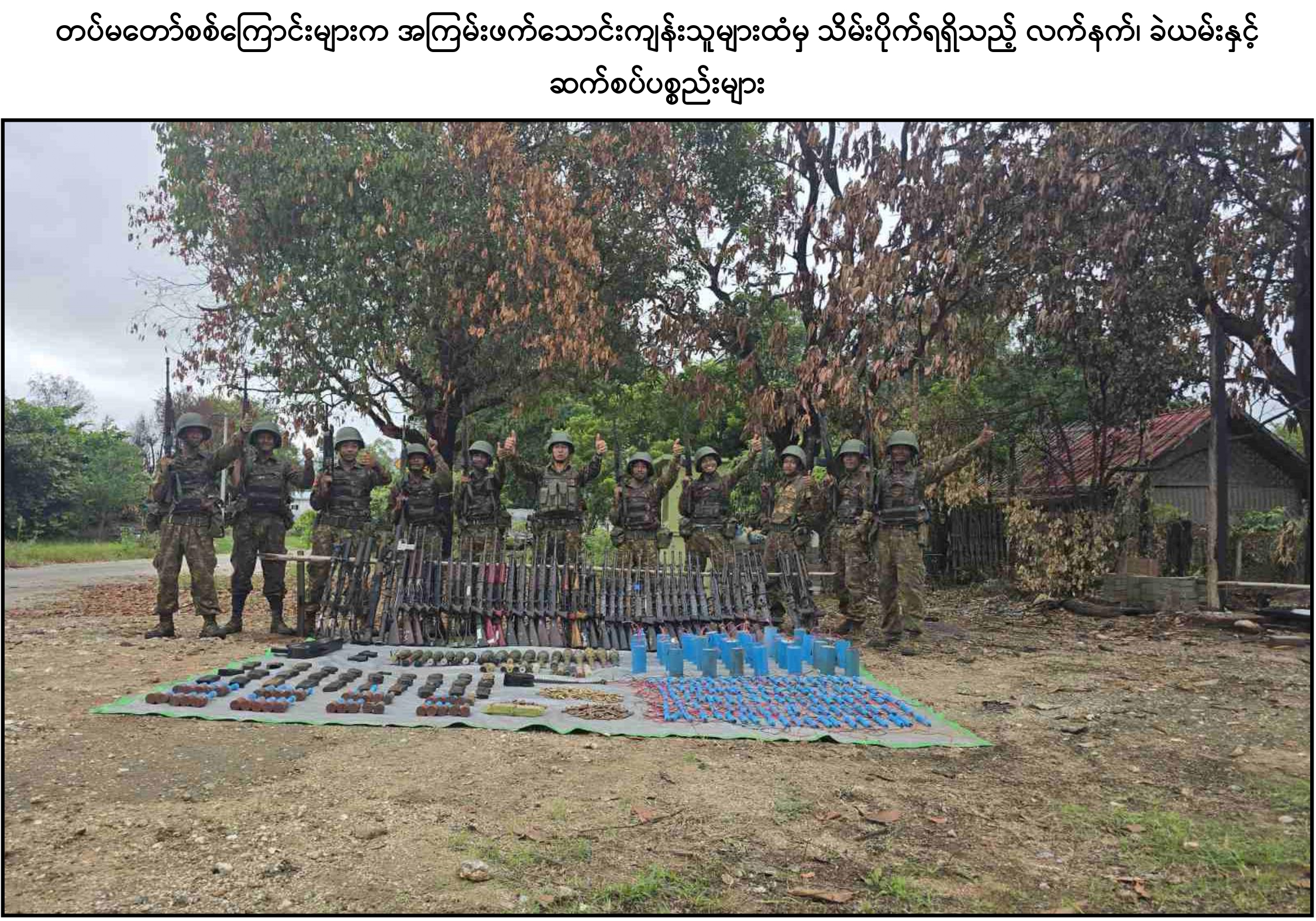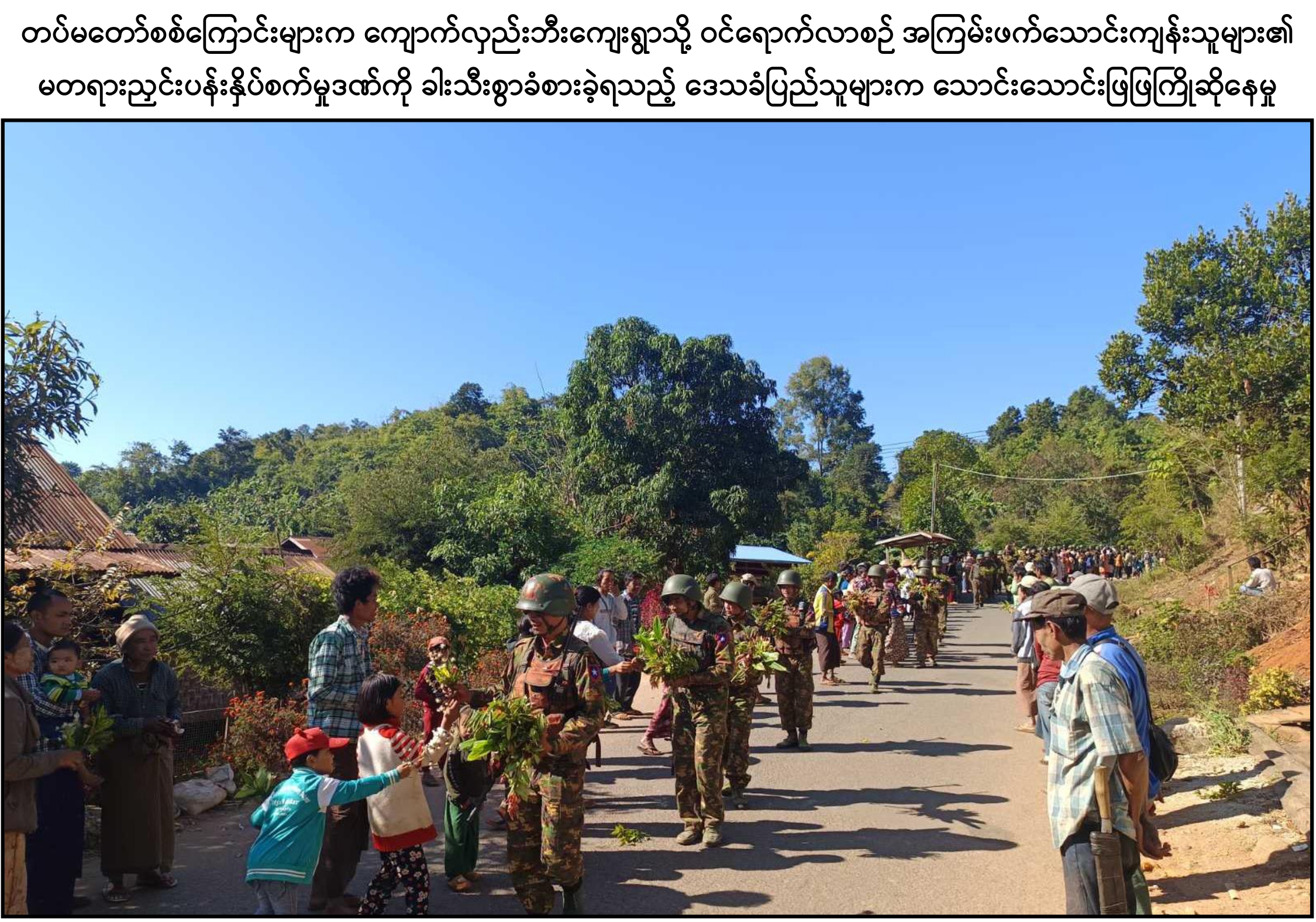 အကြမ်းဖက်သောင်းကျန်းသူများ ယာယီစိုးမိုးထားသည့် ညောင်ပင်သာကျေး ရွာ၊ ပိုးဇာနွယ်ကျေးရွာ၊ ကျောက်လှည်းဘီးကျေးရွာတို့ကို တပ်မတော်စစ်ကြောင်းများ က ပြန်လည်သိမ်းပိုက်ပြီး နယ်မြေရှင်းလင်းချီတက်စဉ် လမ်းကြောင်းတစ်လျှောက် တွင် အကြမ်းဖက်သောင်းကျန်းသူများ၏ မတရားနှိပ်စက်ညှင်းပန်းမှုဒဏ်ကို ခါးသီးစွာ ခံစားခဲ့ရသည့် ဒေသခံပြည်သူများသည် တပ်မတော်စစ်ကြောင်းများကို သက်ကြီး ရွယ်အိုများ၊ ကလေးသူငယ်များပါမကျန် ကျားမ၊ ကြီးငယ်မရွေး အောင်သပြေပန်းများ၊ ပန်းကုံးများ ကိုင်ဆောင်ကာ သောင်းသောင်းဖြဖြ ဝမ်းပန်းတသာကြိုဆိုခဲ့ကြသည်ကို ကြည်နူးဝမ်း မြောက်ဖွယ်တွေ့မြင်ခဲ့ရသည်။