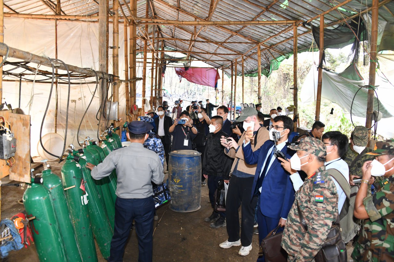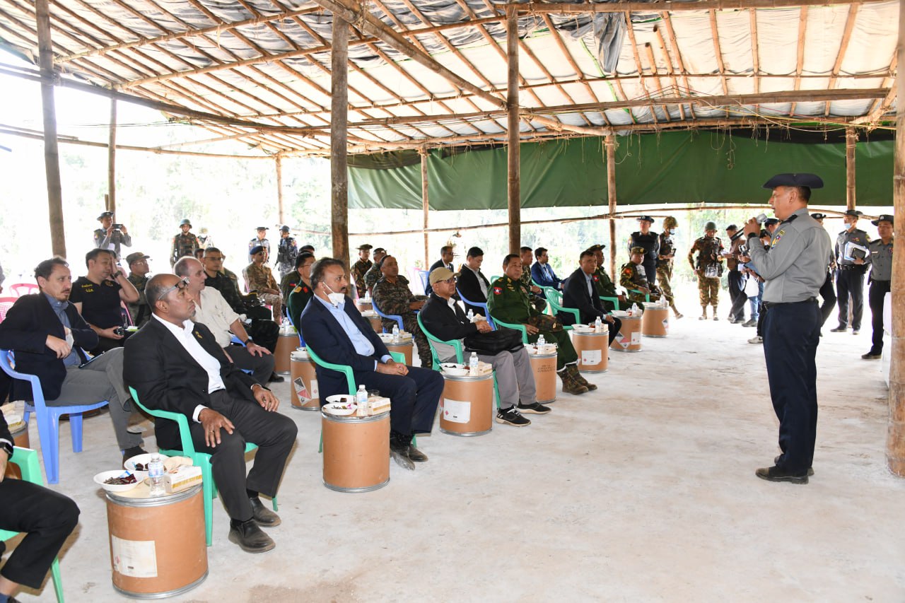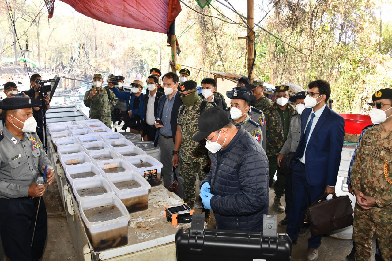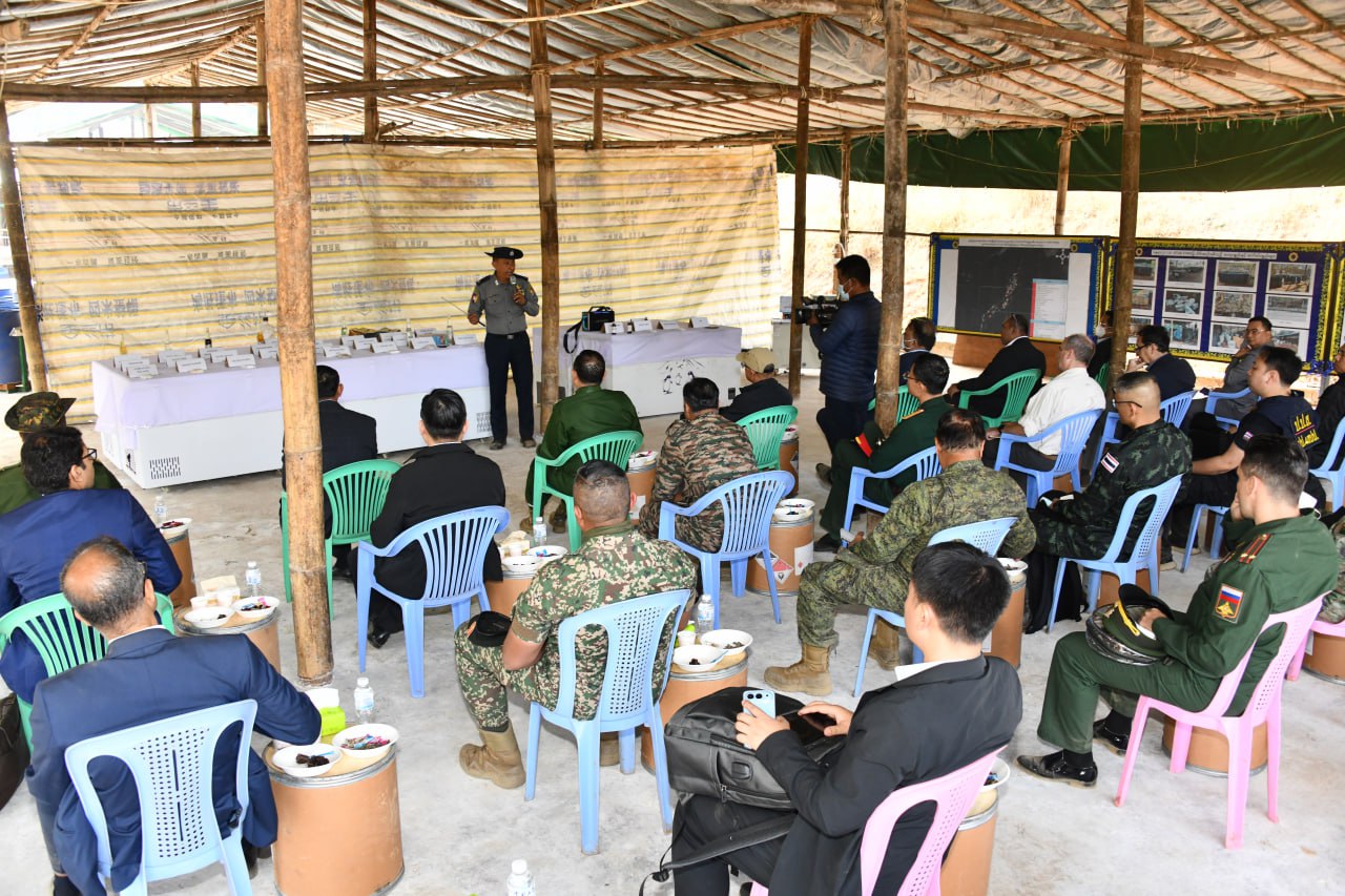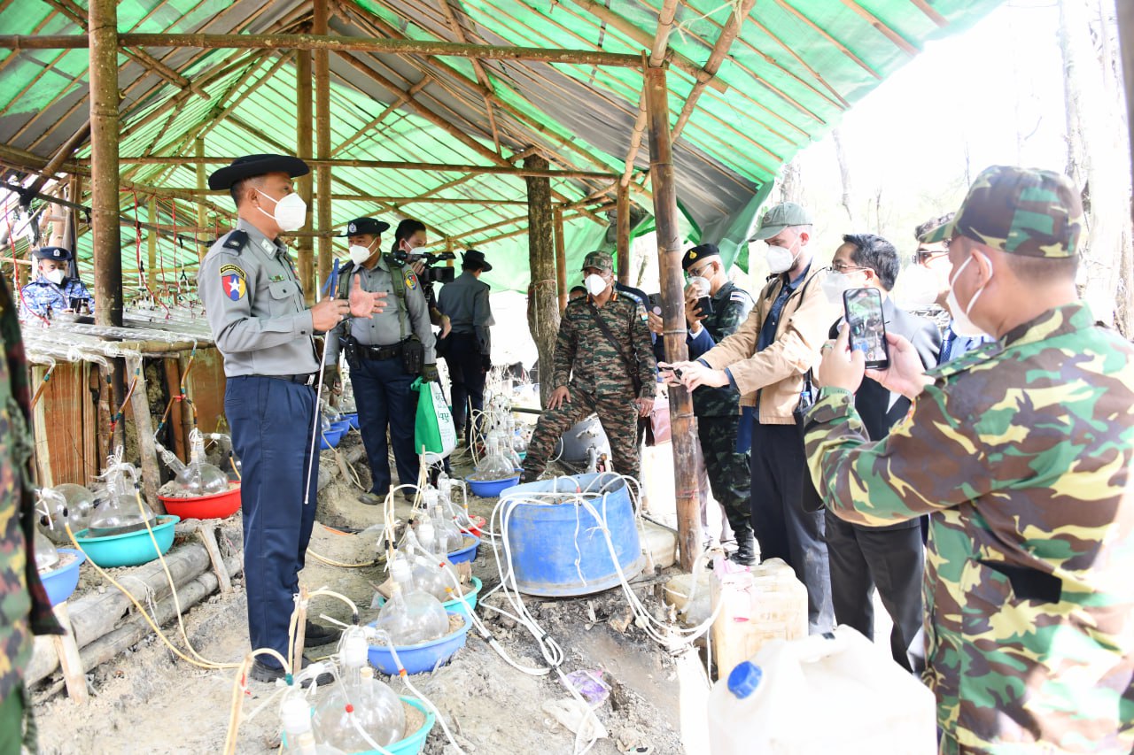 ဆက်လက်၍ ကော်မရှင်အဖွဲ့ဝင် ပြည်ထဲရေးဝန်ကြီးဌာန ပြည်ထောင်စုဝန်ကြီး၊ အမျိုး သား ကာကွယ်ရေးနှင့် လုံခြုံရေးကောင်စီ သတင်းထုတ်ပြန်ရေး အဖွဲ့ အဖွဲ့ခေါင်းဆောင် ပြန်ကြားရေးဝန်ကြီးဌာန ဒုတိယဝန်ကြီးနှင့် တာဝန်ရှိသူများ၊ သံတမန်များ၊ သတင်းမီဒီယာ အဖွဲ့များသည် ယင်းနေရာ၏ အနောက်တောင်ဘက် ၁၉ ကီလိုမီတာခန့်အကွာ၌ မူးယစ် ဆေးဝါးအဓိကချက်လုပ်သည့်နေရာသို့ ရောက်ရှိကြရာ ဆေးဝါးချက်လုပ်ရာ တွင်အသုံးပြု သော ဓာတုပစ္စည်းများ၊ ဆက်စပ်ပစ္စည်းများနှင့် ပတ်သက်၍ မြန်မာနိုင်ငံ၊ မူးယစ်ဆေးဝါး တားဆီးနှိမ်နင်းရေး ရဲတပ်ဖွဲ့ တပ်ဖွဲ့မှူး ရဲမှူးချုပ် သန့်လွင်မောင် နှင့် တာဝန်ရှိသူများက ရှင်းလင်းပြောကြားပြီး သိရှိလိုသည့်မေးမြန်းမှုများကို ပြန်လည်ဖြေ ကြားသည်။