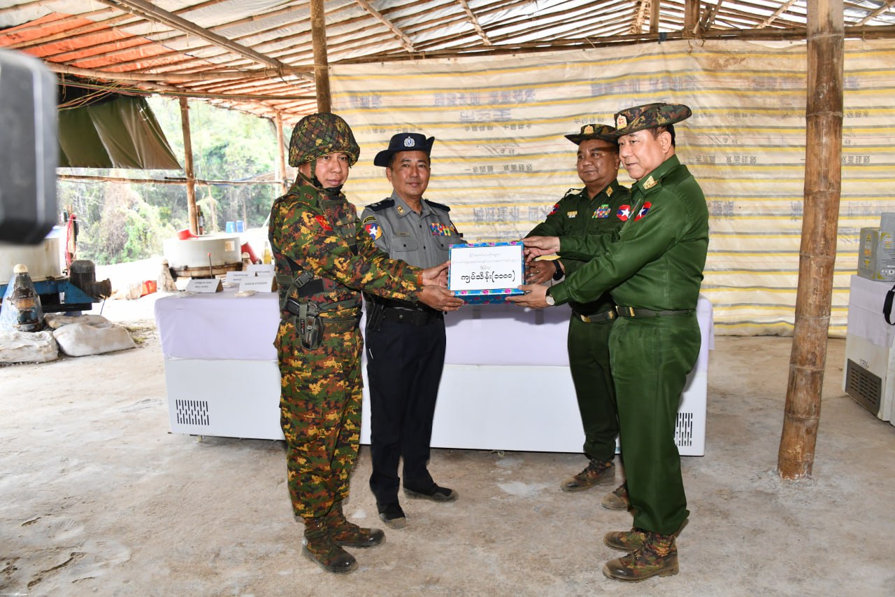 ယင်းနောက် လူသားမျိုးနွယ်ကို လူညွှန့်တုံးစေနိုင်သည့် မူးယစ်ဆေးဝါးများချက်လုပ်ခဲ့ သည့်နေရာများအား ဖမ်းဆီးရမိရေး အမျိုးသားရေးတာဝန်တစ်ရပ်အဖြစ် စွမ်းစွမ်းတမံ ဖော် ထုတ်ဖမ်းဆီးနိုင်ခဲ့သည့် တပ်မတော်သားများနှင့် မြန်မာနိုင်ငံရဲတပ်ဖွဲ့ဝင်များအား နိုင်ငံတော် ယာယီသမ္မတ နိုင်ငံတော်လုံခြုံရေးနှင့် အေးချမ်းသာယာရေး ကော်မရှင်ဥက္ကဋ္ဌ တပ်မတော် ကာကွယ်ရေးဦးစီးချုပ် ဗိုလ်ချုပ်မှူးကြီး မင်းအောင်လှိုင် က ပေးအပ်ချီးမြှင့်သည့် ငွေကျပ် သိန်း ၁၀၀၀ အား ယာယီသမ္မတနိုင်ငံတော်လုံခြုံရေးနှင့် အေးချမ်းသာယာရေးကော်မရှင်ဥက္ကဋ္ဌ တပ်မတော်ကာကွယ်ရေးဦးစီးချုပ်ကိုယ်စား ကော်မရှင်အဖွဲ့ဝင် ပြည်ထဲရေးဝန်ကြီးဌာန ပြည်ထောင်စုဝန်ကြီး ဒုတိယဗိုလ်ချုပ်ကြီး ထွန်းထွန်းနောင် နှင့် အမျိုးသားကာကွယ်ရေး နှင့်လုံခြုံရေးကောင်စီသတင်း ထုတ်ပြန်ရေးအဖွဲ့ အဖွဲ့ခေါင်းဆောင် ပြန်ကြားရေး ဝန်ကြီး ဌာန ဒုတိယဝန်ကြီး ဗိုလ်ချုပ် ဇော်မင်းထွန်းတို့က ပေးအပ်ရာ အရှေ့မြောက်တိုင်းစစ်ဌာနချုပ် တိုင်းမှူး ဗိုလ်မှူးချုပ် အေးမင်းဦး နှင့် ဒုရဲချုပ် ရဲဗိုလ်ချုပ် ဝင်းဗိုလ် တို့က လက်ခံ ရယူကြ သည်။