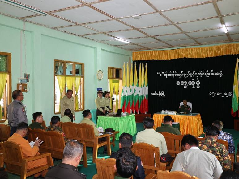 ရှမ်းပြည်နယ်(အရှေ့ပိုင်း) ၊ မက်မန်းမြို့နယ်အတွင်း၌ ပါတီစုံဒီမိုကရေစီ ထွေထွေရွေးကောက်ပွဲ အပိုင်း(၃)အောင်မြင်စွာကျင်းပနိုင်ရေးအတွက် ဌာနဆိုင်ရာ တာဝန်ရှိသူများနှင့် တွေ့ဆုံပွဲကို ယနေ့ညနေပိုင်းတွင် မက်မန်းမြို့နယ် အထွေထွေ အုပ်ချုပ်ရေးဦးစီးဌာန အစည်းအဝေးခန်းမ၌ ပြုလုပ်ရာ တြိဂံဒေသတိုင်းစစ်ဌာနချုပ် တိုင်းမှူး ဗိုလ်ချုပ် စိုးလှိုင်နှင့်အဖွဲ့ဝင်များ၊ ပြည်နယ်အစိုးရအုပ်ချုပ်ရေးအဖွဲ့ခွဲ (ရှမ်းအရှေ့) ဥက္ကဋ္ဌ၊ခရိုင်/မြို့နယ်ရွေးကောက်ပွဲကော်မရှင်အဖွဲ့ခွဲမှ တာဝန်ရှိသူများ၊ မက်မန်းခရိုင်/ မြို့နယ်ဌာနဆိုင်ရာ တာဝန်ရှိသူများ၊ ပြည်သူ့စစ်(ဌာနေ)အဖွဲ့ဝင်များ တက်ရောက်ကြသည်။