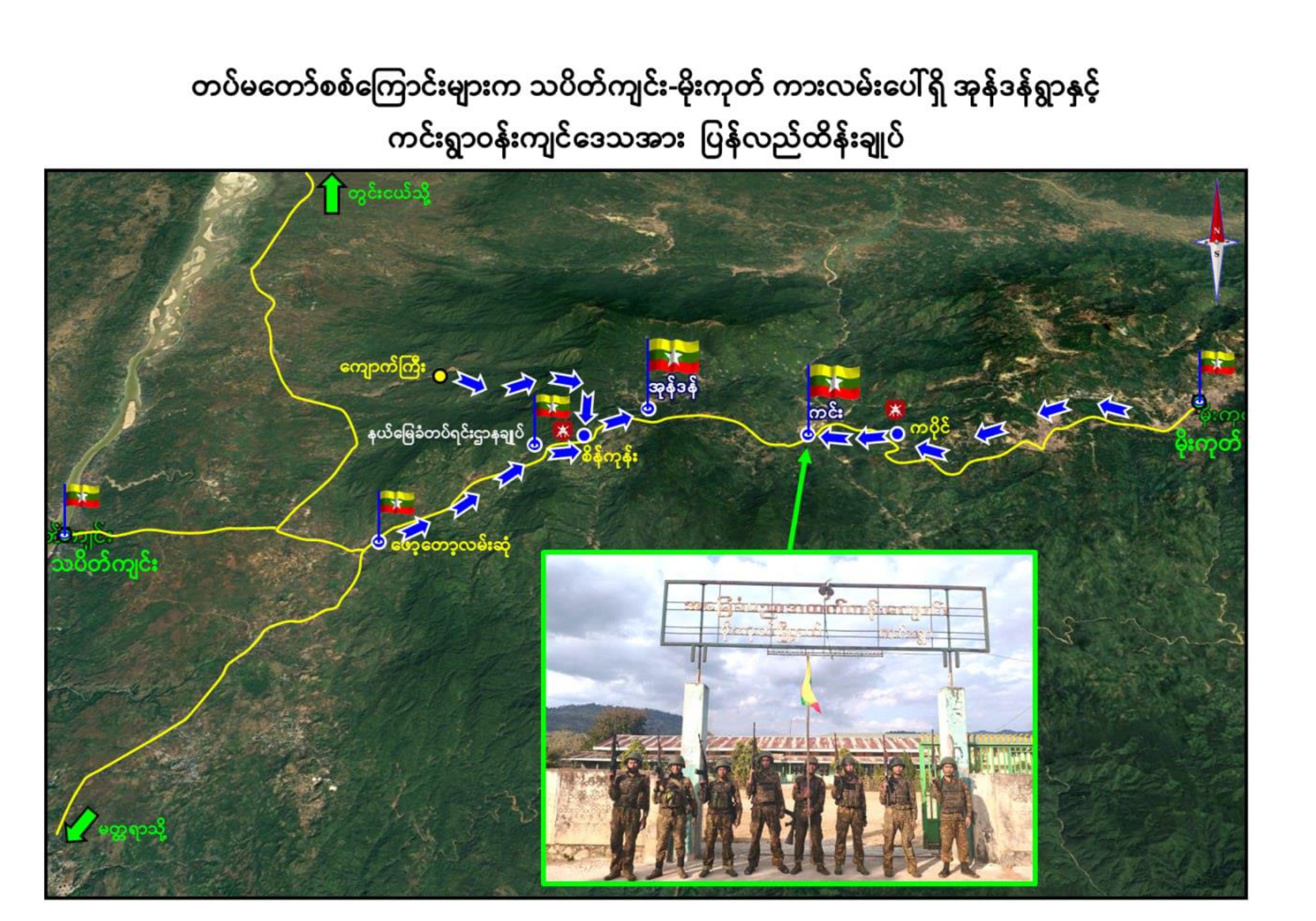 ဆက်လက်၍ တပ်မတော်စစ်ကြောင်းများအနေဖြင့် အဆိုပါ သပိတ်ကျင်း- မိုးကုတ် လမ်းကြောင်းပေါ်ရှိ စိန်ကုန်းကျေးရွာနှင့် မိုးကုတ်မြို့အကြား လမ်းပိုင်းတွင် ခိုအောင်းနေသည့် အကြမ်းဖက်သောင်းကျန်းသူများအား တိုက်ခိုက်ချေမှုန်းပြီး မိုးကုတ်-သပိတ်ကျင်း-မန္တလေးမြို့များသို့ဆက်သွယ်ထားသည့် လမ်းကြောင်းများအား အမြန်ဆုံး ပြန်လည်ဖွင့်လှစ်နိုင်ရေးအတွက် စစ်ကြောင်းများခွဲ၍ နယ်မြေလုံခြုံရေး လုပ်ငန်းများကို ဟန်ချက်ညီဆောင်ရွက်ခဲ့ရာ ယနေ့တွင် စိန်ကုန်းကျေးရွာဘက်မှ နယ်မြေရှင်းလင်းရေး လုပ်ငန်းများ ဆောင်ရွက်ပြီး ချီတက်လာသည့် တပ်မတော် စစ်ကြောင်းသည် အဆိုပါ လမ်းကြောင်းပေါ်ရှိ အုန်ဒန်ကျေးရွာအားလည်းကောင်း၊ မိုးကုတ်မြို့ဘက်မှ နယ်မြေ ရှင်းလင်းရေးလုပ်ငန်းများ ဆောင်ရွက်ပြီး ချီတက်လာသည့် တပ်မတော်စစ်ကြောင်း သည် မိုးကုတ်မြို့၏ အနောက်မြောက်ဘက် မီတာ ၁၀၀၀၀ ခန့်အကွာ အကြမ်းဖက် သောင်းကျန်းသူများ ယာယီစိုးမိုးထားသည့် ကင်းကျေးရွာ၊ ကင်းတံတားနှင့် အဆိုပါ ကျေးရွာအနီးရှိ ရန်သူ့စခန်းနေရာတို့အား အသီးသီး တိုက်ခိုက်ချေမှုန်း သိမ်းပိုက်နိုင်ခဲ့ သည်။