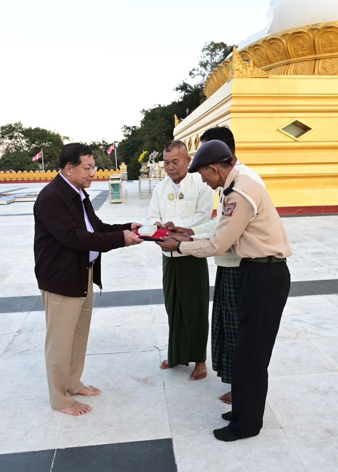 ယင်းနောက် နိုင်ငံတော်ယာယီသမ္မတ နိုင်ငံတော်လုံခြုံရေးနှင့် အေးချမ်းသာယာ ရေးကော်မရှင်ဥက္ကဋ္ဌက ဘုရားကြီးအတွက် ဘက်စုံအလှူတော်ငွေများကို ပေးအပ်လှူ ဒါန်းရာ ဂေါပကအဖွဲ့ဝင်များက လက်ခံရယူကြသည်။