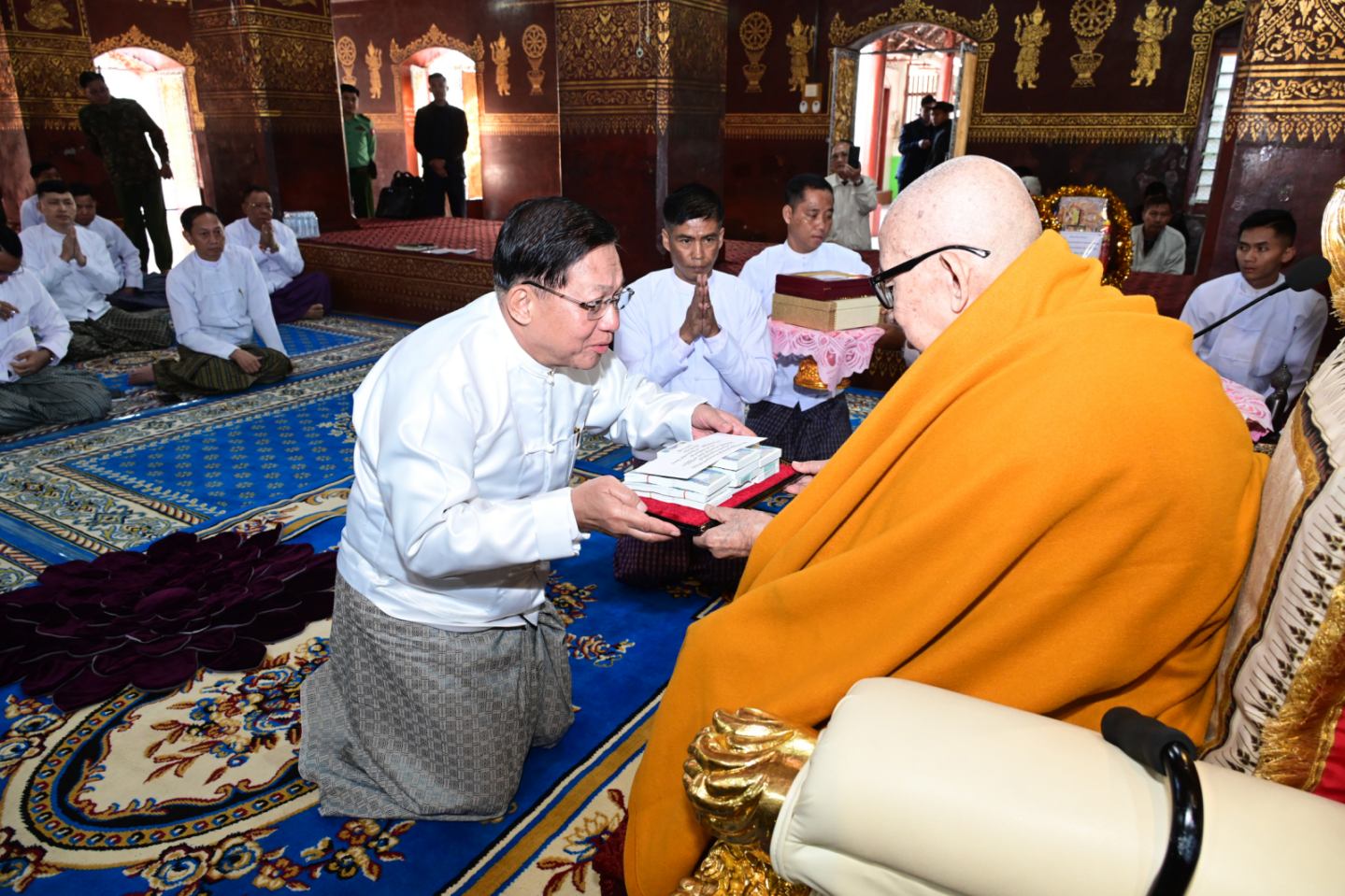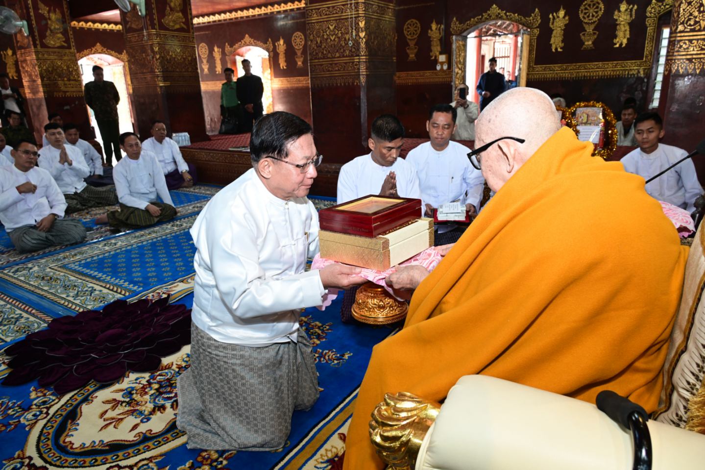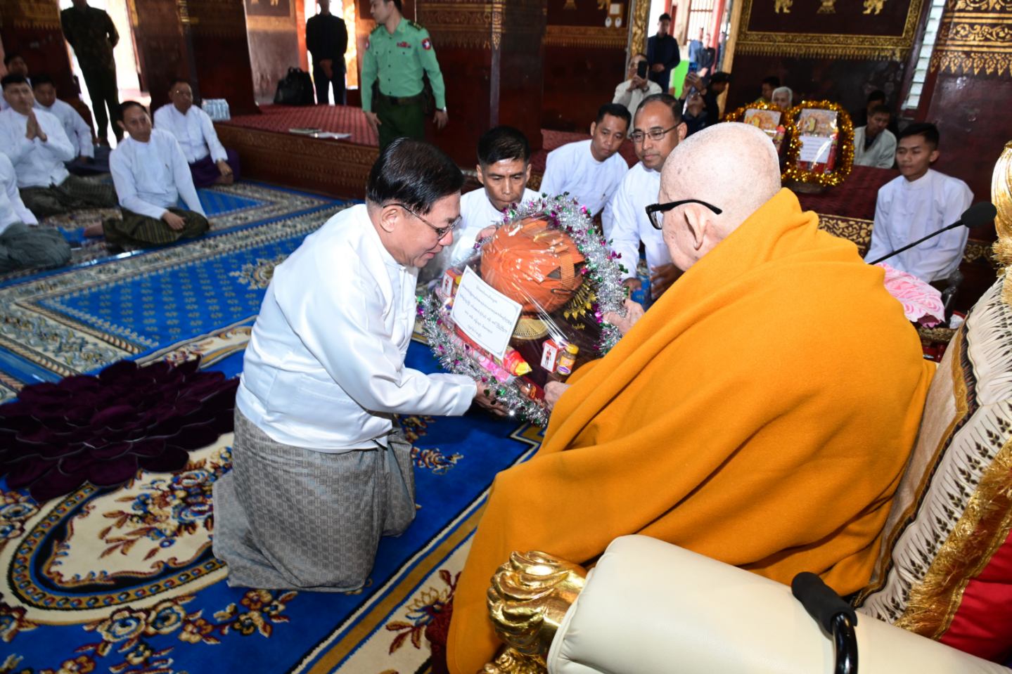 ယင်းနောက် နိုင်ငံတော်ယာယီသမ္မတ နိုင်ငံတော်လုံခြုံရေးနှင့် အေးချမ်းသာယာ ရေးကော်မရှင်ဥက္ကဋ္ဌ က ကျိုင်းယင်းကျောင်းတိုက် ဦးစီးပဓာနနာယက၊ အဂ္ဂမဟာ သဒ္ဓမ္မဇောတိကဓဇ ဘဒ္ဒန္တခေမာစာရ သက်တော်ရှည်မဟာထေရ်မြတ်ကြီးထံ “စည်သူ ဘွဲ့” တံဆိပ်တော်နှင့် အဆောင်အယောင်များ၊ လှူဖွယ်ပစ္စည်းများ၊ နဝကမ္မအလှူတော် ငွေများကို ဆက်ကပ်လှူဒါန်းသည်။ ၎င်းနောက် ဆရာတော်ကြီးက နိုင်ငံတော်ယာယီ သမ္မတနိုင်ငံတော်လုံခြုံရေးနှင့်အေးချမ်းသာယာရေးကော်မရှင်ဥက္ကဋ္ဌထံဓမ္မလက်ဆောင် ပြန်လည်ပေးအပ်သည်။