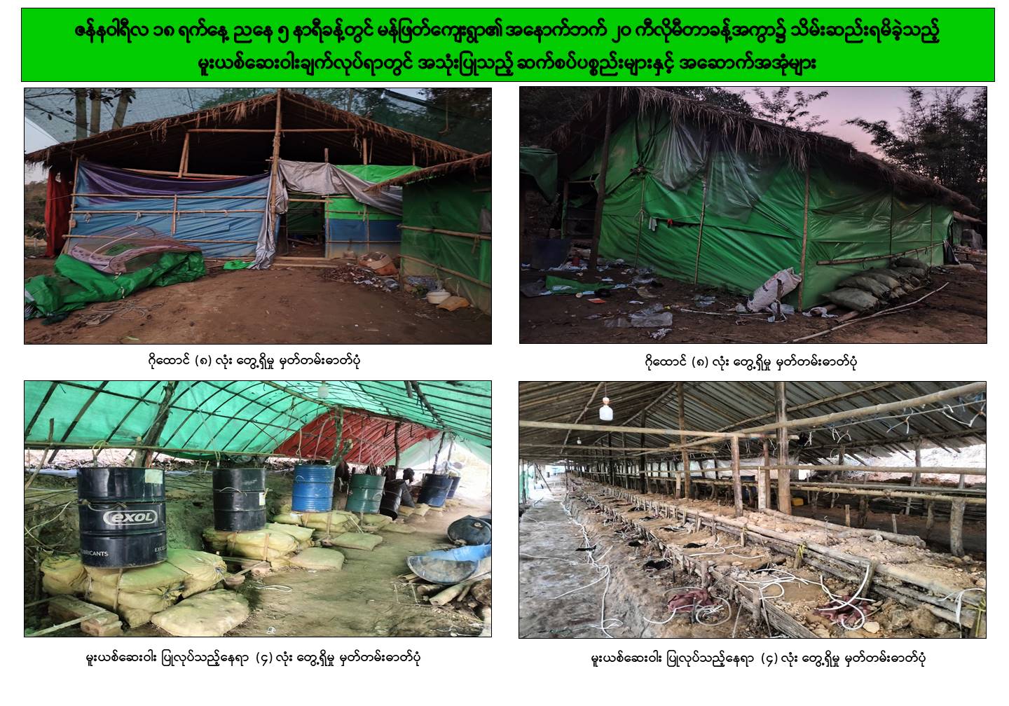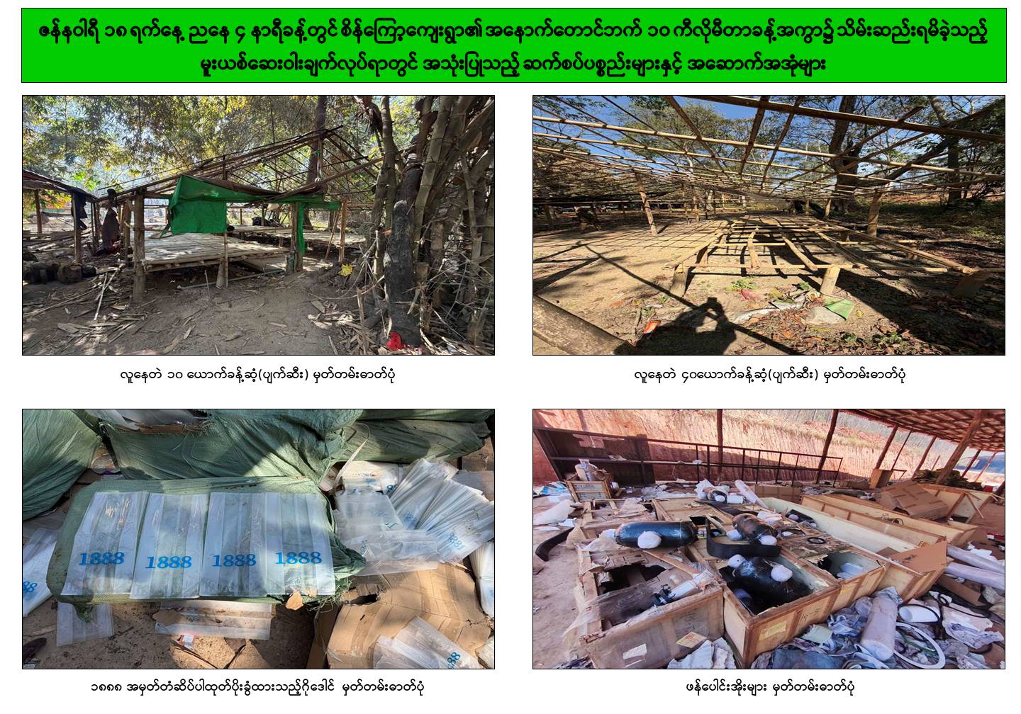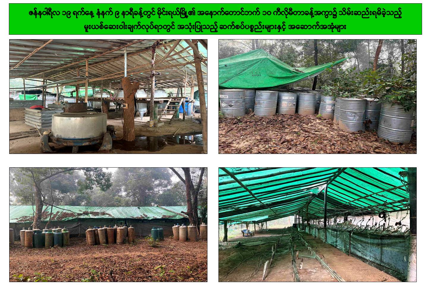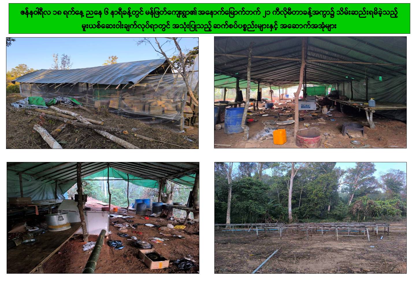 ဆက်လက်၍ လုံခြုံရေးတပ်ဖွဲ့ဝင်များပါဝင်သော ပူးပေါင်းအဖွဲ့များသည် အဆိုပါ ဒေသများအတွင်း မူးယစ်ဆေးဝါးချက်လုပ်နေမှုများအား အမြစ်ပြတ်ရှင်းလင်းနိုင်ရေး အတွက် ဒေသခံပြည်သူများ၏ သတင်းပေးပို့မှုများနှင့်အတူ လိုအပ်သည့် လေကြောင်း ကင်းထောက်ခြင်းနှင့် မြေပြင်သတင်းဖော်ထုတ်ခြင်းများ ပြုလုပ်၍ နယ်မြေရှင်းလင်းခြင်း များကို ဆက်လက် ဆောင်ရွက်ခဲ့ရာ ၂၀၂၆ ခုနှစ်၊ ဇန်နဝါရီ ၁၈ ရက် ညနေ ၄ နာရီခန့်တွင် စိန်ကြော့ကျေးရွာ၏ အနောက်တောင်ဘက် ၁၀ ကီလိုမီတာခန့်အကွာ၊ ဇန်နဝါရီ ၁၆ ရက် နေ့တွင် သိမ်းဆည်းရမိခဲ့သည့်နေရာ၏ အနောက်မြောက်ဘက် ၂ ကီလိုမီတာခန့်အကွာ၌ မူးယစ်ဆေးဝါးချက်လုပ်ရာတွင် အသုံးပြုသည့် အဆောက်အအုံများနှင့် ဆက်စပ်ပစ္စည်း များဖြစ်သော “၁၈၈၈” အမှတ်တံဆိပ်ပါ ထုတ်ပိုးခွံ ပစ္စည်းများထည့်ထားသည့် ဂိုဒေါင် ၃ လုံး၊ ဖန်ပေါင်းအိုး ၁၅ လုံး၊ အခြောက်ခံဗန်း ၂၄ ခုထားရှိသည့် တဲ ၁ လုံး၊ လူနေတဲ ၈ လုံး၊ အပေါင်းခံစက် ၇ လုံးထည့်ထားသည့် တဲ ၁ လုံး၊ (စိစစ်ဆဲ) ဓာတုပစ္စည်း ၅၀၀ အိတ် ထည့်ထားသည့် ဂိုဒေါင် ၁ လုံး၊ Caustic Soda ထည့်ထားသည့် ဆာလာအိတ် ၁၀၃ အိတ်နှင့် ဆိုဒီယန်ဆာလဖိတ် ထည့်ထားသည့် ဆာလာအိတ် ၂၀၀ အိတ် ထည့်ထားသည့် ဂိုဒေါင် ၁ လုံး၊ ကျောက်ချဉ်အိတ် ၁၈ အိတ်၊ မီးသွေးအမှုန့်အိတ် ၂၈ အိတ်၊ ဂတ်စ်အိုး ၄၆၉ လုံး၊ ရေခဲသေတ္တာ ၃ လုံး၊ စာချက်ဆောင် ၁ လုံး၊ လျှပ်စစ်မီးဖို ၉ လုံး၊ မူးယစ်ဆေးဝါး ချက်လုပ်ရာတွင် အသုံးပြုသည့်စက် ၂ လုံးတို့အား လည်းကောင်း။