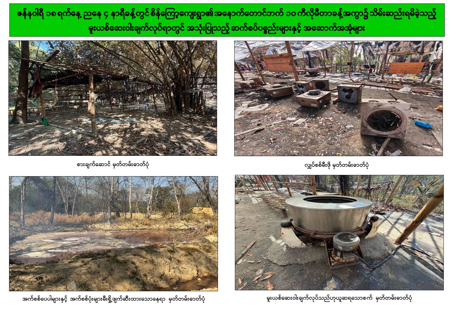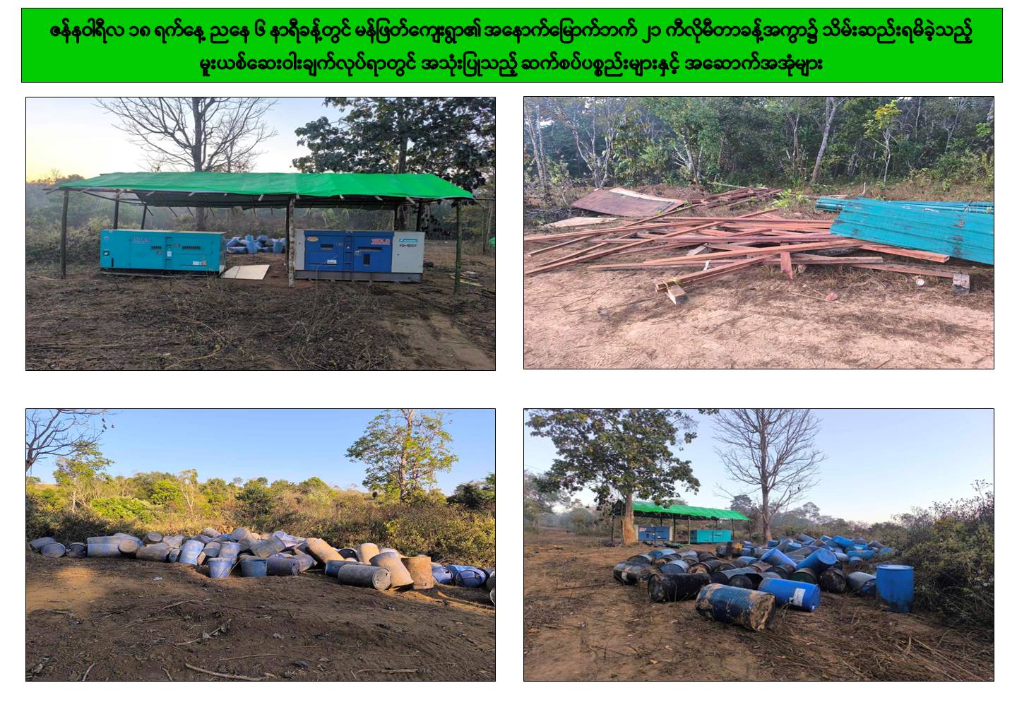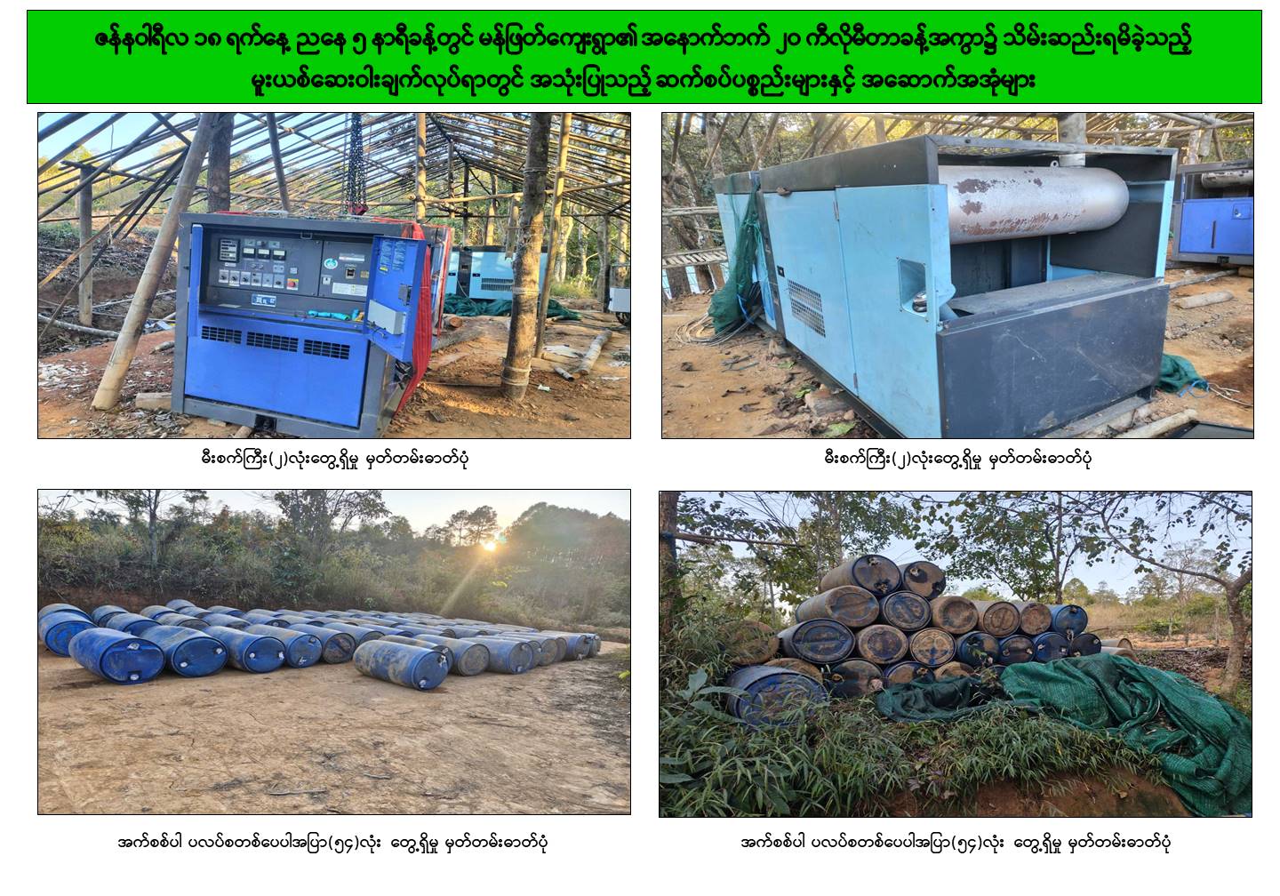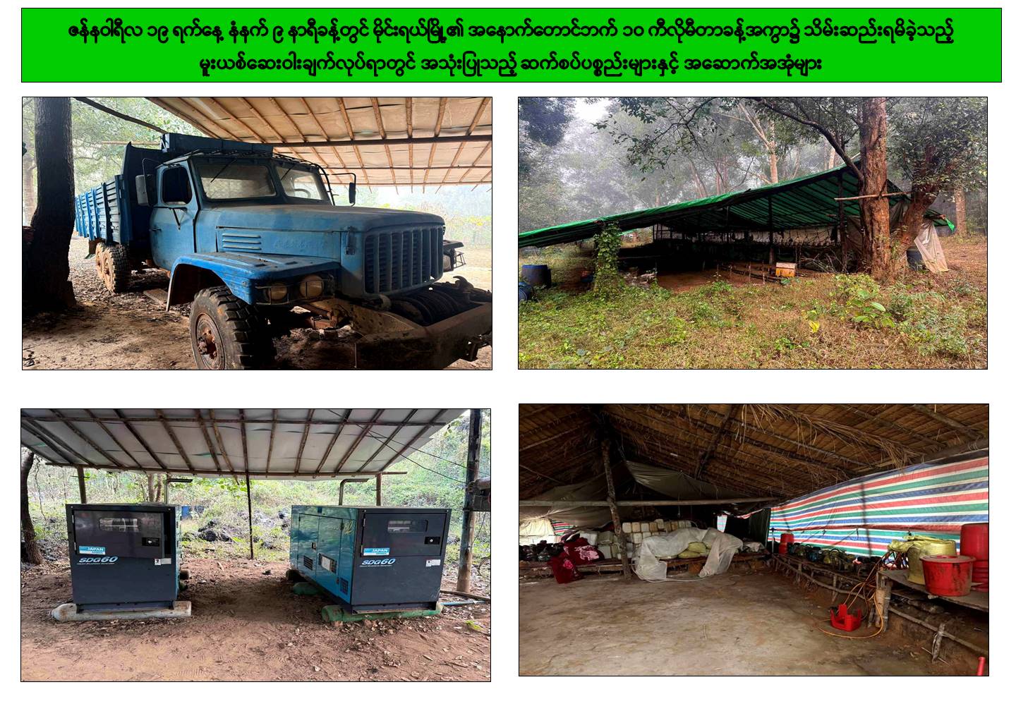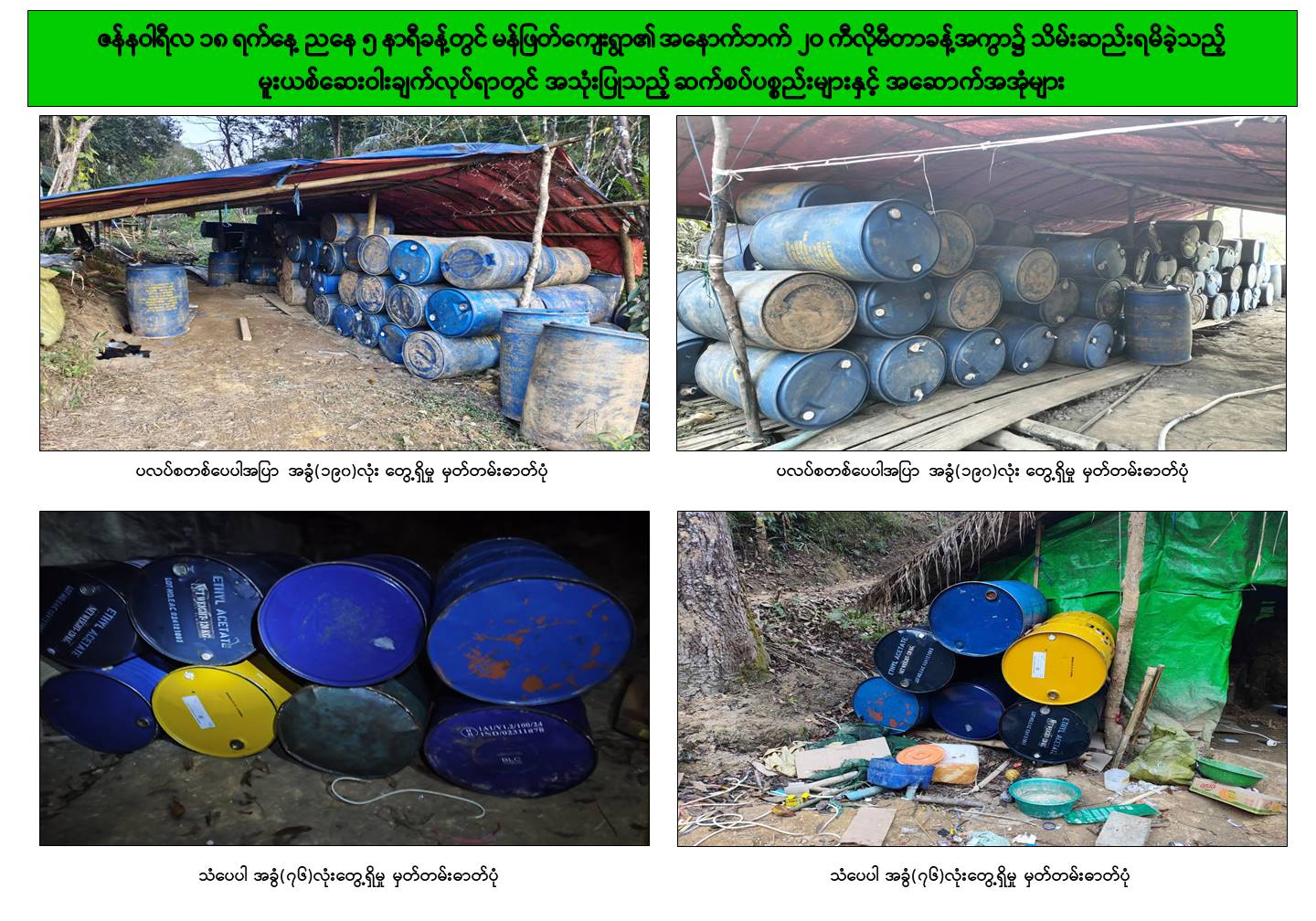 ဆက်လက်၍ လုံခြုံရေးတပ်ဖွဲ့ဝင်များပါဝင်သော ပူးပေါင်းအဖွဲ့များသည် အဆိုပါ ဒေသများအတွင်း မူးယစ်ဆေးဝါးချက်လုပ်နေမှုများအား အမြစ်ပြတ်ရှင်းလင်းနိုင်ရေး အတွက် ဒေသခံပြည်သူများ၏ သတင်းပေးပို့မှုများနှင့်အတူ လိုအပ်သည့် လေကြောင်း ကင်းထောက်ခြင်းနှင့် မြေပြင်သတင်းဖော်ထုတ်ခြင်းများ ပြုလုပ်၍ နယ်မြေရှင်းလင်းခြင်း များကို ဆက်လက် ဆောင်ရွက်ခဲ့ရာ ၂၀၂၆ ခုနှစ်၊ ဇန်နဝါရီ ၁၈ ရက် ညနေ ၄ နာရီခန့်တွင် စိန်ကြော့ကျေးရွာ၏ အနောက်တောင်ဘက် ၁၀ ကီလိုမီတာခန့်အကွာ၊ ဇန်နဝါရီ ၁၆ ရက် နေ့တွင် သိမ်းဆည်းရမိခဲ့သည့်နေရာ၏ အနောက်မြောက်ဘက် ၂ ကီလိုမီတာခန့်အကွာ၌ မူးယစ်ဆေးဝါးချက်လုပ်ရာတွင် အသုံးပြုသည့် အဆောက်အအုံများနှင့် ဆက်စပ်ပစ္စည်း များဖြစ်သော “၁၈၈၈” အမှတ်တံဆိပ်ပါ ထုတ်ပိုးခွံ ပစ္စည်းများထည့်ထားသည့် ဂိုဒေါင် ၃ လုံး၊ ဖန်ပေါင်းအိုး ၁၅ လုံး၊ အခြောက်ခံဗန်း ၂၄ ခုထားရှိသည့် တဲ ၁ လုံး၊ လူနေတဲ ၈ လုံး၊ အပေါင်းခံစက် ၇ လုံးထည့်ထားသည့် တဲ ၁ လုံး၊ (စိစစ်ဆဲ) ဓာတုပစ္စည်း ၅၀၀ အိတ် ထည့်ထားသည့် ဂိုဒေါင် ၁ လုံး၊ Caustic Soda ထည့်ထားသည့် ဆာလာအိတ် ၁၀၃ အိတ်နှင့် ဆိုဒီယန်ဆာလဖိတ် ထည့်ထားသည့် ဆာလာအိတ် ၂၀၀ အိတ် ထည့်ထားသည့် ဂိုဒေါင် ၁ လုံး၊ ကျောက်ချဉ်အိတ် ၁၈ အိတ်၊ မီးသွေးအမှုန့်အိတ် ၂၈ အိတ်၊ ဂတ်စ်အိုး ၄၆၉ လုံး၊ ရေခဲသေတ္တာ ၃ လုံး၊ စာချက်ဆောင် ၁ လုံး၊ လျှပ်စစ်မီးဖို ၉ လုံး၊ မူးယစ်ဆေးဝါး ချက်လုပ်ရာတွင် အသုံးပြုသည့်စက် ၂ လုံးတို့အား လည်းကောင်း။