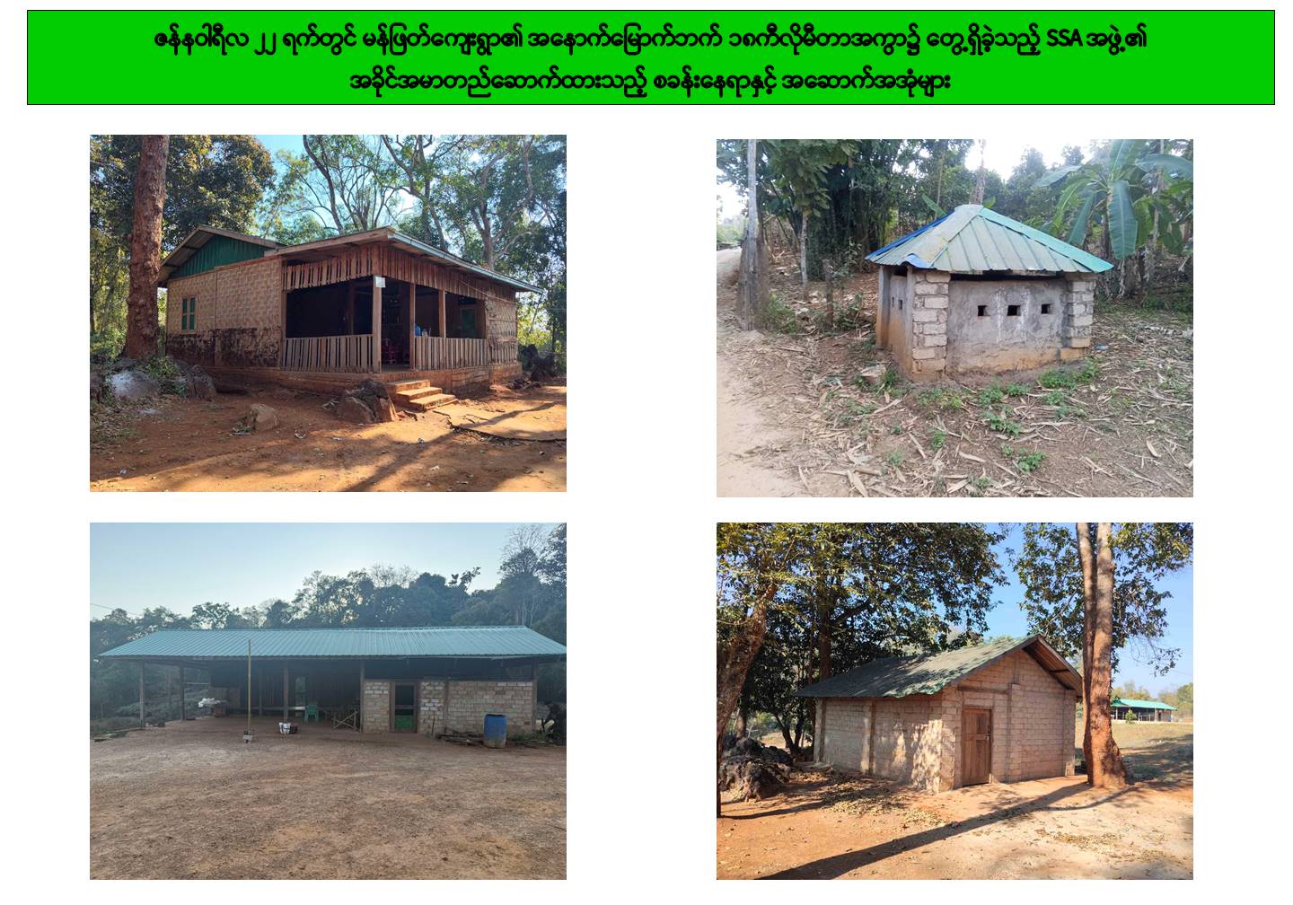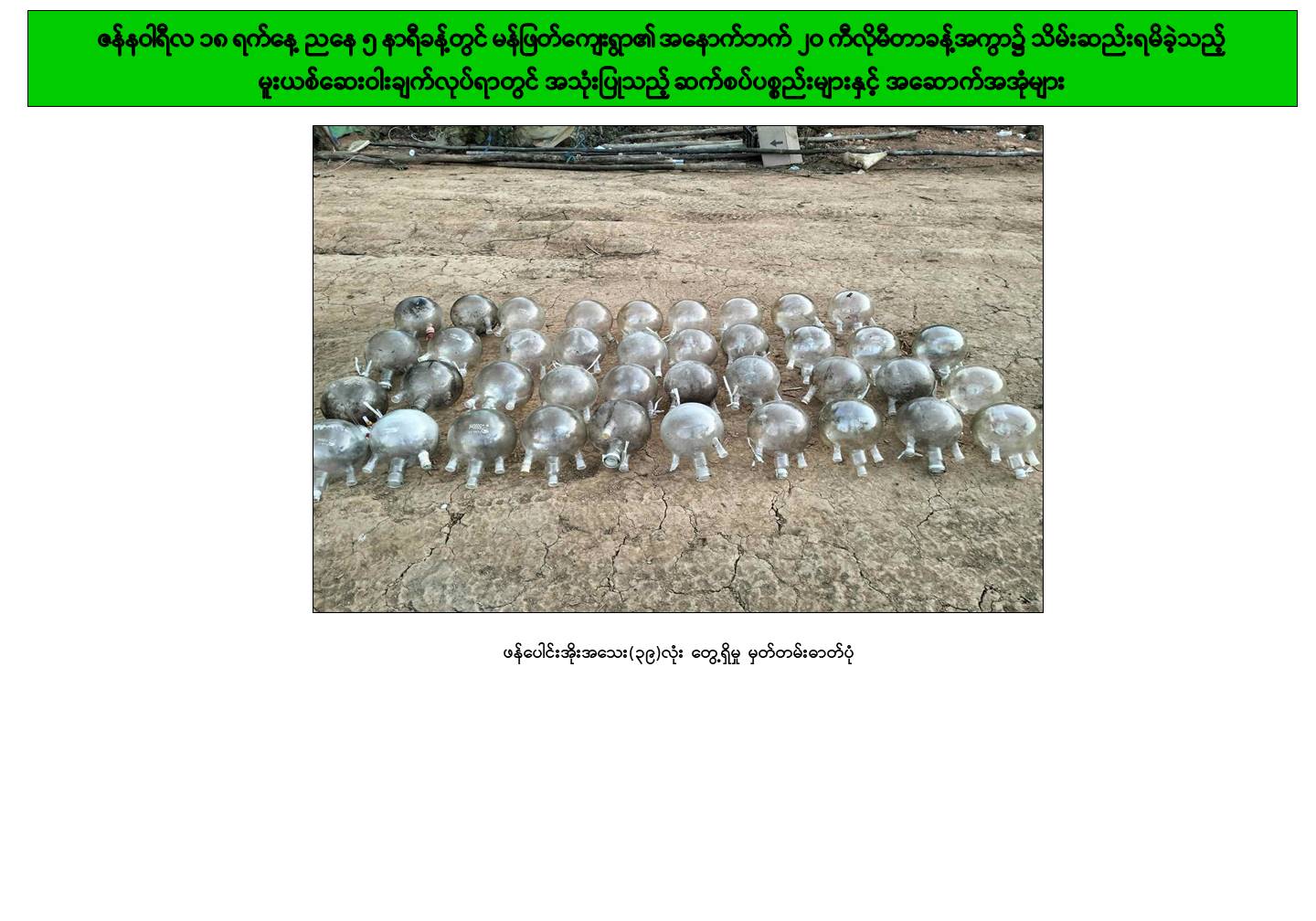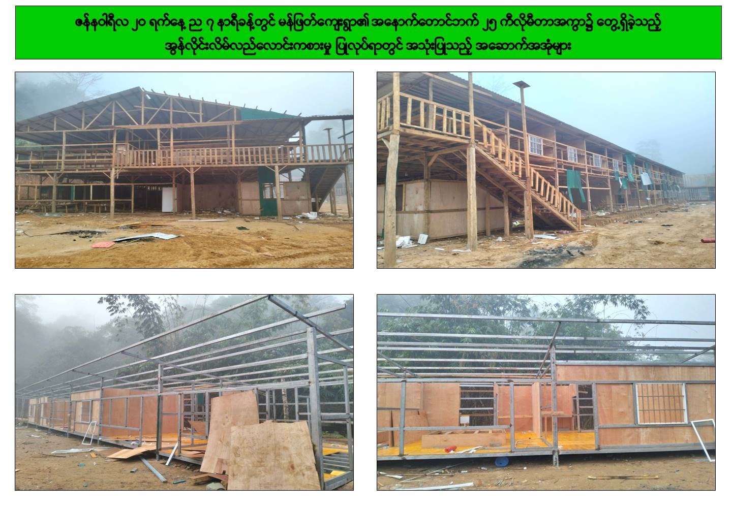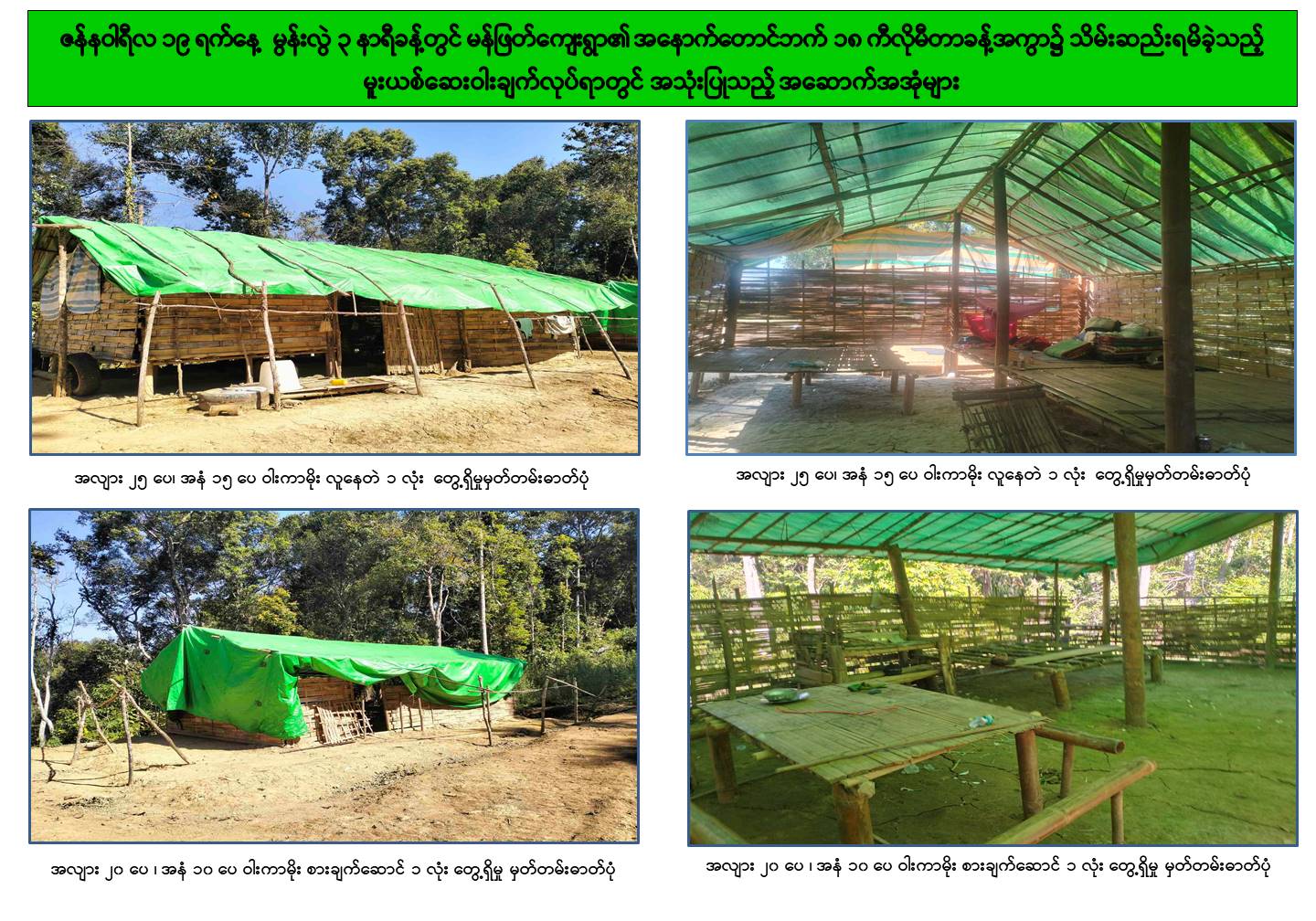 ဆက်လက်၍ လုံခြုံရေးတပ်ဖွဲ့ဝင်များပါဝင်သော ပူးပေါင်းအဖွဲ့များသည် အဆိုပါ ဒေသများအတွင်း မူးယစ်ဆေးဝါးချက်လုပ်နေမှုများအား အမြစ်ပြတ်ရှင်းလင်းနိုင်ရေး အတွက် ဒေသခံပြည်သူများ၏ သတင်းပေးပို့မှုများနှင့်အတူ လိုအပ်သည့် လေကြောင်း ကင်းထောက်ခြင်းနှင့် မြေပြင်သတင်းဖော်ထုတ်ခြင်းများ ပြုလုပ်၍ နယ်မြေရှင်းလင်းခြင်း များကို ဆက်လက် ဆောင်ရွက်ခဲ့ရာ ၂၀၂၆ ခုနှစ်၊ ဇန်နဝါရီ ၁၈ ရက် ညနေ ၄ နာရီခန့်တွင် စိန်ကြော့ကျေးရွာ၏ အနောက်တောင်ဘက် ၁၀ ကီလိုမီတာခန့်အကွာ၊ ဇန်နဝါရီ ၁၆ ရက် နေ့တွင် သိမ်းဆည်းရမိခဲ့သည့်နေရာ၏ အနောက်မြောက်ဘက် ၂ ကီလိုမီတာခန့်အကွာ၌ မူးယစ်ဆေးဝါးချက်လုပ်ရာတွင် အသုံးပြုသည့် အဆောက်အအုံများနှင့် ဆက်စပ်ပစ္စည်း များဖြစ်သော “၁၈၈၈” အမှတ်တံဆိပ်ပါ ထုတ်ပိုးခွံ ပစ္စည်းများထည့်ထားသည့် ဂိုဒေါင် ၃ လုံး၊ ဖန်ပေါင်းအိုး ၁၅ လုံး၊ အခြောက်ခံဗန်း ၂၄ ခုထားရှိသည့် တဲ ၁ လုံး၊ လူနေတဲ ၈ လုံး၊ အပေါင်းခံစက် ၇ လုံးထည့်ထားသည့် တဲ ၁ လုံး၊ (စိစစ်ဆဲ) ဓာတုပစ္စည်း ၅၀၀ အိတ် ထည့်ထားသည့် ဂိုဒေါင် ၁ လုံး၊ Caustic Soda ထည့်ထားသည့် ဆာလာအိတ် ၁၀၃ အိတ်နှင့် ဆိုဒီယန်ဆာလဖိတ် ထည့်ထားသည့် ဆာလာအိတ် ၂၀၀ အိတ် ထည့်ထားသည့် ဂိုဒေါင် ၁ လုံး၊ ကျောက်ချဉ်အိတ် ၁၈ အိတ်၊ မီးသွေးအမှုန့်အိတ် ၂၈ အိတ်၊ ဂတ်စ်အိုး ၄၆၉ လုံး၊ ရေခဲသေတ္တာ ၃ လုံး၊ စာချက်ဆောင် ၁ လုံး၊ လျှပ်စစ်မီးဖို ၉ လုံး၊ မူးယစ်ဆေးဝါး ချက်လုပ်ရာတွင် အသုံးပြုသည့်စက် ၂ လုံးတို့အား လည်းကောင်း။