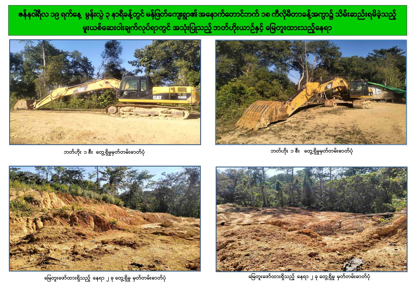 ဇန်နဝါရီ ၁၉ ရက် နံနက် ၉ နာရီခန့်တွင် မိုင်းရယ်မြို့၏ အနောက်တောင်ဘက် ၁၀ ကီလိုမီတာခန့်အကွာ၊ ဇန်နဝါရီ ၁၆ ရက်တွင် သိမ်းဆည်းရမိခဲ့သည့်နေရာ၏ အရှေ့မြောက်ဘက် ၉ ကီလိုမီတာခန့်အကွာ၌ မူးယစ်ဆေးဝါးချက်လုပ်ရာတွင် အသုံးပြု သည့် တဲ ၅ လုံး၊ ဂိုဒေါင် ၅ လုံး၊ လူနေတဲ ၈ လုံး၊ ၆ ပေကွိုင်လာ ၅ လုံး၊ ၅ ပေကွိုင်လာ ၅ လုံး၊ စတီးမွှေစက် ၄ လုံး၊ စတီးဗန်း ၆၀ ချပ်၊ မူးယစ်ဆေးဝါးချက်ဖန်ပြွန် ၁၂၀ ခု၊ ဆေးပြားရိုက်စက် ၄ လုံး၊ ဂတ်စ်အိုးအခွံ ၁၂၀ လုံး၊ ပေပါအပြာအခွံ ၂၅၀ လုံး၊ သံပေပါအခွံ ၅၀ လုံး၊ မီးစက်ကြီး ၂ လုံး၊ ၆ ဘီးကားအပြာ ၂ စီးတို့အား လည်းကောင်း၊ ညနေ ၃ နာရီခန့်တွင် မန်ဖြတ်ကျေးရွာ၏ အနောက်တောင်ဘက် ၁၈ ကီလိုမီတာခန့်အကွာ၊ ဇန်နဝါရီ ၁၈ ရက်နေ့တွင် သိမ်းဆည်းရမိခဲ့သည့်နေရာ၏ အရှေ့တောင်ဘက် ၄ ကီလိုမီတာခန့်အကွာ၌ မူးယစ်ဆေးဝါးချက်လုပ်ရာတွင် အသုံးပြုသည့် အလျား ၂၅ ပေ အနံ ၁၅ ပေရှိ မိုးကာလူနေတဲ ၁ လုံး၊ အလျား ၂၀ ပေ အနံ ၁၀ ပေရှိ မိုးကာစားချက် ဆောင် ၁ လုံး၊ ဘတ်ဟိုးယာဉ် ၁ စီးနှင့် ဆက်စပ်ပစ္စည်းများတို့အား လည်းကောင်း။