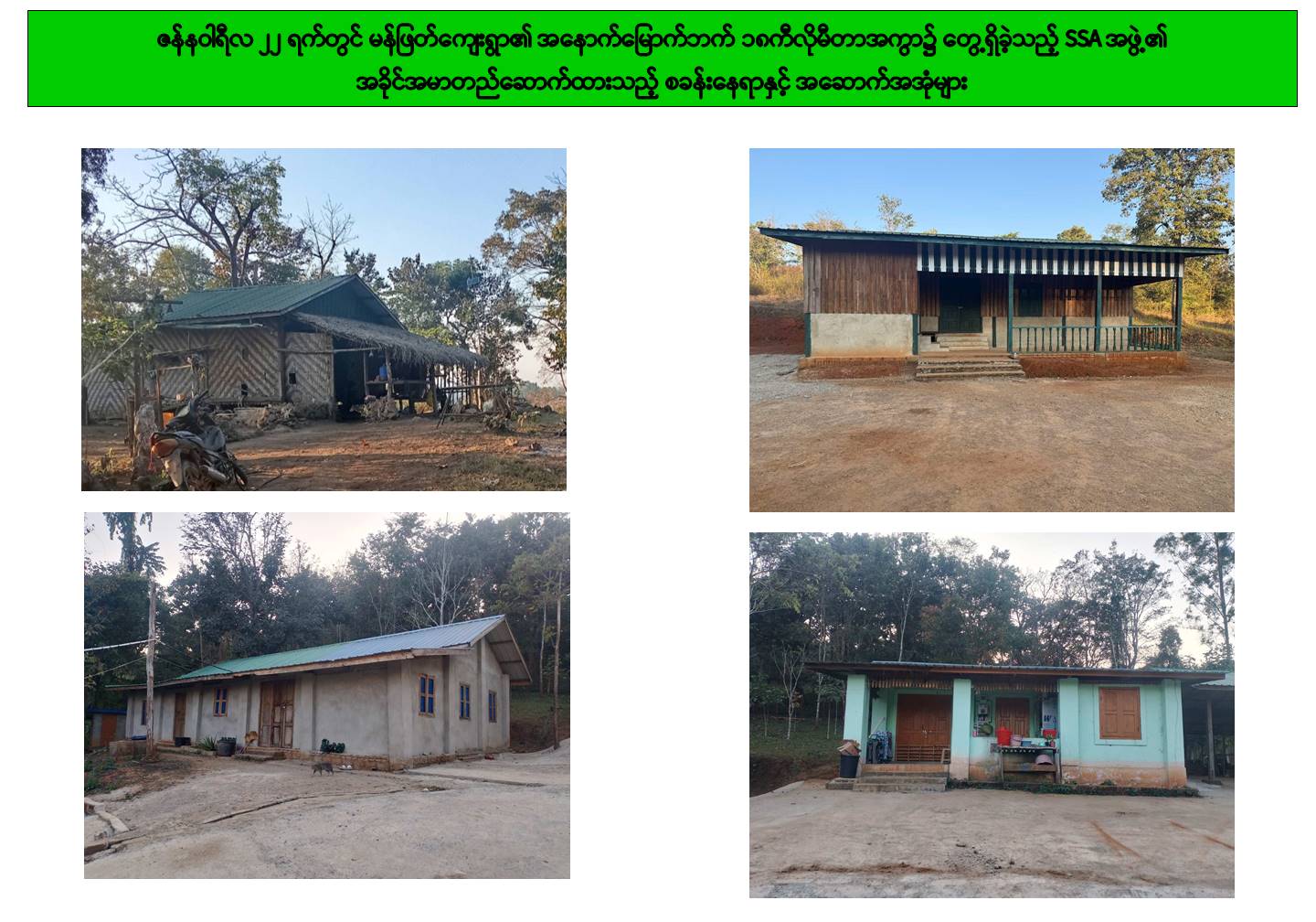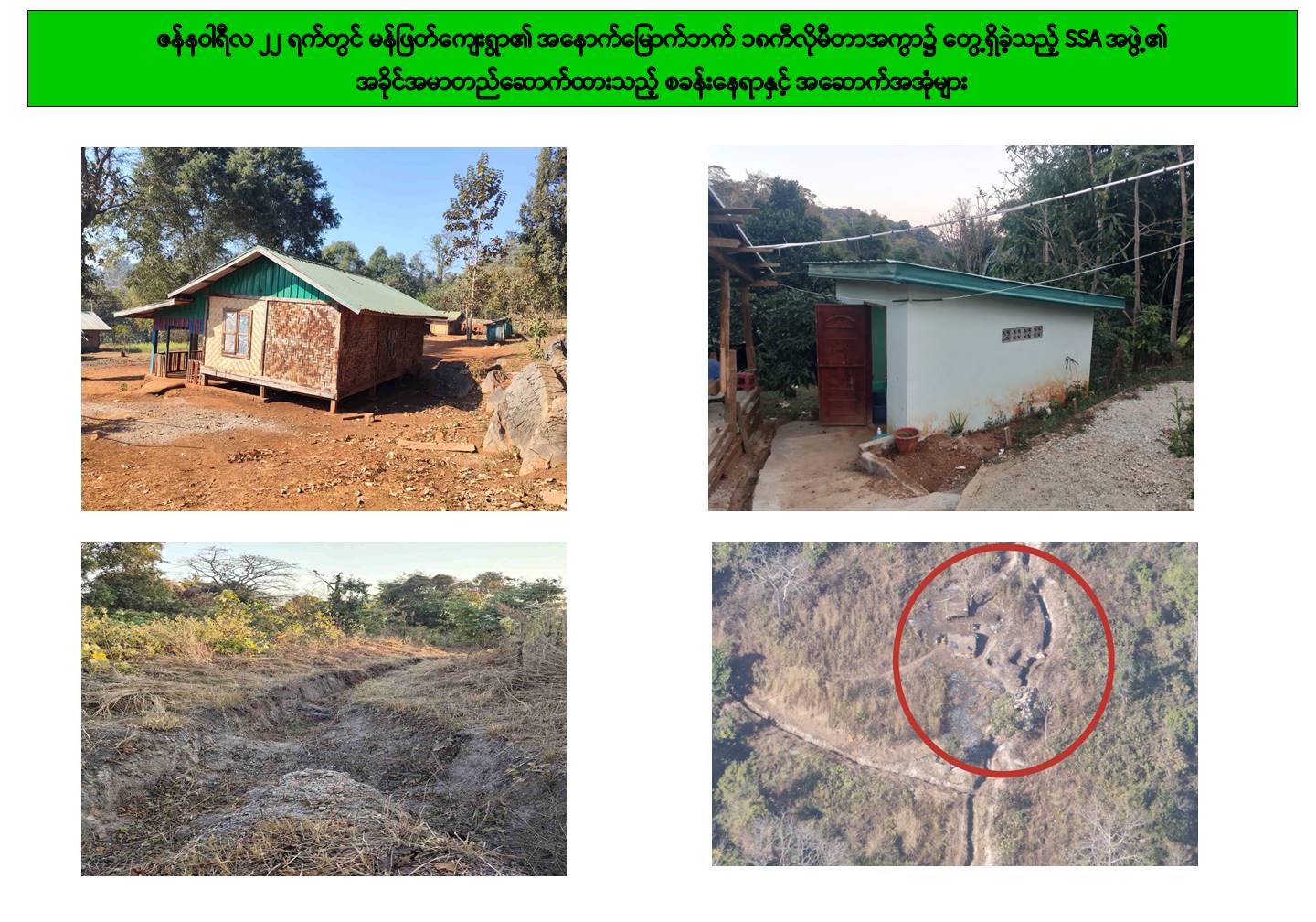 ဆက်လက်၍ လုံခြုံရေးတပ်ဖွဲ့ဝင်များက ဇန်နဝါရီ ၂၂ ရက် ယနေ့နံနက်ပိုင်းတွင် နယ်မြေရှင်းလင်းခြင်းများ ဆောင်ရွက်ခဲ့ရာ မန်ဖြတ်ကျေးရွာ၏ အနောက်မြောက်ဘက် ၁၈ ကီလိုမီတာခန့်အကွာ၊ ဇန်နဝါရီ ၁၆ ရက်နေ့တွင် သိမ်းဆည်းရမိခဲ့သည့် နေရာ၏ အနောက်တောင်ဘက် ၄ ကီလိုမီတာခန့်အကွာသို့ အရောက်၌ SSA အဖွဲ့များနေထိုင် သည့် အလျား ၄၀ ပေ အနံ ၂၀ ပေရှိ သွပ်မိုးအုတ်ကာ လူနေအဆောက်အအုံ ၁ လုံး၊ အလျား ၄၀ အနံ ၂၅ ပေရှိ သွပ်မိုးအုတ်ကာ စားချက်ဆောင် ၁ လုံး၊ အလျား ၂၀ ပေ အနံ ၂၀ ပေရှိ သွပ်မိုးဝါးကာ လူနေတဲ ၁ လုံး၊ အလျား ၂၀ ပေ အနံ ၁၅ ပေရှိ သွပ်မိုးအုတ်ကာ လူနေတဲ ၁ လုံး၊ အလျား ၁၀ ပေ အနံ ၁၀ ပေရှိ သွပ်မိုးအုတ်ကာလူနေတဲ ၁ လုံး၊ အလျား ၂၀ ပေ အနံ ၂၀ ပေရှိ သွပ်မိုးအုတ်ကာ လူနေတဲ ၁ လုံး၊ အလျား ၁၀ ပေ အနံ ၁၀ ပေရှိ သွပ်မိုးထရံကာ လူနေတဲ ၁ လုံး၊ မြေစိုက်သစ်လုံးဘန်ကာ ၂ လုံး၊ အကျယ် ၃ ပေ အနက် ၃ ပေ ၊ အရှည် ၃၀၀ ပေရှိ ဆက်သွယ်ရေးမြောင်း ၊ ထရံမိုး ၂ ယောက်အိပ်တဲ ၂ လုံး၊ ထရံမိုး ၅ ယောက်အိပ်တဲ ၁ လုံး၊ အလျား ၂၄ ပေ အနံ ၁၂ ပေရှိ သွပ်မိုးအုတ်ကာအဆောက်အုံ ၁ လုံး၊ အလျား ၁၅ ပေ အနံ ၁၂ ပေရှိ သွပ်မိုးအုတ်ကာအဆောက်အအုံ ၁ လုံး၊ အလျား ၂၄ ပေ အနံ ၂၄ ပေရှိ သွပ်မိုးပျဉ်ကာ ၂ ထပ် အဆောက်အအုံ ၁ လုံး၊ အလျား ၃၀ ပေ အနံ ၂၀ ပေရှိ သွပ်မိုးအုတ်ကာ အဆောက်အအုံ ၁ လုံး၊ အလျား ၂၀ ပေ အနံ ၂၀ ပေရှိ သွပ်မိုး အုတ်ကာ အဆောက်အအုံ ၁ လုံး၊ အလျား ၂၄ ပေ အနံ ၁၅ ပေရှိ သွပ်မိုးအုတ် (ကားဂိုဒေါင်ပါ) အဆောက်အအုံ ၁ လုံး၊ အလျား ၁၂ ပေ အနံ ၈ ပေရှိ သွပ်မိုးအုတ်ကာ (ရေချိုးခန်း) အဆောက်အအုံ ၁ လုံး အလျား ၁၀ ပေ အနံ ၅ ပေရှိ သွပ်မိုးအုတ်ကာ ( ၂ လုံးတွဲအိမ်သာ) အဆောက်အအုံ ၁ လုံး၊ အလျား ၆ ပေ အနံ ၆ ပေရှိ သွပ်မိုးအုတ်ကာ ကင်းစောင့်တဲ ၁ လုံး တို့ဖြင့် အခိုင်အမာတည်ဆောက်လျက် မူးယစ်ဆေးဝါးများ ထုတ်လုပ်မှုအား အနီးကပ်လုံခြုံရေးပေးခဲ့သည်ဟု ယူဆရသည့် SSA လက်နက်ကိုင် အဖွဲ့အစည်းအင်အားစုအချို့ နေထိုင်ခဲ့သည့် စခန်းကြီးတစ်ခုအား ပစ်ခတ်ခုခံမှု မရှိဘဲ ရှင်းလင်းသိမ်းပိုက်နိုင်ခဲ့သည်။