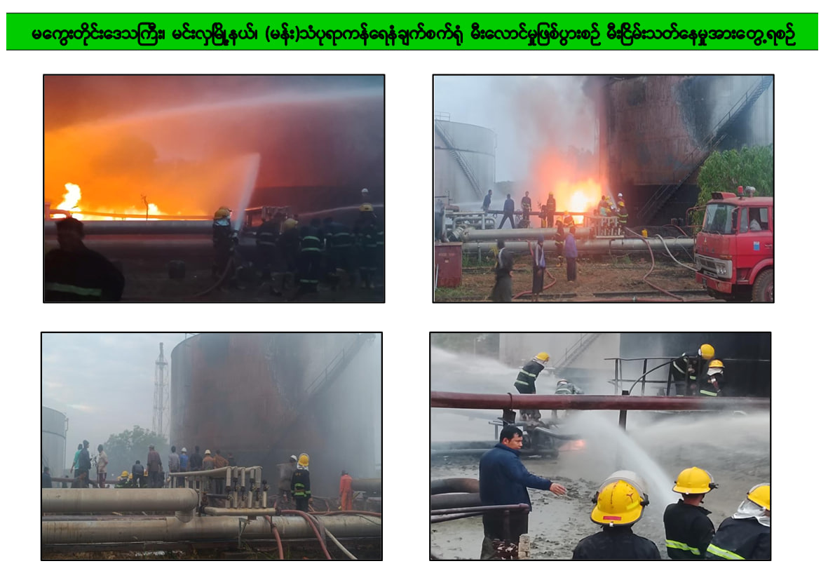 မကွေးတိုင်းဒေသကြီး၊ မင်းလှမြို့နယ်ရှိ ရေနံဓာတုဗေဒစက်ရုံစု(သံပရာကန်)၌ ယနေ့နံနက် ၆ နာရီ၊ ၅ မိနစ်ခန့်တွင် စတင်မီးလောင်ကျွမ်းမှုဖြစ်ပွားခဲ့ရာ စက်ရုံရှိမီးသတ် ဝန်ထမ်းများနှင့် စက်ရုံဝန်ထမ်းများ၊ တပ်နယ်၊ ခရိုင်၊ မြို့နယ်များရှိ မီးသတ်တပ်ဖွဲ့ဝင်များဖြင့် အတူပူးပေါင်းပြီး ဝိုင်းဝန်းငြိမ်းသတ်နိုင်ခဲ့မှုကြောင့် နံနက် ၇ နာရီအချိန်တွင် မီးငြိမ်းသတ်နိုင်ပြီး လက်ရှိအချိန်တွင် ကုန်ထုတ်လုပ်မှုလုပ်ငန်းများ ပုံမှန်ပြန်လည် လည်ပတ်လျက်ရှိသည်။