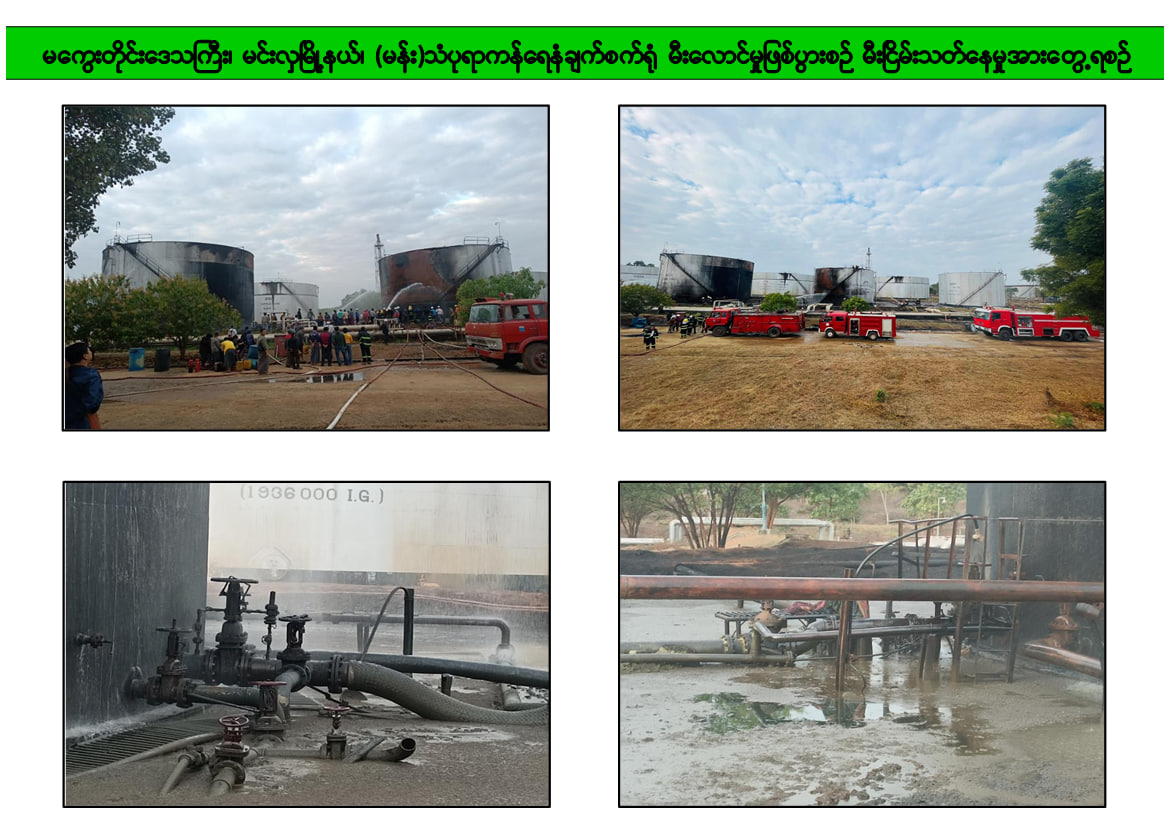 မီးလောင်ကျွမ်းမှုဖြစ်စဉ် ဖြစ်ပွားခဲ့သည့် ရေနံစိမ်းလက်ခံသိုလှောင်ကန် အခြေအနေများအား စက်ရုံမှူးမှ တင်ပြခဲ့ရာ သိုလှောင်ကန်နံရံများသာ မီလောင်ကျွမ်းခဲ့ပြီး သံကန်အတွင်း သိုလှောင်ထားသည့် ရေနံစိမ်းများ ပျက်စီးဆုံးရှုံးမှု မရှိပါကြောင်း၊ လက်ရှိမီးလောင်မှု ဖြစ်ပွားခဲ့သည့် သိုလှောင်ကန်နှစ်ကန်အား အသုံးမပြုဘဲ အခြားရေနံစိမ်းသိုလှောင်ကန် များအား အသုံးပြုပြီး ထုတ်လုပ်ခြင်း လုပ်ငန်းများ ဆောင်ရွက်သွားမည် ဖြစ်ပါကြောင်း၊ စက်ရုံနှင့် ရေနံသိုလှောင်ကန်များ ပျက်စီးဆုံးရှုံးမှု မရှိဘဲ ရေနံစိမ်း သိုလှောင်ခြင်းနှင့် ထုတ်လုပ်ခြင်းလုပ်ငန်းများအား ပုံမှန်အတိုင်း လည်ပတ်ဆောင်ရွက်လျက်ရှိကြောင်း၊ ပြင်ပရှိ ဆက်သွယ်ထားသည့် ပိုက်လိုင်းအနည်းငယ်သာပျက်စီးသွားပြီး ပိုက်လိုင်းအတွင်းရှိ ပိုက်လိုင်းကျန်ရေနံစိမ်း ခန့်မှန်းဂါလံ ၃၅၀ ခန့်သာ ဆုံးရှုံးခဲ့ပါကြောင်း၊ ပြင်ပရှိပိုက်လိုင်းများ ပျက်စီးမှုများကိုလည်း အမြန်ဆုံးပြုပြင် ဆောင်ရွက်နိုင်ရေး စီမံဆောင်ရွက်လျက် ရှိပါကြောင်း ရှင်းလင်းတင်ပြခဲ့သည်။