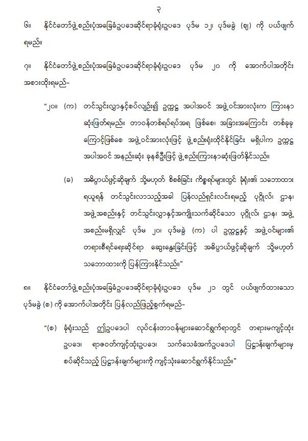 ၂။ နိုင်ငံတော်ဖွဲ့စည်းပုံအခြေခံဥပဒေဆိုင်ရာခုံရုံးဥပဒေ ပုဒ်မ ၂၊ ပုဒ်မခွဲ (ဆ) ၏ နောက်တွင် ပုဒ်မခွဲ (ဇ)၊ (ဈ)၊ (ည)၊ (ဋ) နှင့် (ဌ) တို့အဖြစ် အောက်ပါအတိုင်း ဖြည့်စွက်ရမည်-