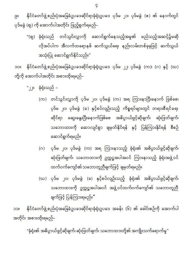 ၉။ နိုင်ငံတော်ဖွဲ့စည်းပုံအခြေခံဥပဒေဆိုင်ရာခုံရုံးဥပဒေ ပုဒ်မ ၂၁၊ ပုဒ်မခွဲ (ဇ) ၏ နောက်တွင် ပုဒ်မခွဲ (ဈ) ကို အောက်ပါအတိုင်း ဖြည့်စွက်ရမည်-