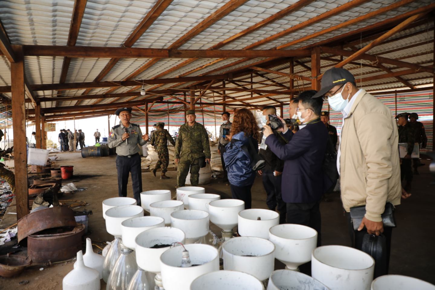 ထို့နောက် ဖော်ထုတ်ဖမ်းဆီးရမိသည့် မူးယစ်ဆေးဝါးချက်လုပ်ရာတွင်အသုံးပြုသော ဓာတုပစ္စည်းများ၊ ဆက်စပ်ပစ္စည်းများခင်းကျင်းပြသထားရှိမှုအား လိုက်လံကြည့်ရှုလေ့လာကြပြီး မူးယစ်ဆေးဝါးချက်လုပ်ရာ၌ အသုံးပြုခဲ့သည့် ယာယီအဆောက်အဦများ၊ ဓာတုပစ္စည်းများ၊ မူးယစ်ဆေးဝါးချက်လုပ်ရာတွင်အသုံးပြုသော ဆက်စပ်ပစ္စည်းများကို နေရာတစ်ခုချင်းစီ အလိုက် လိုက်လံရှင်းလင်းပြသခဲ့ကာ သတင်းမီဒီယာများ၏ သိရှိလိုသည့် မေးမြန်းမှုများ အပေါ် တာဝန်ရှိသူများနှင့် ဖော်ထုတ်သိမ်းပိုက်ရာတွင် ပါဝင်ခဲ့ကြသည့် လုံခြုံရေးတပ်ဖွဲ့ဝင် များက ပြန်လည်ရှင်းလင်းဖြေကြားခဲ့ကြသည်။