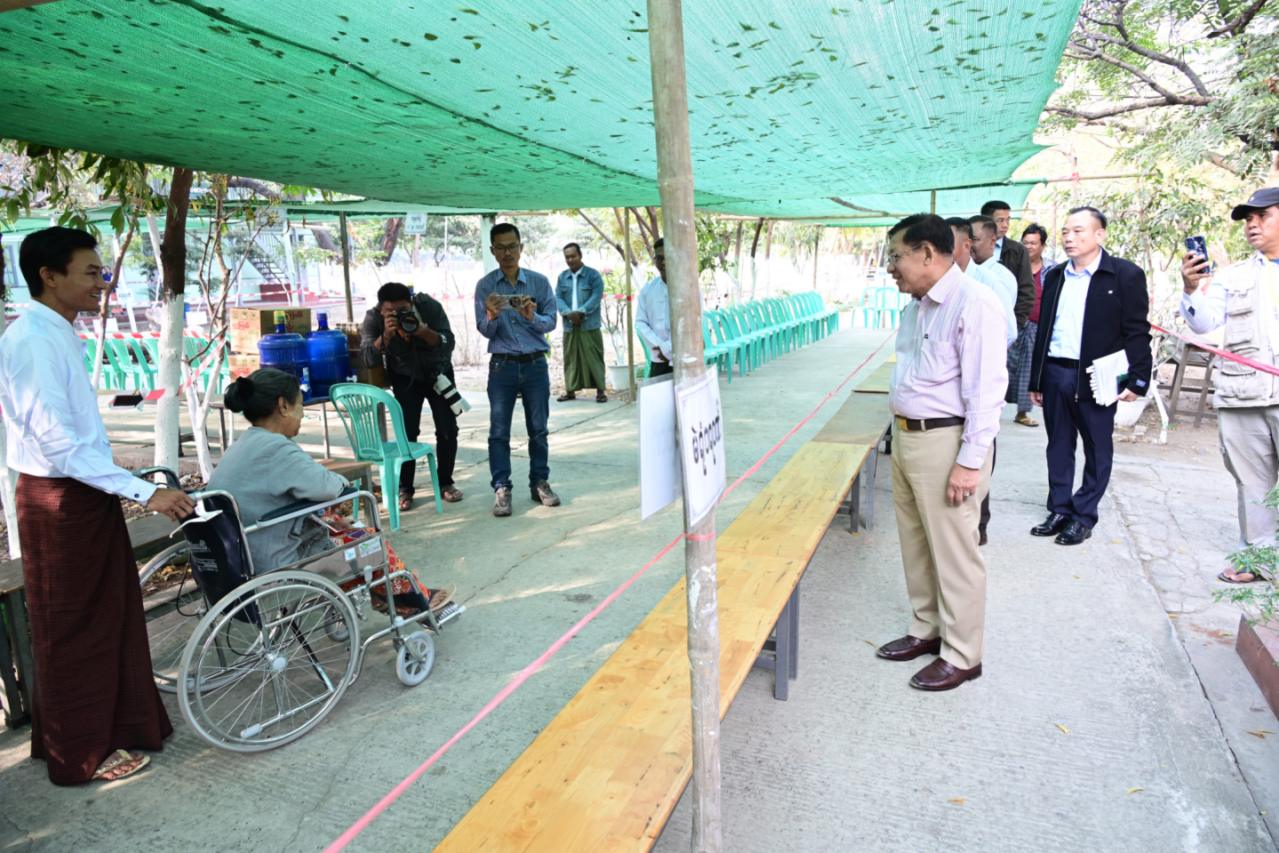 နိုင်ငံတော်ယာယီသမ္မတ နိုင်ငံတော်လုံခြုံရေးနှင့် အေးချမ်းသာယာရေးကော်မရှင်ဥက္ကဋ္ဌ ဗိုလ်ချုပ်မှူးကြီး မင်းအောင်လှိုင် ပြည်ထောင်စုသမ္မတမြန်မာနိုင်ငံတော် ၂၀၂၅ ခုနှစ် ပါတီစုံဒီမိုကရေစီ အထွေထွေရွေးကောက်ပွဲ အပိုင်း(၃)တွင် ပါဝင်ဆန္ဒမဲပေးနေကြသည့် မဲဆန္ဒရှင်ပြည်သူများအား မဲရုံများအလိုက် လိုက်လံကြည့်ရှုအားပေး