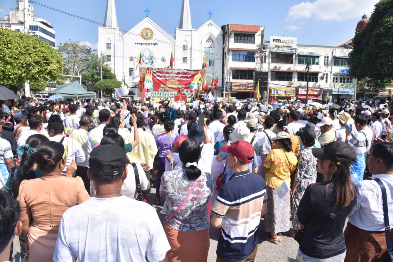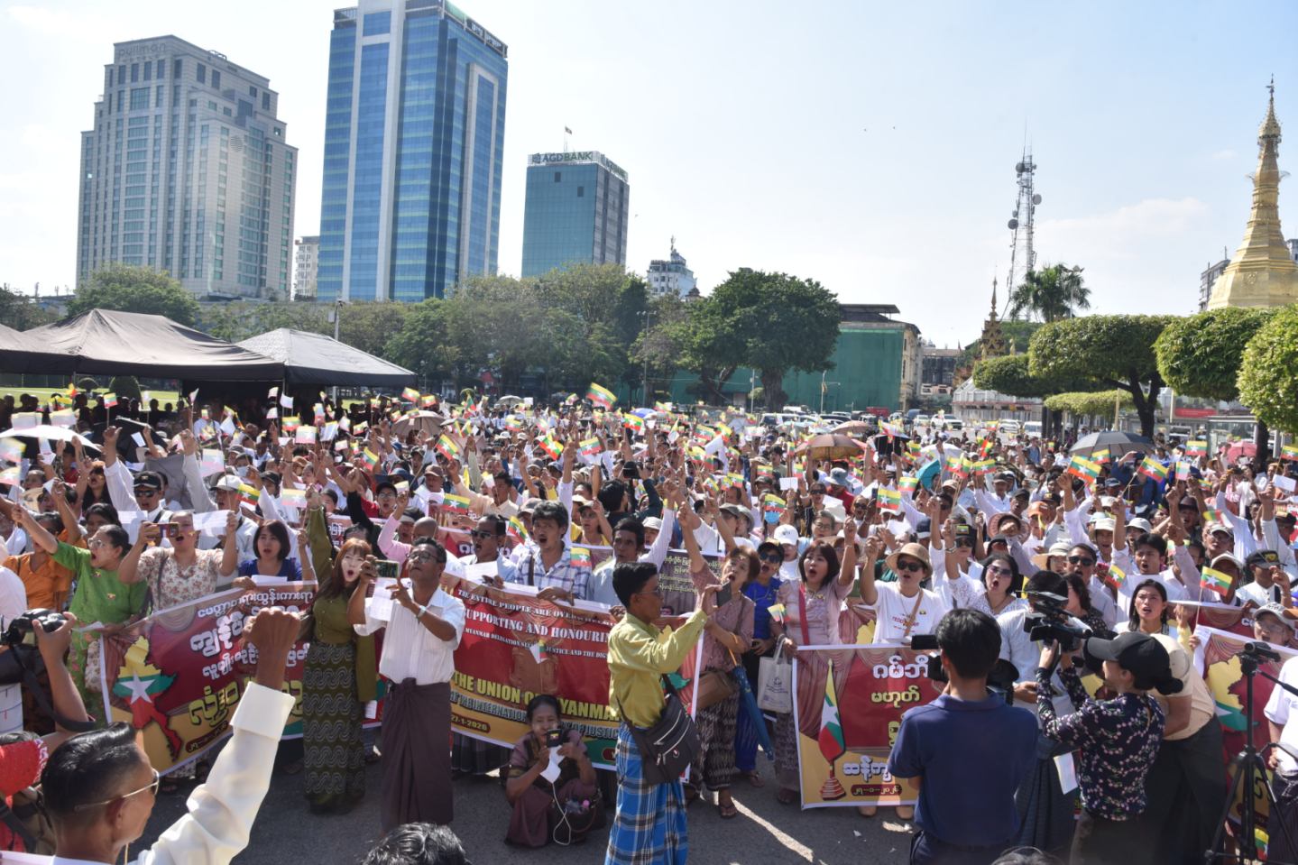 ပြည်ထောင်စုသမ္မတမြန်မာနိုင်ငံတော်၏ ဂုဏ်သိက္ခာနှင့် တရားမျှတသော အမှန်တရား အတွက် နယ်သာလန်နိုင်ငံ၊ သည်ဟိတ်ဂ်မြို့၊ အပြည်ပြည်ဆိုင်ရာတရားရုံး(ICJ)၌ သွားရောက် ဖြေရှင်းနေသော မြန်မာကိုယ်စားလှယ်အဖွဲ့၏ လျှောက်လဲချေပချက်များအား ထောက်ခံ ဂုဏ်ပြုပွဲနှင့် ဂမ်ဘီယာနိုင်ငံ၏ မဟုတ်မမှန်စွပ်စွဲချက်များကို ကန့်ကွက်ရှုတ်ချသည့် အမျိုးသားရေး ဆန္ဒထုတ်ဖော်ပွဲကို ယနေ့မွန်းလွဲပိုင်းတွင် ရန်ကုန်မြို့၊ မြို့တော်ခန်းမရှေ့၊ ယာဉ်ရပ်နားကွင်း၌ ပြုလုပ်ရာ မျိုးချစ်မြန်မာရဟန်းတော်များသမဂ္ဂမှ သံဃာတော်များ၊ သာသနာနွယ်ဝင် သီလရှင်များ၊ ပြည်သူများ၊ နိုင်ငံရေးပါတီများမှပါတီဝင်များ တက်ရောက်ကြသည်။