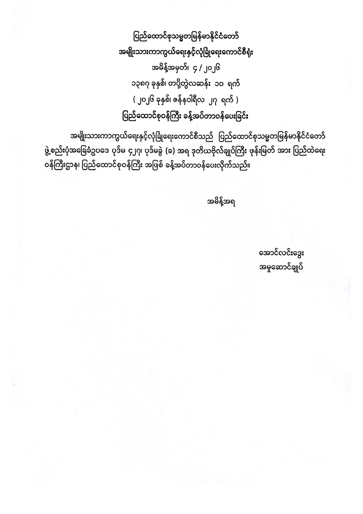 ပြည်ထောင်စုသမ္မတမြန်မာနိုင်ငံတော် အမျိုးသားကာကွယ်ရေးနှင့်လုံခြုံရေးကောင်စီရုံး အမိန့်အမှတ်၊ ၄/ ၂၀၂၆ ၁၃၈၇ ခုနှစ်၊ တပို့တွဲလဆန်း ၁၀ ရက် ( ၂၀၂၆ ခုနှစ်၊ ဇန်နဝါရီလ ၂၇ ရက် ) ပြည်ထောင်စုဝန်ကြီး ခန့်အပ်တာဝန်ပေးခြင်း