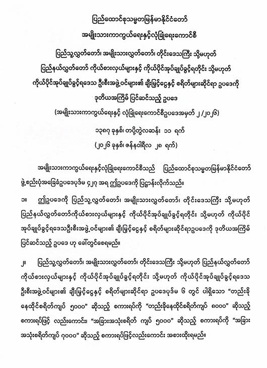 ပြည်သူ့လွှတ်တော်၊ အမျိုးသားလွှတ်တော်၊ တိုင်းဒေသကြီး သို့မဟုတ် ပြည်နယ်လွှတ်တော် ကိုယ်စားလှယ်များနှင့် ကိုယ်ပိုင်အုပ်ချုပ်ခွင့်ရတိုင်း သို့မဟုတ် ကိုယ်ပိုင်အုပ်ချုပ်ခွင့်ရဒေသ ဦးစီးအဖွဲ့ဝင်များ၏ ချီးမြှင့်ငွေနှင့် စရိတ်များဆိုင်ရာ ဥပဒေကို ဒုတိယအကြိမ် ပြင်ဆင်သ