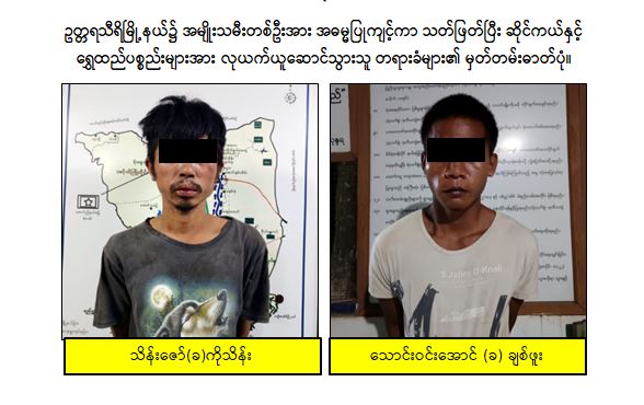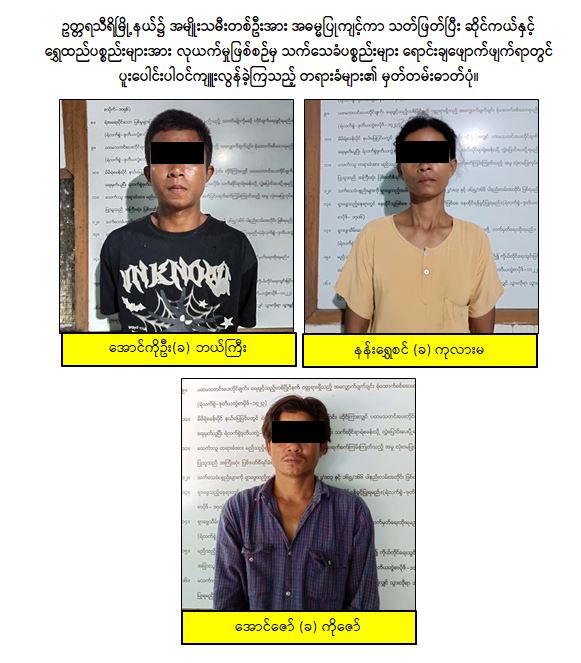 ထို့သို့ဆောင်ရွက်ခဲ့ရာ ပြစ်မှုကျူးလွန်ခဲ့သူများသည် ဇမ္ဗူသီရိမြို့နယ်တွင် ဆောက်လုပ်ရေး လုပ်ငန်းလာရောက်လုပ်ကိုင်သူများဖြစ်ကြောင်း ဖော်ထုတ်သိရှိရသဖြင့် ဖမ်းဆီးရမိနိုင်ရေး ဆောင်ရွက် ခဲ့ရာ ကဝမြို့နယ်၊ အင်းမော်ကျေးရွာနေ သိန်းဇော်(ခ)ကိုသိန်း (၄၃)နှစ်၊ ဒဂုံမြို့သစ်(ဆိပ်ကမ်း) မြို့နယ်၊ အမှတ်(၆၇)ရပ်ကွက်နေ သောင်းဝင်းအောင် (ခ) ချစ်ဖူး (၂၃)နှစ်၊ ဒက္ခိဏသီရိမြို့နယ်၊ စိုက်ခင်း(၃)ကျေးရွာနေ အောင်ကိုဦး (ခ) ဘယ်ကြီး (၂၇)နှစ်နှင့် ကဝမြို့နယ်၊ ဝါးတောကျေးရွာနေ နန်းရွှေစင် (ခ) ကုလားမ (၄၁)နှစ်တို့အား ဖြစ်စဉ်တွင် ပျောက်ဆုံးနေသည့် CANDA 110 ဆိုင်ကယ် တစ်စီးနှင့်အတူ စက်တင်ဘာလ ၁ ရက်နေ့ ညပိုင်းတွင် ဇမ္ဇူသီရိမြို့နယ်အတွင်းရှိ ဆောက်လုပ်ရေး လုပ်ငန်းခွင်တစ်ခုမှ ဖမ်းဆီးရမိခဲ့ပြီး ပူးပေါင်းပါဝင်ခဲ့သည့် ဒေးဒရဲမြို့၊ အမှတ်(၂)ရပ်ကွက်နေ အောင်ဇော် (ခ) ကိုဇော် (၄၄)နှစ်အား စက်တင်ဘာလ ၂ ရက်နေ့ ညပိုင်းတွင် ဒက္ခိဏသီရိမြို့နယ်၊ စိုက်ခင်း(၃)ကျေးရွာ၌ ထပ်မံဖမ်းဆီးရမိခဲ့ပါသည်။