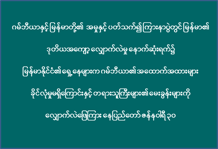 မြန်မာနိုင်ငံ၏ ရှေ့နေများက ဂမ်ဘီယာ၏ အထောက်အထားများ ခိုင်လုံမှုမရှိ ကြောင်းနှင့် တရားသူကြီးများ၏ မေးခွန်းများကို လျှောက်လဲ ဖြေကြားကြသည် ။