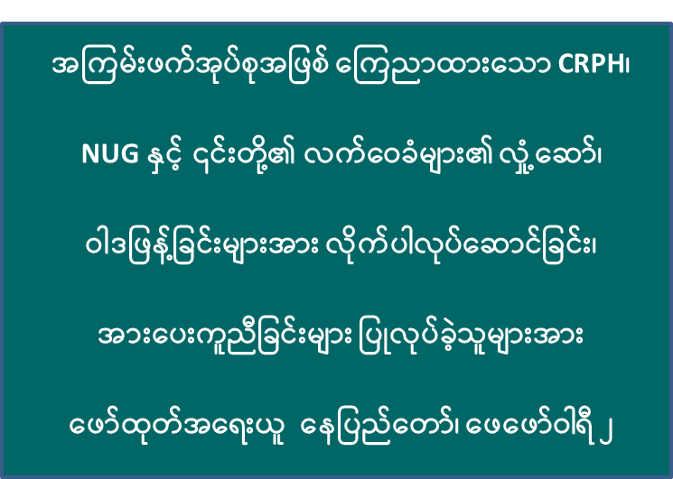 အကြမ်းဖက်အုပ်စုအဖြစ်ကြေညာထားသည့် CRPH၊ NUG နှင့် ယင်းတို့၏ လက်ဝေခံ အဖွဲ့အစည်းများ၊ ယင်းတို့နှင့် ဆက်နွှယ်နေသော အဖွဲ့အစည်းများ၊ လူပုဂ္ဂိုလ်များသည် နိုင်ငံတော် တည်ငြိမ်အေးချမ်းရေးကို ပျက်ပြားစေရန်နှင့် အစိုးရယန္တရားများ ပျက်ပြားစေရန် ရည်ရွယ်လျက် လှုံ့ဆော်ခြင်း၊ ဝါဒဖြန့်ခြင်းများပြုလုပ်ခဲ့မှုအပေါ် ဥပဒေနှင့်အညီ ထိရောက်စွာ အရေးယူသွားမည် ဖြစ်ကြောင်းနှင့် ထိုသို့ လှုံ့ဆော်သူ၊ ဝါဒဖြန့်သူများအား ဆက်လက်ဖော်ထုတ်အရေးယူသွားမည်ဖြစ် ကြောင်း မိဘပြည်သူများ သိရှိနိုင်ရေး အသိပေးသတင်းထုတ်ပြန်ပြီးဖြစ်သည်။