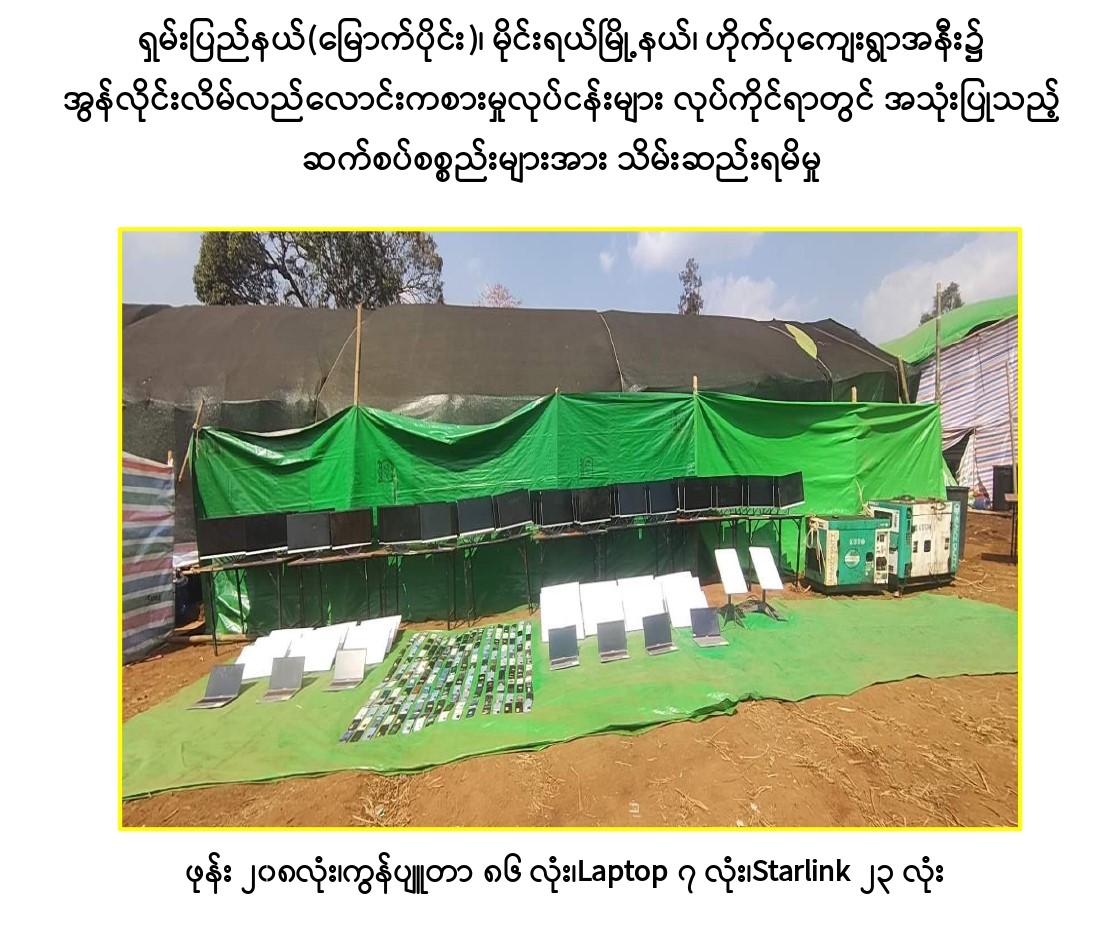ရှမ်းပြည်နယ်(မြောက်ပိုင်း)၊ မိုင်းရယ်မြို့နယ်၊ ဟိုက်ပုကျေးရွာအနီး၌ အွန်လိုင်းလိမ်လည်လောင်းကစားမှုလုပ်ငန်းများ လုပ်ကိုင်နေသူများအား လုပ်ငန်းသုံးဆက်စပ်ပစ္စည်းများနှင့်အတူ ဖမ်းဆီးရမိ