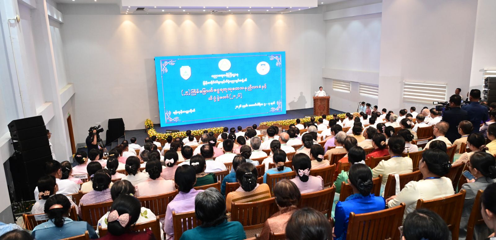 ဦးစွာ နိုင်ငံတော်ယာယီသမ္မတ နိုင်ငံတော်လုံခြုံရေးနှင့်အေးချမ်းသာယာရေး ကော်မရှင်ဥက္ကဋ္ဌနှင့် အခမ်းအနားတက်ရောက်လာကြသူများသည် မြန်မာနိုင်ငံဝိဇ္ဇာနှင့် သိပ္ပံပညာရှင်အဖွဲ့၏ မှတ်တမ်းဗီဒီယိုအား ကြည့်ရှုကြသည်။
