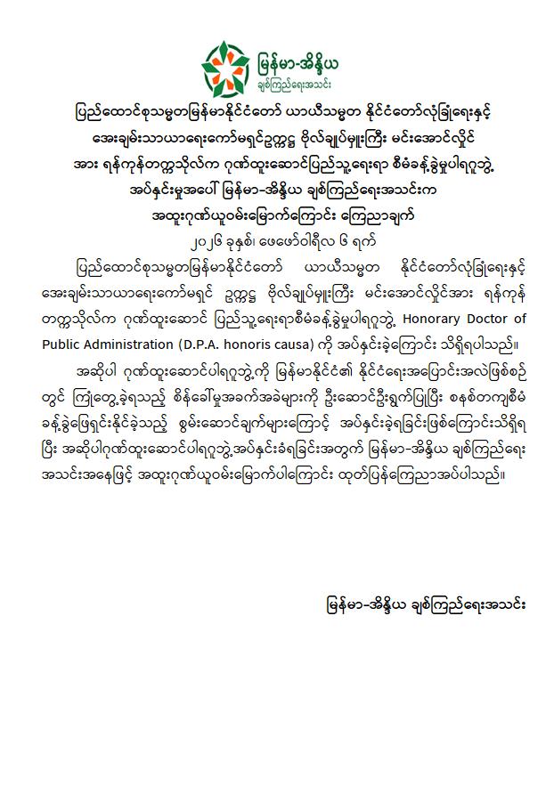 ပြည်ထောင်စုသမ္မတမြန်မာနိုင်ငံတော် ယာယီသမ္မတ နိုင်ငံတော်လုံခြုံရေးနှင့် အေးချမ်းသာယာရေးကော်မရှင်ဥက္ကဋ္ဌ ဗိုလ်ချုပ်မှူးကြီး မင်းအောင်လှိုင် အား ရန်ကုန် တက္ကသိုလ်က ဖေဖော်ဝါရီ ၅ ရက်တွင် အထူးဘွဲ့နှင်းသဘင်အခမ်းအနားဖြင့် ဂုဏ်ထူး ဆောင်ပြည်သူ့ရေးရာ စီမံခန့်ခွဲမှု ပါရဂူဘွဲ့ Honorary Doctor of Public Administration (D.P.A. honoris causa)ကို ချီးမြှင့်အပ်နှင်းခဲ့ရာ ထိုသို့ ဂုဏ်ထူးဆောင်ပါရဂူဘွဲ့ လက်ခံရရှိမှုအပေါ် အဖွဲ့အစည်းအသီးသီးက အထူးဂုဏ်ယူဝမ်း မြောက်ကြောင်း ထုတ်ပြန်ကြေညာချက်များကို ယနေ့တွင် ထုတ်ပြန်ကြေညာကြသည်။
