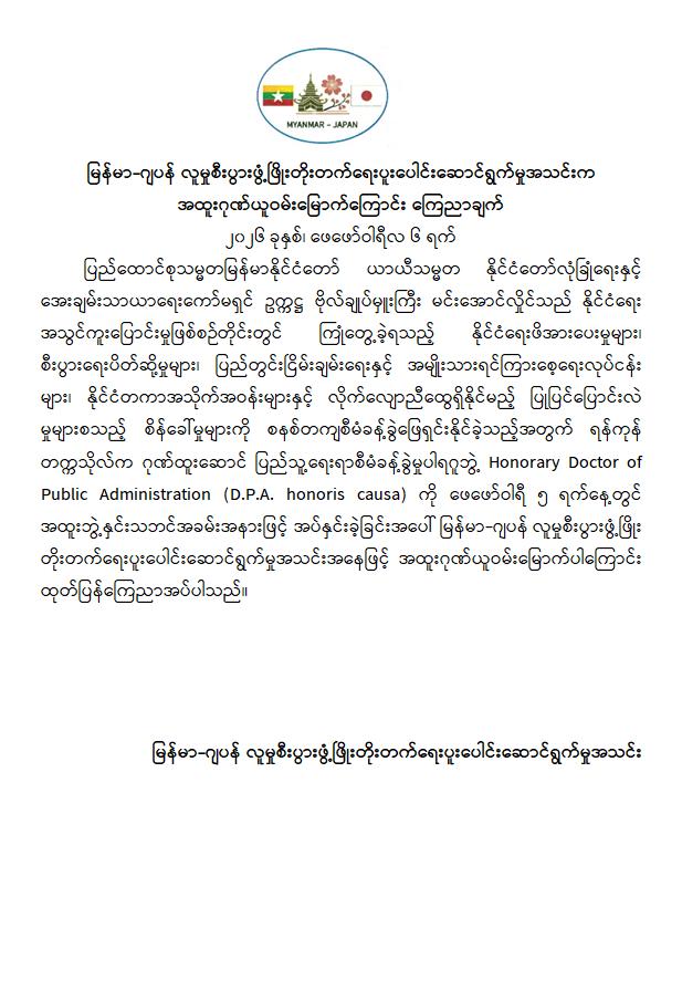 ပြည်ထောင်စုသမ္မတမြန်မာနိုင်ငံတော် ယာယီသမ္မတ နိုင်ငံတော်လုံခြုံရေးနှင့် အေးချမ်းသာယာရေးကော်မရှင်ဥက္ကဋ္ဌ ဗိုလ်ချုပ်မှူးကြီး မင်းအောင်လှိုင် အား ရန်ကုန်တက္ကသိုလ်က ဂုဏ်ထူးဆောင်ပြည်သူ့ရေးရာ စီမံခန့်ခွဲမှုပါရဂူဘွဲ့ ချီးမြှင့်အပ်နှင်းမှုအပေါ် အဖွဲ့အစည်းအသီးသီးက အထူးဂုဏ်ယူဝမ်းမြောက်ကြောင်း ထုတ်ပြန်ကြေညာ