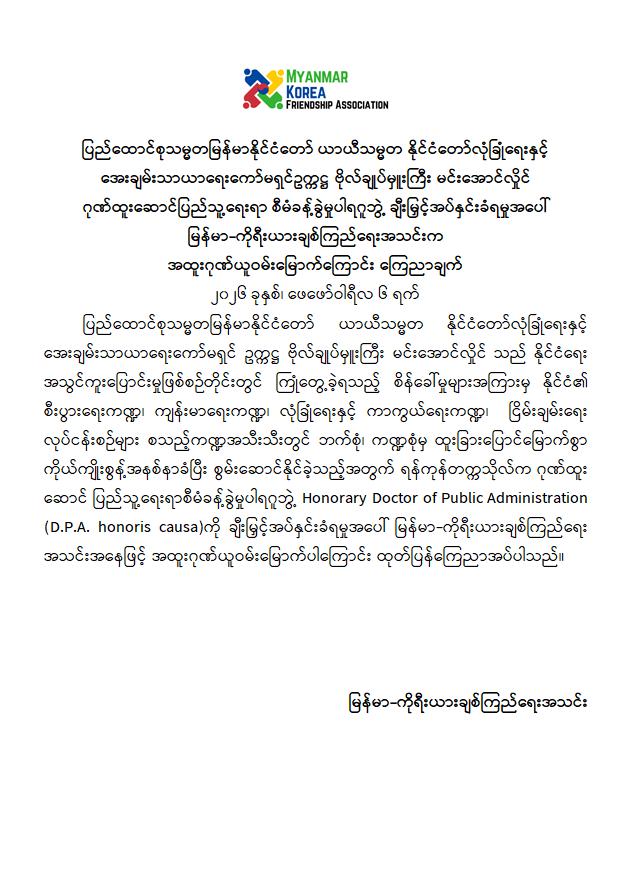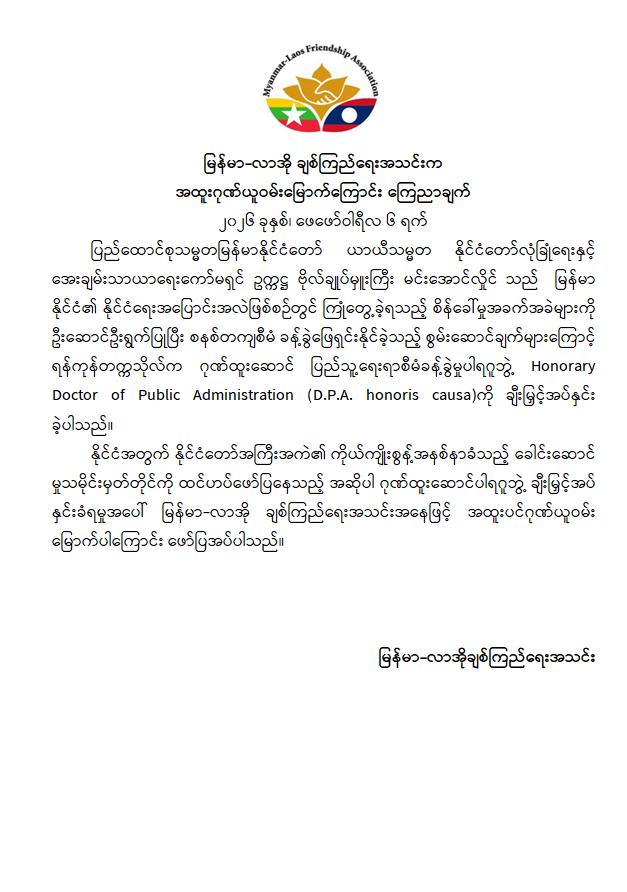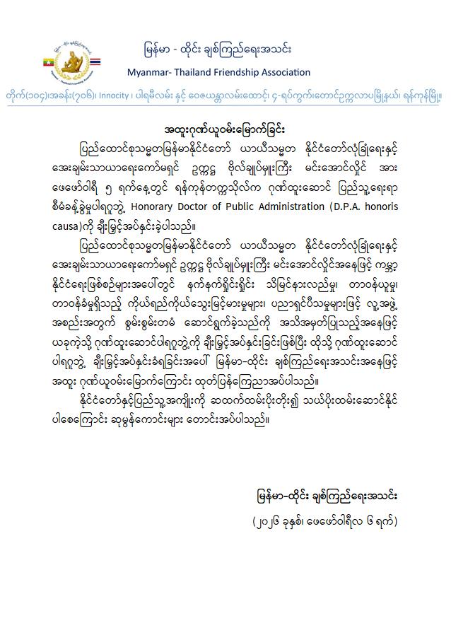 ပြည်ထောင်စုသမ္မတမြန်မာနိုင်ငံတော် ယာယီသမ္မတ နိုင်ငံတော်လုံခြုံရေးနှင့် အေးချမ်းသာယာရေးကော်မရှင်ဥက္ကဋ္ဌ ဗိုလ်ချုပ်မှူးကြီး မင်းအောင်လှိုင် သည် မြန်မာ နိုင်ငံ၏ နိုင်ငံရေးအပြောင်းအလဲဖြစ်စဉ်တွင် ကြုံတွေ့ခဲ့ရသည့် စိန်ခေါ်မှုအခက်အခဲများကို ဦးဆောင်ဦးရွက်ပြုပြီး စနစ်တကျစီမံခန့်ခွဲ ဖြေရှင်းနိုင်ခဲ့သည့် စွမ်းဆောင်ချက်များနှင့် နိုင်ငံတော်နှင့် ပြည်သူ့အကျိုးအတွက် စွမ်းစွမ်းတမံကြိုးပမ်းဆောင်ရွက်ခဲ့သည့်အတွက် ထိုသို့ ထူးကဲသော ဂုဏ်ဒြပ်များကို ဂုဏ်ပြုသောအားဖြင့် ရန်ကုန်တက္ကသိုလ်က ချီးမြှင့် ပေးအပ်သည့် ဂုဏ်ထူးဆောင်ပြည်သူ့ရေးရာစီမံခန့်ခွဲမှုပါရဂူဘွဲ့ Honorary Doctor of Public Administration (D.P.A. honoris causa)ကို ရရှိခဲ့ခြင်းအတွက် မြန်မာ-အိန္ဒိယချစ်ကြည်ရေးအသင်း၊ မြန်မာ-ဂျပန် လူမှုစီးပွားဖွံ့ဖြိုးတိုးတက်ရေး ပူးပေါင်း ဆောင်ရွက်မှုအသင်း၊ မြန်မာ-ကိုရီးယားချစ်ကြည်ရေးအသင်း၊ မြန်မာ-ထိုင်း ချစ်ကြည် ရေးအသင်းနှင့် မြန်မာ-လာအိုချစ်ကြည်ရေးအသင်းတို့က အထူးဂုဏ်ယူဝမ်းမြောက် ကြောင်း ကြေညာချက်များ ထုတ်ပြန်ခဲ့ကြကြောင်း သတင်းရရှိသည်။