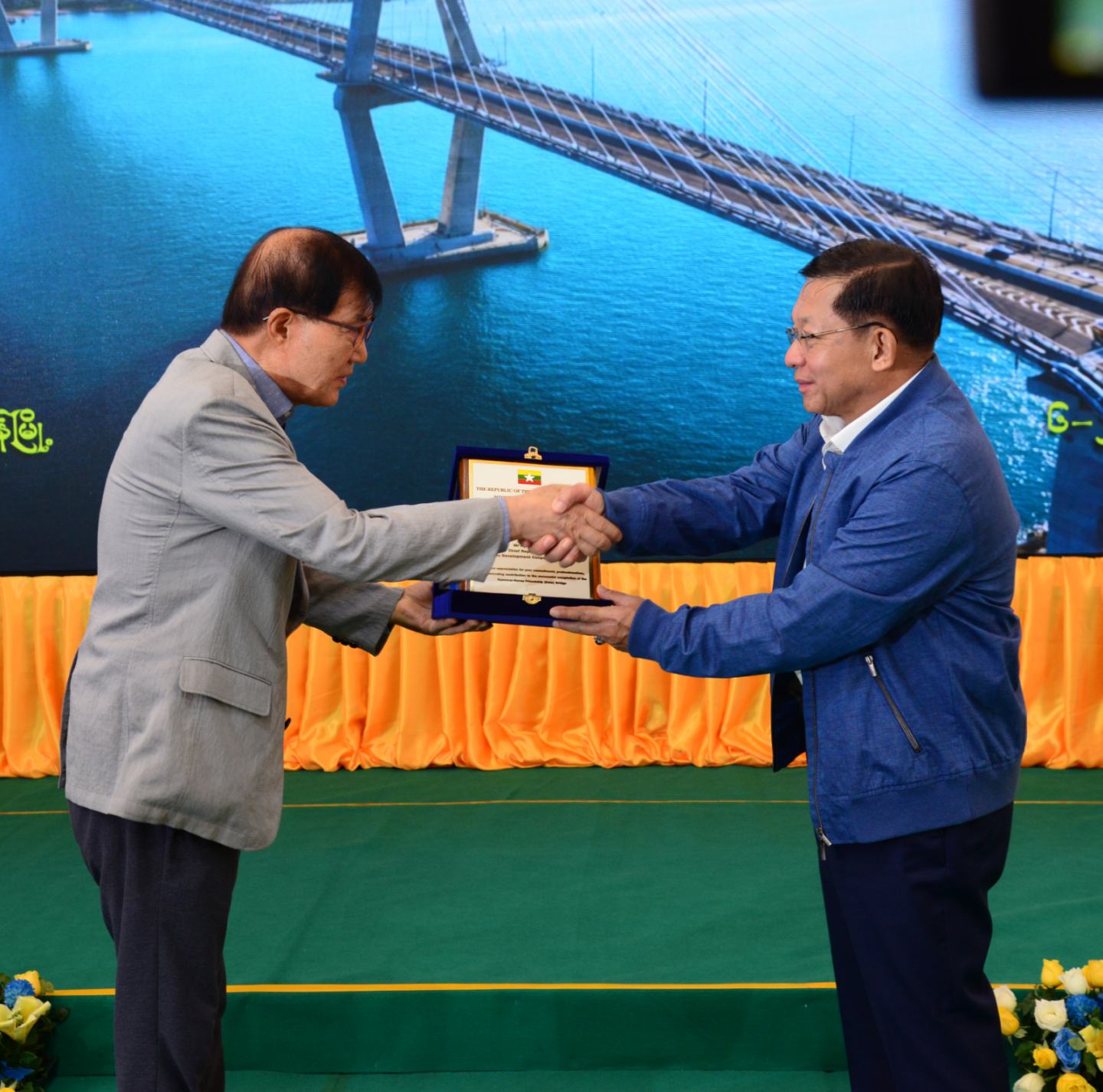 ပြည်ထောင်စုသမ္မတမြန်မာနိုင်ငံတော် ယာယီသမ္မတ နိုင်ငံတော်လုံခြုံရေးနှင့် အေးချမ်းသာယာရေးကော်မရှင်ဥက္ကဋ္ဌ ဗိုလ်ချုပ်မှူးကြီး မင်းအောင်လှိုင် မြန်မာ-ကိုရီးယားချစ်ကြည်ရေး(ဒလ)တံတား ဖွင့်ပွဲအခမ်းအနားသို့ တက်ရောက်ချီးမြှင့်
