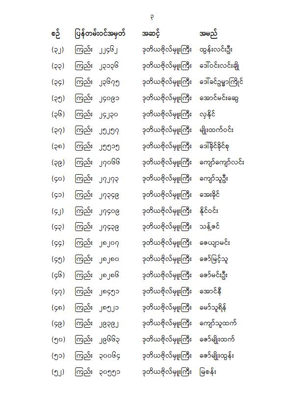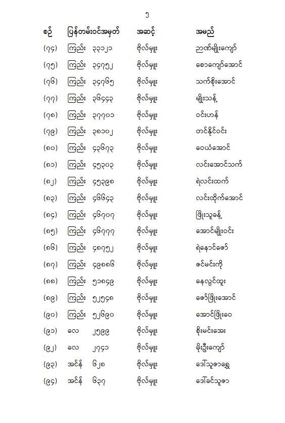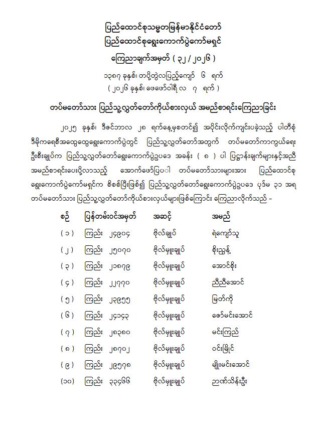 ပြည်ထောင်စုသမ္မတမြန်မာနိုင်ငံတော် ပြည်ထောင်စုရွေးကောက်ပွဲကော်မရှင် ကြေညာချက်အမှတ် ( ၃၂ / ၂၀၂၆ ) ၁၃၈၇ ခုနှစ်၊ တပို့တွဲလပြည့်ကျော် ၆ ရက် ( ၂၀၂၆ ခုနှစ်၊ ဖေဖော်ဝါရီ လ ၇ ရက် ) တပ်မတော်သား ပြည်သူ့လွှတ်တော်ကိုယ်စားလှယ် အမည်စာရင်းကြေညာခြင်း