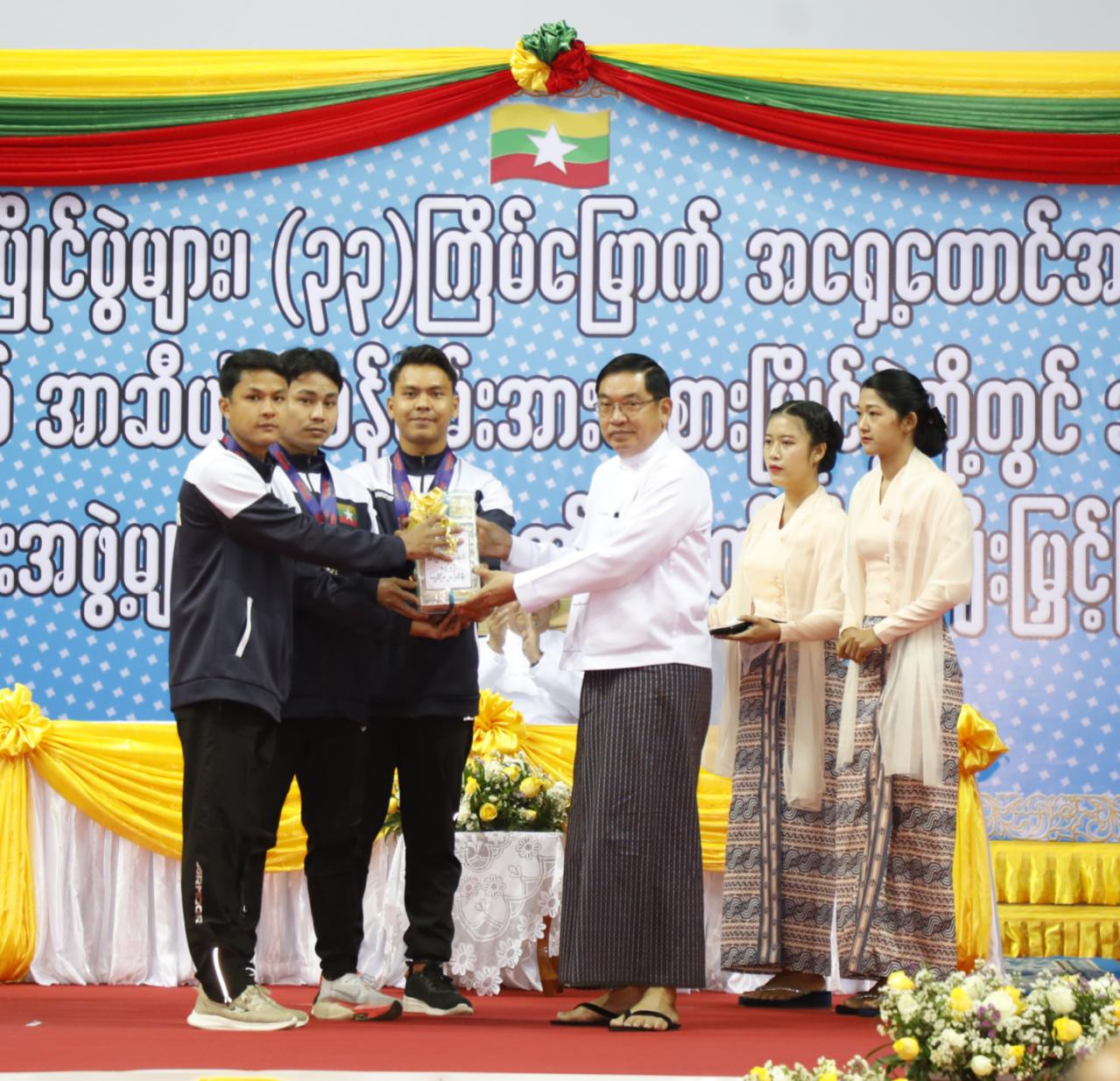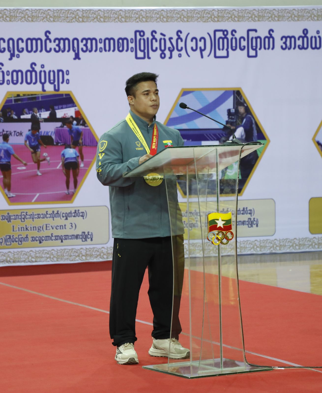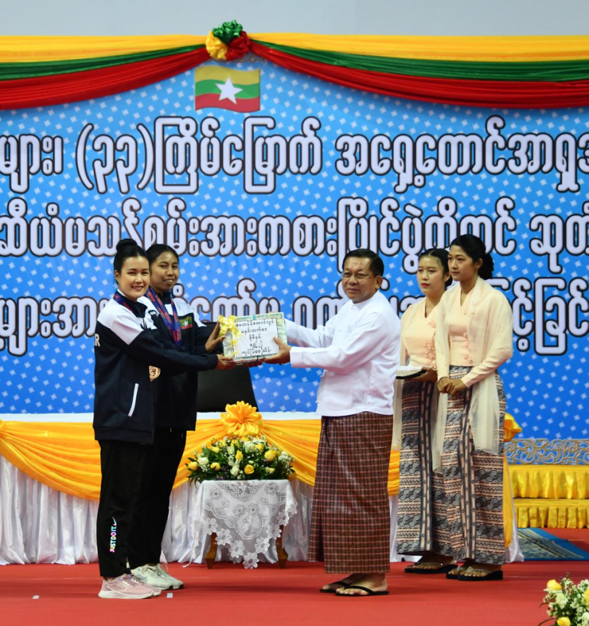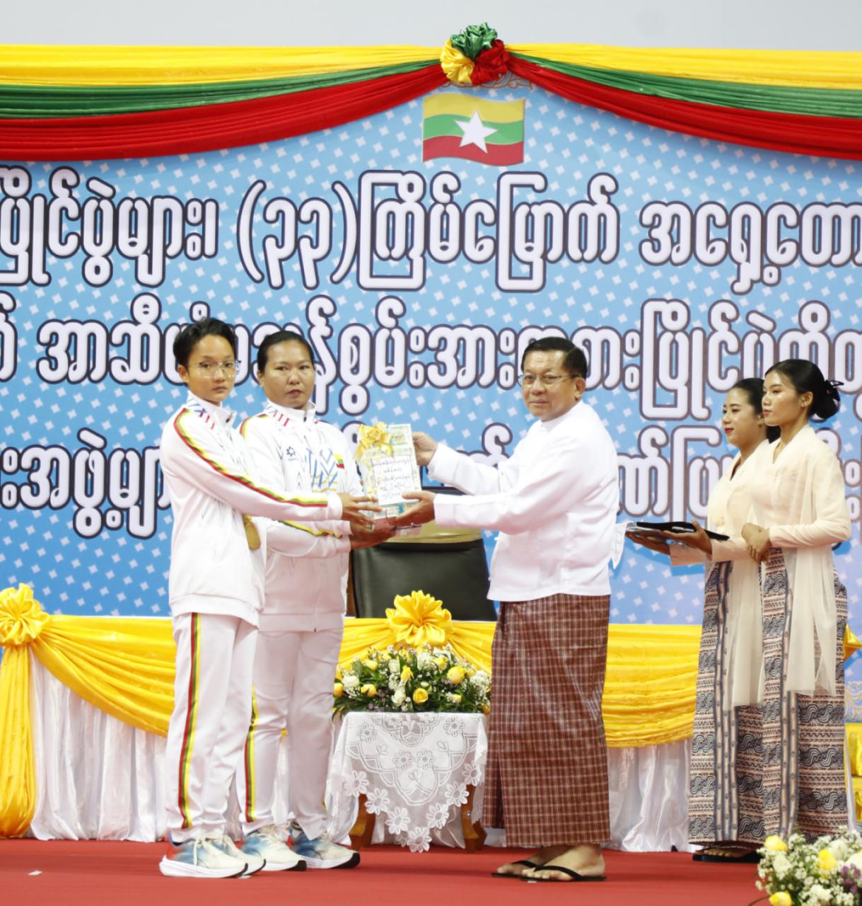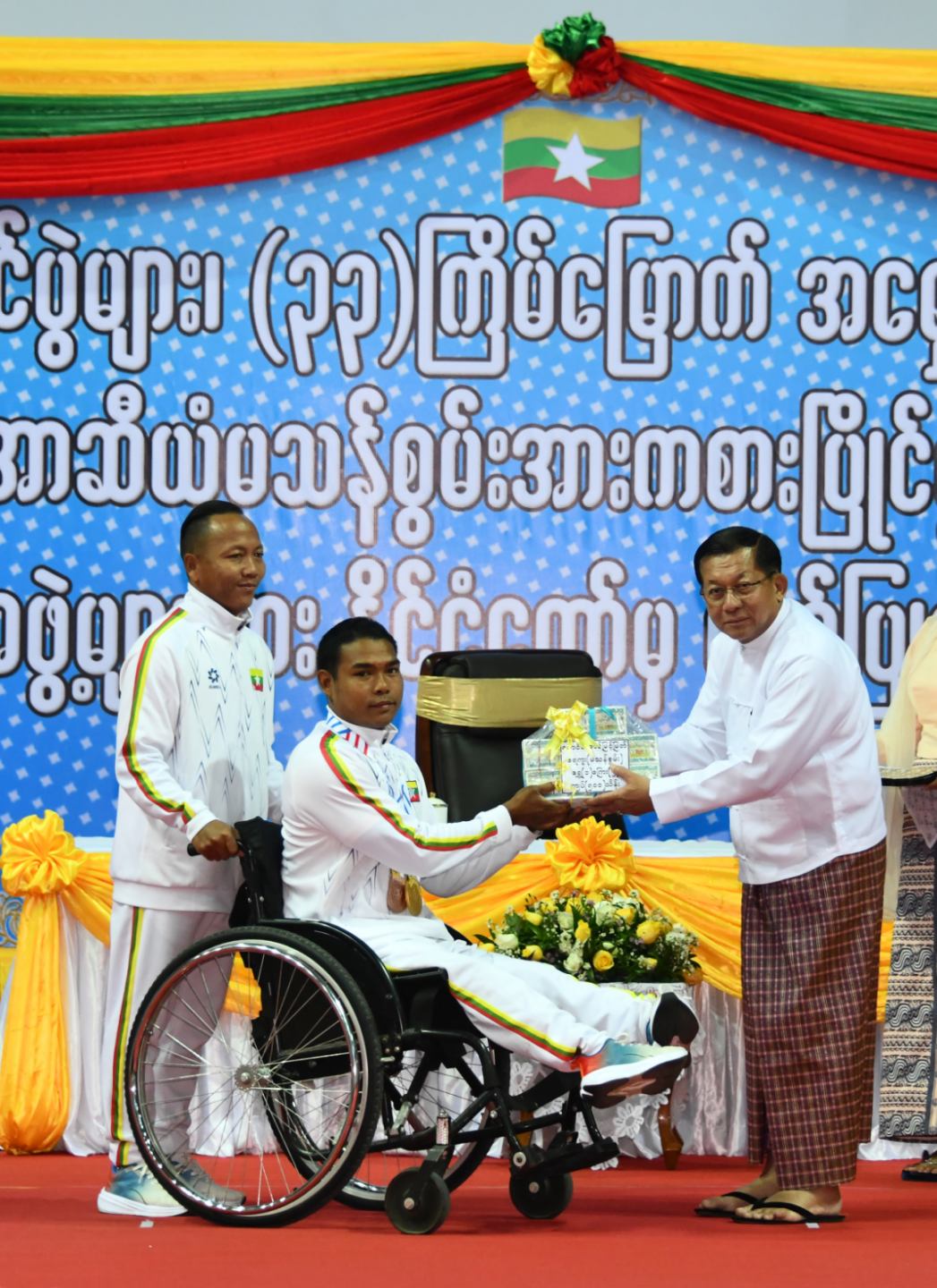 ထို့နောက်(၈)ကြိမ်မြောက်ကမ္ဘာ့ဗိုဗီနမ်ချန်ပီယံရှစ်ပြိုင်ပွဲ၊ (၁၆)ကြိမ်မြောက်ကမ္ဘာ့ ကာယဗလနှင့် ကာယကြံ့ခိုင်မှု အားကစားပြိုင်ပွဲ၊ (၃၃)ကြိမ်မြောက် အရှေ့တောင်အာရှ အားကစားပြိုင်ပွဲနှင့် (၁၃)ကြိမ်မြောက် အာဆီယံမသန်စွမ်းအားကစားပြိုင်ပွဲတို့တွင် နိုင်ငံ့ ဂုဏ်ဆောင်ခဲ့သည့် အားကစားသမားမောင်မယ်များအား နိုင်ငံတော်မှဂုဏ်ပြု ချီးမြှင့်ပွဲ အခမ်းအနားကို ကျင်းပပြုလုပ်ရာ နိုင်ငံတော်ယာယီသမ္မတ နိုင်ငံတော်လုံခြုံရေး နှင့် အေးချမ်းသာယာရေး ကော်မရှင်ဥက္ကဋ္ဌက (၈)ကြိမ်မြောက်ကမ္ဘာ့ဗိုဗီနမ် ချန်ပီယံ ရှစ်ပြိုင်ပွဲတွင် ရွှေတံဆိပ် ၂ ဆုရရှိခဲ့ကြသည့် မမေဟန်နီအောင်လွင် နှင့် မနှင်းသက်ဝေ၊ (၁၆)ကြိမ်မြောက်ကမ္ဘာ့ ကာယဗလနှင့် ကာယကြံ့ခိုင်မှု အားကစား ပြိုင်ပွဲ၊ Men Bodybuilding 75 kg ပြိုင်ပွဲ၌ ရွှေတံဆိပ် ၁ ဆုရရှိခဲ့သည့် မောင်ရဲထွန်းနောင်၊ (၃၃) ကြိမ်မြောက် အရှေ့တောင်အာရှအားကစားပြိုင်ပွဲ၊ ခြင်းလုံး အားကစားနည်းတွင် အမျိုး သားအသင်းလိုက် Event-3 ပြိုင်ပွဲတွင် ရွှေတံဆိပ် ၁ ဆုရရှိခဲ့သည့် အမျိုးသားအသင်း နှင့် အမျိုးသမီးအသင်းလိုက် Event-3 ပြိုင်ပွဲတွင် ရွှေတံဆိပ် ၁ ဆုရရှိခဲ့သည့် အမျိုး သမီးအသင်း၊ ဘိလိယက်နှင့် စနူကာ အားကစားနည်းတွင် ဘိလိယက်အမျိုးသားအသင်း လိုက်ပြိုင်ပွဲ၌ ရွှေတံဆိပ် ၁ ဆုရရှိခဲ့ သည့် ဘိလိယက်အမျိုးသားအသင်း၊ (၁၃) ကြိမ် မြောက် အာဆီယံမသန်စွမ်း အားကစားပြိုင်ပွဲ ရေကူးအားကစားနည်းတွင် မီတာ ၂၀၀ အလွတ်ကူး၊ မီတာ ၅၀ ရင်ဘောင်တန်းကူး၊ မီတာ ၅၀ အလွတ်ကူး၊ မီတာ ၁၀၀ အလွတ်ကူး ပြိုင်ပွဲ ၄ မျိုးလုံး၌ ရွှေတံဆိပ် ၄ ဆုရရှိသည့် မောင်ညီညီလင်းထက်၊ မီတာ ၁၀၀ ရင်ဘောင်တန်း ကူးပြိုင်ပွဲတွင် ရွှေတံဆိပ် ၁ ဆုနှင့် မီတာ ၅၀ ရင်ဘောင်တန်း ကူးပြိုင်ပွဲတွင် ငွေတံဆိပ် ၁ ဆုရရှိခဲ့သည့် မောင်နန္ဒစိုးမင်း၊ အလွတ်ကူးပြိုင်ပွဲများတွင် ရွှေတံဆိပ် ၁ ဆုနှင့် ငွေတံဆိပ် ၁ ဆုရရှိခဲ့သည့် ဒုတိယတပ်ကြပ်စိုးဝင်း၊ ရင်ဘောင် တန်းကူးပြိုင်ပွဲများတွင် ရွှေတံဆိပ် ၁ ဆုနှင့် ငွေတံဆိပ် ၁ ဆု ရရှိခဲ့သည့် မောင်မင်းထူး၊ မီတာ ၁၀၀ ပက်လက်ကူး ပြိုင်ပွဲတွင် ရွှေတံဆိပ် ၁ ဆုနှင့် မီတာ ၂၀၀ အလွတ်ကူး ပြိုင်ပွဲတွင် ကြေးတံဆိပ် ၂ ဆုရရှိခဲ့သည့် မောင်အောင်မြင့်မြတ်၊ ပြေးခုန်ပစ် အားကစား နည်းတွင် သံလုံး ပစ်နှင့် လှံတံပစ်ပြိုင်ပွဲတို့၌ ရွှေတံဆိပ် ၂ ဆုရရှိခဲ့သည့် ဒုတိယ အရာခံဗိုလ် တင်ညို၊ မီတာ ၄၀၀ ပြိုင်ပွဲတွင် ရွှေတံဆိပ် ၁ ဆု၊ မီတာ ၂၀၀ ပြိုင်ပွဲတွင် ငွေတံဆိပ် ၁ ဆု၊ မီတာ ၁၀၀ ပြိုင်ပွဲတွင် ကြေးတံဆိပ် ၁ ဆုရရှိခဲ့သည့် မောင်အောင်မြင့်ဌေး၊ မီတာ ၂၀၀ ပြိုင်ပွဲ တွင် ရွှေတံဆိပ် ၁ ဆု၊ ငွေတံဆိပ် ၁ ဆု ရရှိသည့် တပ်ကြပ်ကြီး စိုးပေ၊ သံပြားပစ်နှင့် သံလုံးပစ်ပြိုင်ပွဲတို့တွ