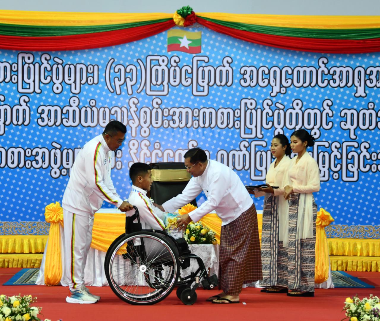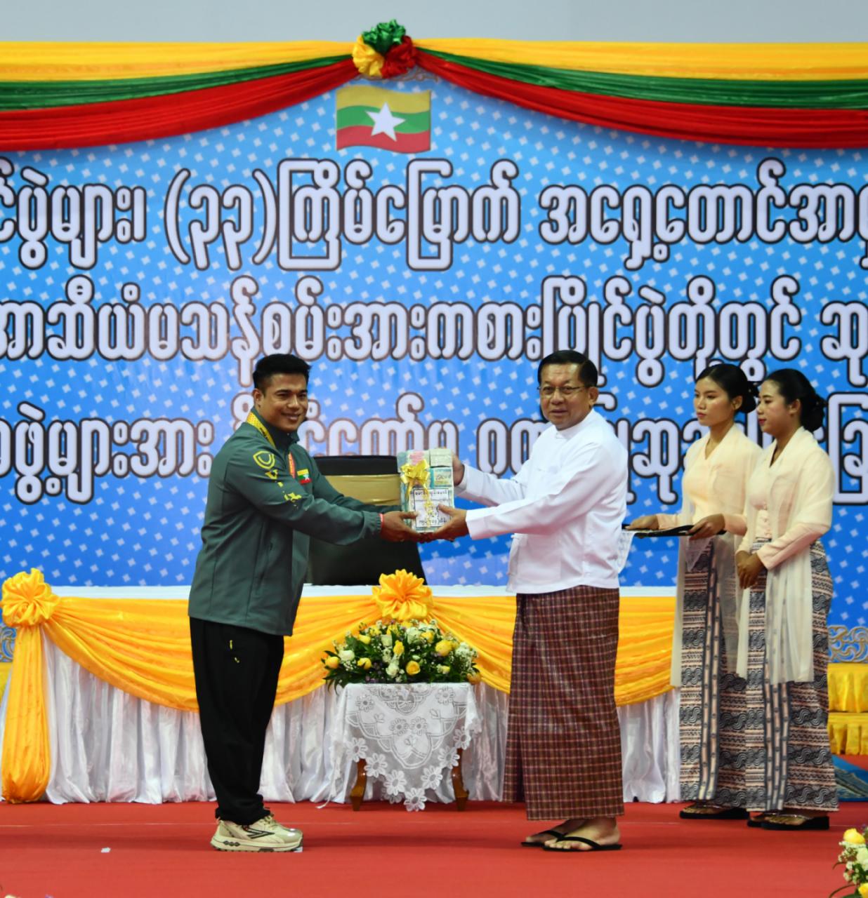 ကမ္ဘာ့အဆင့်အားကစားပြိုင်ပွဲများ၊ (၃၃) ကြိမ်မြောက် အရှေ့တောင်အာရှအားကစားပြိုင်ပွဲနှင့် (၁၃) ကြိမ်မြောက် အာဆီယံမသန်စွမ်းသူများ အားကစားပြိုင်ပွဲများတွင် ဆုတံဆိပ်များရရှိခဲ့သည့် မြန်မာအားကစားအဖွဲ့များအား နိုင်ငံတော်မှဂုဏ်ပြုဆု ချီးမြှင့်ခြင်းအခမ်းအနားကျင်းပ ပြည်ထောင်စုသမ္မတမြန်မာနိုင်ငံတော်ယာယီသမ္မတ နိုင်ငံတော်လုံခြုံရေးနှင့် အေးချမ်းသာယာရေးကော်မရှင်ဥက္ကဋ္ဌ ဗိုလ်ချုပ်မှူးကြီး မင်းအောင်လှိုင် တက်ရောက်၍ ဂုဏ်ပြုဆုငွေများချီးမြှင့်