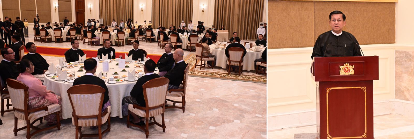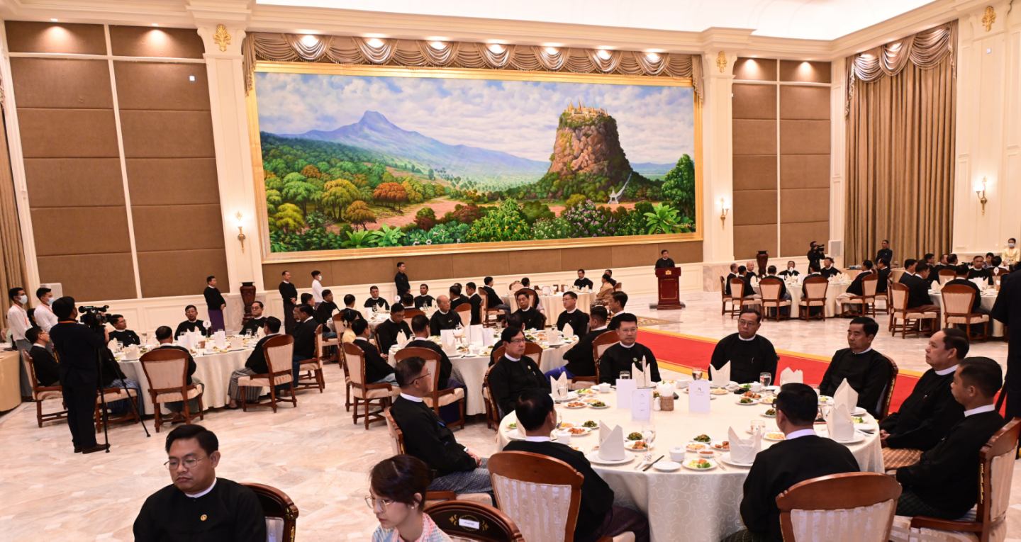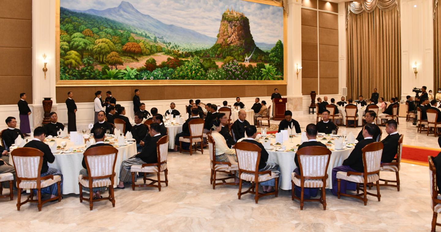ပြည်ထောင်စုသမ္မတမြန်မာနိုင်ငံတော် ယာယီသမ္မတ နိုင်ငံတော်လုံခြုံရေးနှင့် အေးချမ်းသာယာရေးကော်မရှင်ဥက္ကဋ္ဌ ဗိုလ်ချုပ်မှူးကြီး မင်းအောင်လှိုင် က အပြည်ပြည်ဆိုင်ရာတရားရုံး(ICJ) ၌ တရားရင်ဆိုင်ကြားနာပွဲသို့ သွားရောက်ဖြေရှင်းခဲ့သည့် မြန်မာကိုယ်စားလှယ်အဖွဲ့အား ဂုဏ်ပြုညစာစားပွဲဖြင့်တည်ခင်းဧည့်ခံ နေပြည်တော်၊ ဖေဖော်ဝါရီ - ၈
