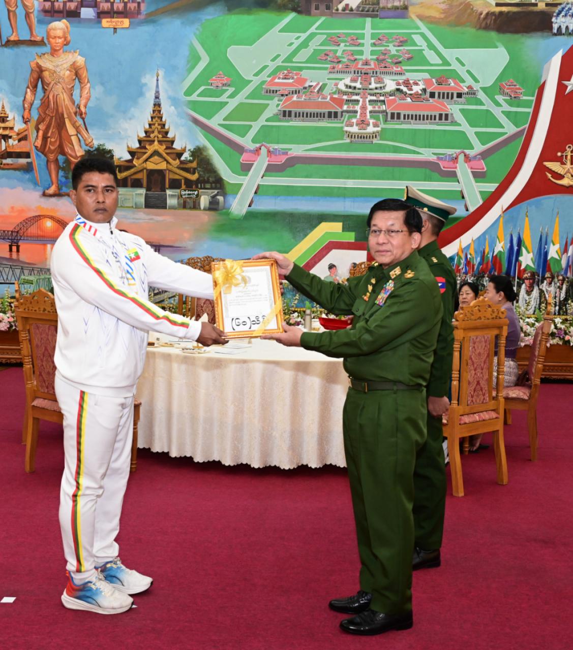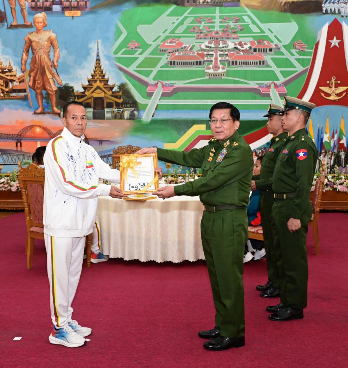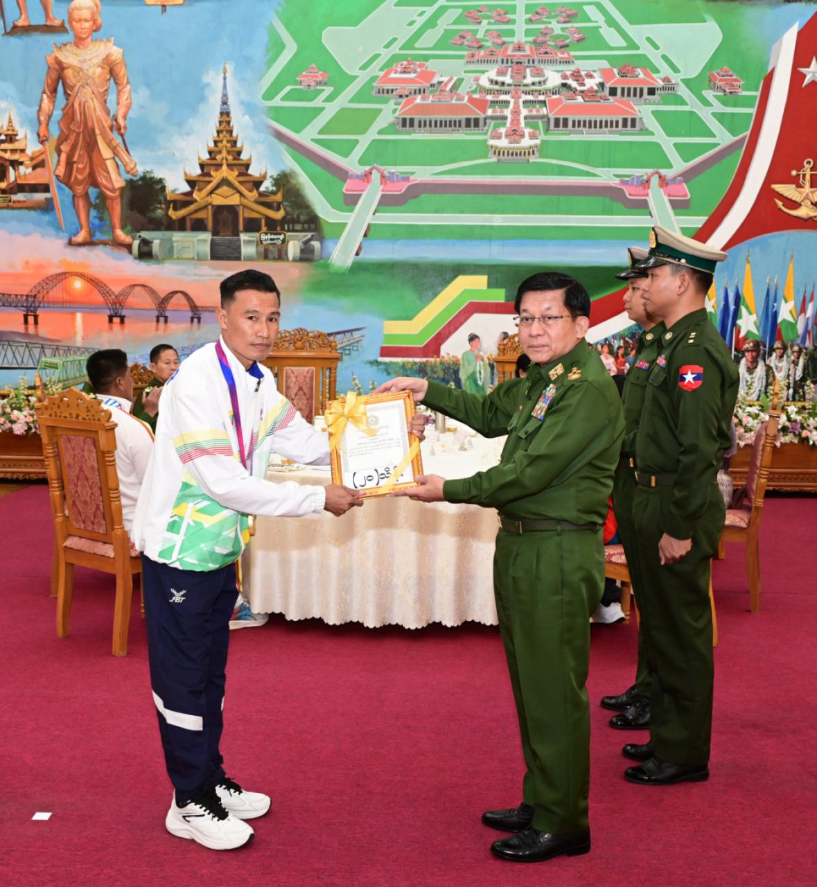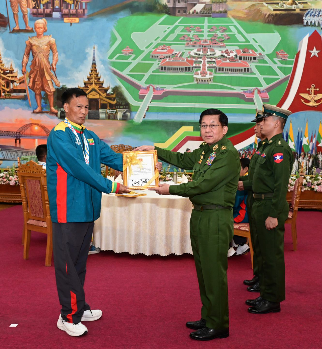 ထို့နောက် (၁၉) ကြိမ်မြောက်အာရှအားကစားပြိုင်ပွဲ၊ (၃၃) ကြိမ်မြောက် အရှေ့ တောင်အာရှအားကစားပြိုင်ပွဲနှင့် (၁၃) ကြိမ်မြောက် အာဆီယံမသန်စွမ်းအားကစား ပြိုင်ပွဲတို့တွင် ဆုတံဆိပ်များရယူဆွတ်ခူးပေးခဲ့ကြသည့် တပ်မတော်သားအားကစား သမားများနှင့်နည်းပြများအား ဂုဏ်ပြုဆုများချီးမြှင့်ခြင်း အခမ်းအနားကို ကျင်းပ ပြုလုပ်ရာ နိုင်ငံတော်လုံခြုံရေးနှင့် အေးချမ်းသာယာရေးကော်မရှင်ဥက္ကဋ္ဌ တပ်မတော် ကာကွယ်ရေးဦးစီးချုပ်က(၁၉) ကြိမ်မြောက်အာရှအားကစားပြိုင်ပွဲတွင် ပိုက်ကျော်ခြင်း (အသင်းလိုက်)ပြိုင်ပွဲ၌ ရွှေတံဆိပ်ဆုရရှိခဲ့သည့် အရာခံဗိုလ် သန့်ဇင်ဦး၊ (၁၃) ကြိမ်မြောက် အာဆီယံမသန်စွမ်းအားကစား ပြိုင်ပွဲတွင် ပြေးခုန်ပစ်(လှံတံပစ်) (တစ်ဦးချင်း) ပြိုင်ပွဲနှင့် (သံလုံးပစ်)(တစ်ဦးချင်း)ပြိုင်ပွဲတို့၌ ရွှေတံဆိပ်ဆုများ ရရှိ ခဲ့သည့် အရာခံဗိုလ် တင်ညို၊ (၃၃) ကြိမ်မြောက် အရှေ့တောင် အာရှအားကစား ပြိုင်ပွဲတွင် ခြင်းလုံး(ကွင်းသွင်း)(အသင်းလိုက်)ပြိုင်ပွဲ၌ ငွေတံဆိပ်ဆုရရှိခဲ့သည့် ဒုတိယ အရာခံဗိုလ် အောင်ဇော်၊ တပ်ကြပ်/၁၃ ကျော်ဇေယျာဝင်း၊ ဒုတိယတပ်ကြပ် စိုးပိုင်ဦး၊ (၁၃) ကြိမ် မြောက် အာဆီယံမသန်စွမ်းအားကစား ပြိုင်ပွဲတွင် ပြေးခုန်ပစ်အားကစား နည်း၌ ရွှေတံဆိပ်ဆု၊ ငွေတံဆိပ်ဆုနှင့် ကြေးတံဆိပ်ဆုများရရှိအောင် နည်းပြပေး နိုင်ခဲ့သည့် ဒုတိယအရာခံဗိုလ် သက်ဝင်း တို့အား တပ်မတော်ကာကွယ်ရေးဦးစီးချုပ်၏ ဂုဏ်ထူး ဆောင်လက်မှတ်၊ ဂုဏ်ပြုမှတ်တမ်းလွှာနှင့် ဂုဏ်ပြုချီးမြှင့်ငွေများကို တစ်ဦးချင်းပေး အပ်ချီးမြှင့်သည်။