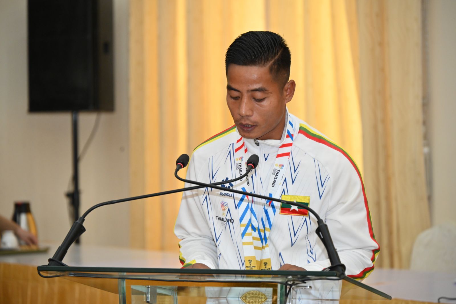 နိုင်ငံတကာအဆင့် အားကစားပြိုင်ပွဲများတွင် ဆုတံဆိပ်များရရှိပြီး နိုင်ငံ့ဂုဏ်ကို ဆောင်ခဲ့သည့် တပ်မတော်သား အားကစားသမားများအတွက် နိုင်ငံတော်နှင့် တပ်မတော်က အသိအမှတ်ပြု ဂုဏ်ယူကြောင်းနှင့် အားကစားကဏ္ဍအောင်မြင်မှု ဆိုသည်မှာ နိုင်ငံတော်၏ ဖွံ့ဖြိုးတိုးတက်မှုကိုပါ သွယ်ဝိုက်ဖော်ဆောင်နေခြင်း ဖြစ်သကဲ့ သို့ ယခုထက်ပိုမိုအောင်မြင်အောင် ဆက်လက်ကြိုးပမ်း ဖော်ဆောင်ခြင်းဖြင့် နိုင်ငံတော် နှင့် တပ်မတော်၏ ဂုဏ်သိက္ခာကို မြှင့်တင်ပေးကြရန် ပြောကြားလိုကြောင်းဖြင့် ပြောကြားသည်။