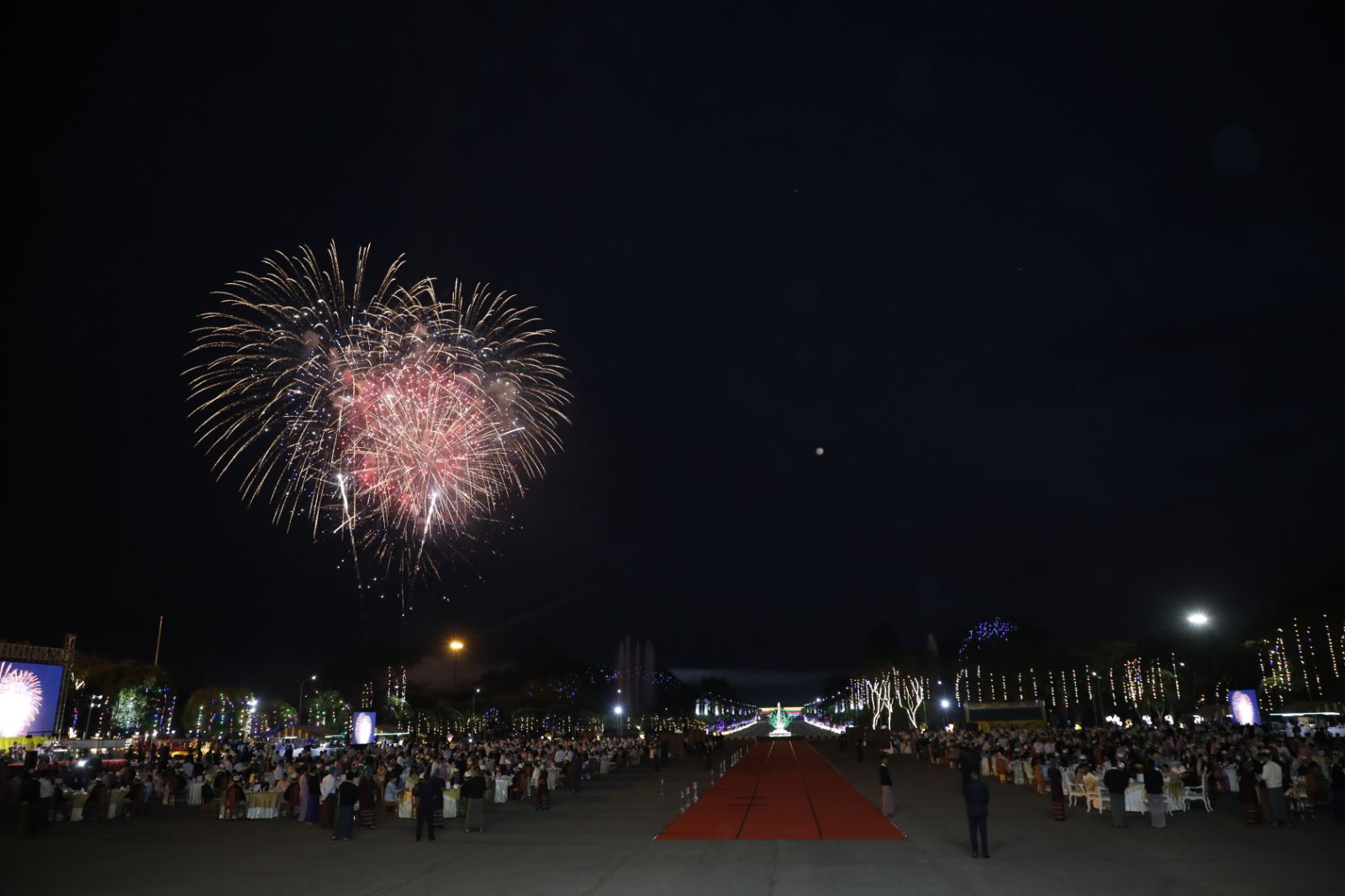ယင်းနောက် နိုင်ငံတော်ယာယီသမ္မတ နိုင်ငံတော်လုံခြုံရေးနှင့် အေးချမ်းသာယာ ရေးကော်မရှင်ဥက္ကဋ္ဌနှင့် ဇနီးတို့သည် ဂုဏ်ပြုညစာစားပွဲ အခမ်းအနားသို့တက်ရောက် လာကြသူများနှင့်အတူ ၂၀၂၆ ခုနှစ် (၇၉)နှစ်မြောက် ပြည်ထောင်စုနေ့ကို ဂုဏ်ပြု သောအားဖြင့် မီးရှူး မီးပန်းများပစ်ဖောက်ဂုဏ်ပြုမှုကို ကြည့်ရှုအားပေးကြသည်။