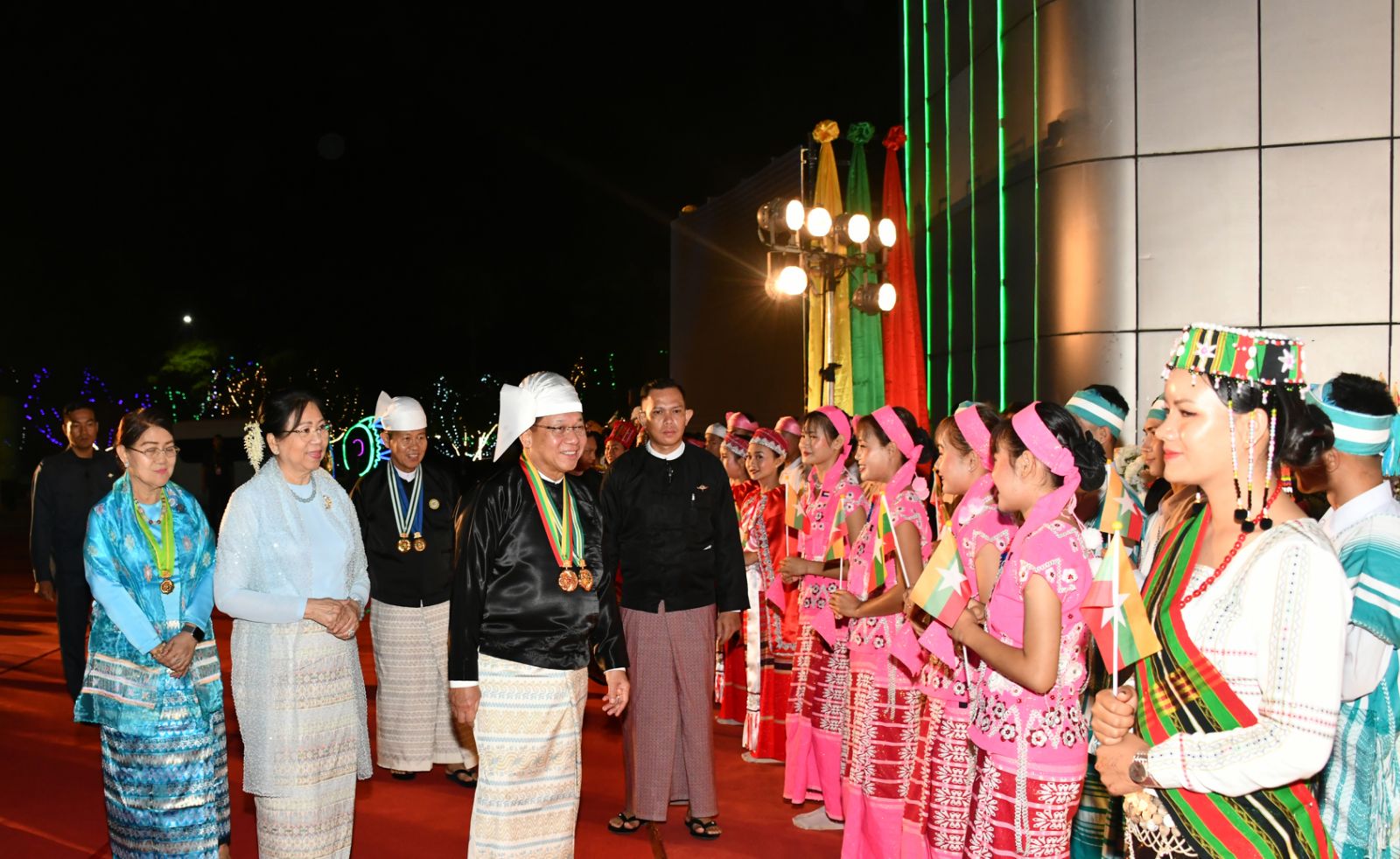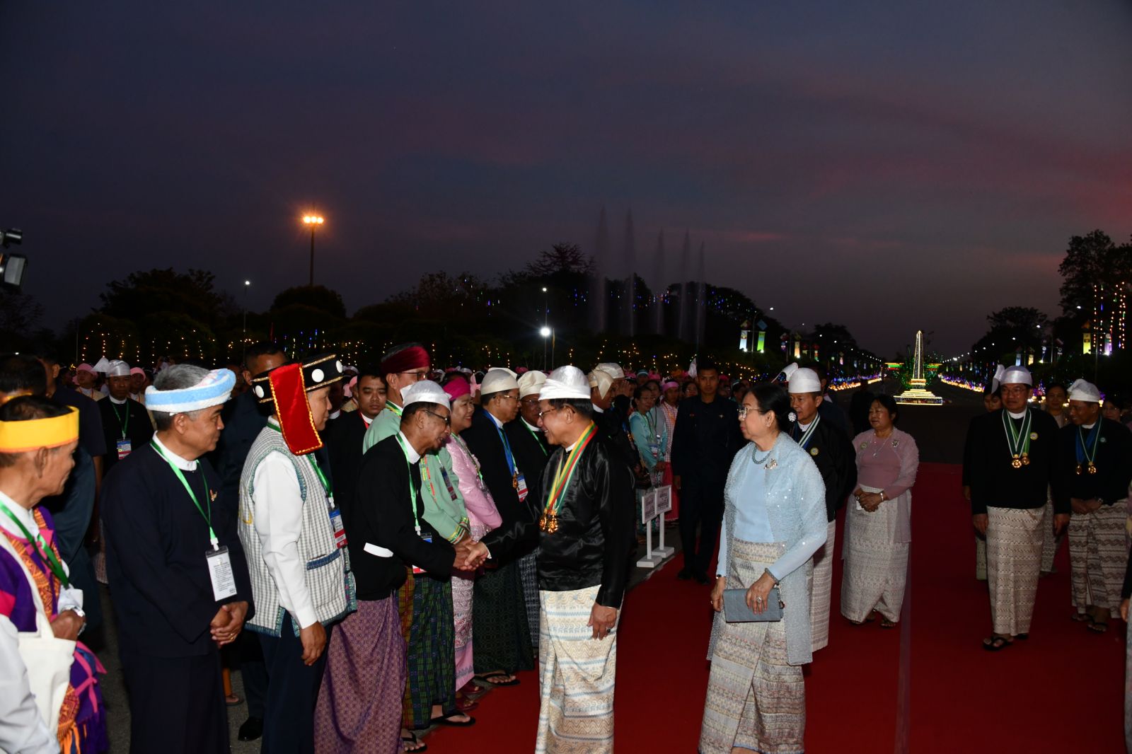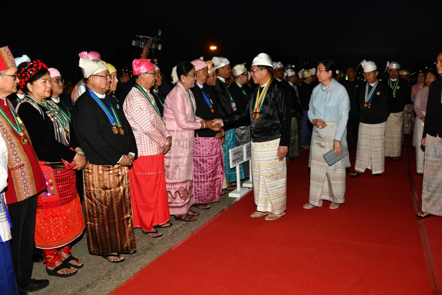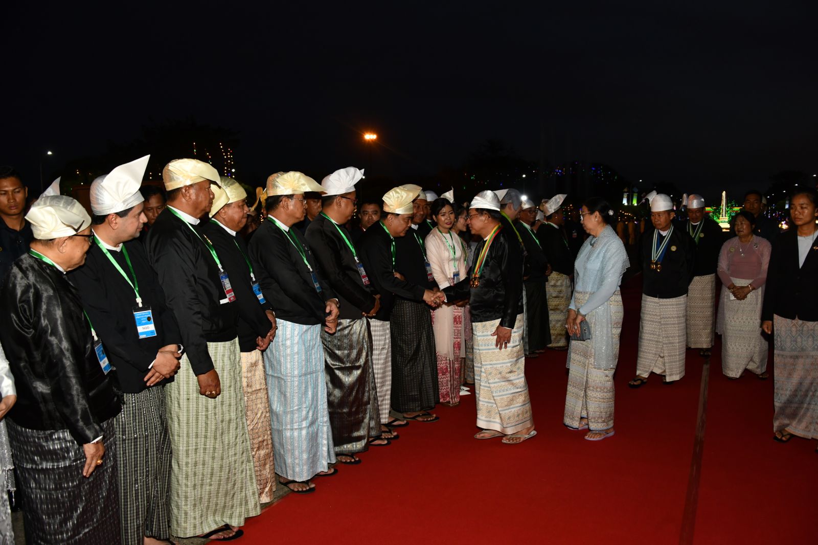 ထို့နောက် နိုင်ငံတော်ယာယီသမ္မတ နိုင်ငံတော်လုံခြုံရေးနှင့် အေးချမ်းသာယာ ရေးကော်မရှင်ဥက္ကဋ္ဌနှင့် ဇနီး၊ ကော်မရှင်ဒုတိယဥက္ကဋ္ဌနှင့် ဇနီးတို့သည် ဂုဏ်ပြုညစာ စားပွဲသို့ တက်ရောက်လာကြသည့် တိုင်းဒေသကြီးနှင့် ပြည်နယ်များမှ တိုင်းရင်းသား ရိုးရာယဉ်ကျေးမှုအဖွဲ့များ၊ နိုင်ငံရေးပါတီများမှ ဥက္ကဋ္ဌများနှင့် ကိုယ်စားလှယ်များ၊ NCA စာချုပ်လက်မှတ်ရေးထိုးထားသည့် တိုင်းရင်းသားလက်နက်ကိုင် အဖွဲ့အစည်းများမှ ခေါင်းဆောင်များနှင့် ကိုယ်စားလှယ်များ၊ တိုင်းဒေသကြီးနှင့် ပြည်နယ်များမှ MSME လုပ်ငန်းရှင်များ၊ တိုင်းဒေသကြီးနှင့် ပြည်နယ်များမှ စီးပွားရေးရာဝန်ကြီးများနှင့် တိုင်း ရင်းသားလူမျိုးရေးရာဝန်ကြီးများ၊ ကာကွယ်ရေးဦးစီးချုပ်ရုံးမှ အဆင့်မြင့် တပ်မတော် အရာရှိကြီးများနှင့်ဇနီးများ၊ ပြည်ထောင်စုဝန်ကြီးများ၊ ပြည်ထောင်စုအဆင့် ပုဂ္ဂိုလ်များ နှင့်ဇနီးများ၊ ကော်မရှင်အဖွဲ့ဝင်များနှင့်ဇနီးများအား ရင်းရင်းနှီးနှီး လိုက်လံနှုတ်ဆက် ကြသည်။