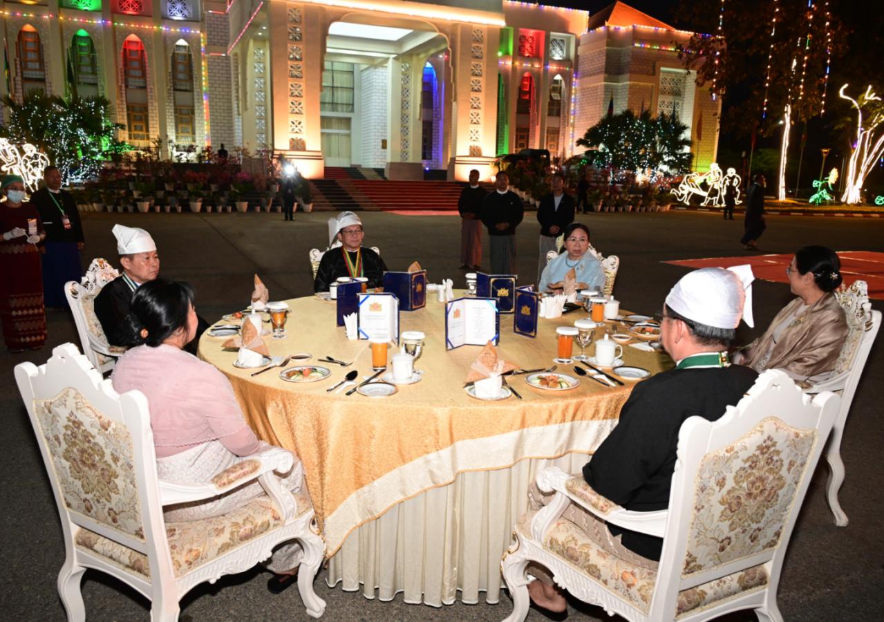 ပြည်ထောင်စုသမ္မတမြန်မာနိုင်ငံတော်ယာယီသမ္မတ နိုင်ငံ တော်လုံခြုံရေးနှင့် အေးချမ်းသာယာရေးကော်မရှင်ဥက္ကဋ္ဌ ဗိုလ်ချုပ်မှူးကြီး သတိုးမဟာသရေစည်သူ သတိုးသီရိသုဓမ္မ မင်းအောင်လှိုင် နှင့် ဇနီးဒေါ်ကြူကြူလှ တို့က (၇၉) နှစ်မြောက် ပြည်ထောင်စုနေ့အထိမ်းအမှတ် ဂုဏ်ပြုညစာစားပွဲဖြင့် တည်ခင်းဧည့်ခံ