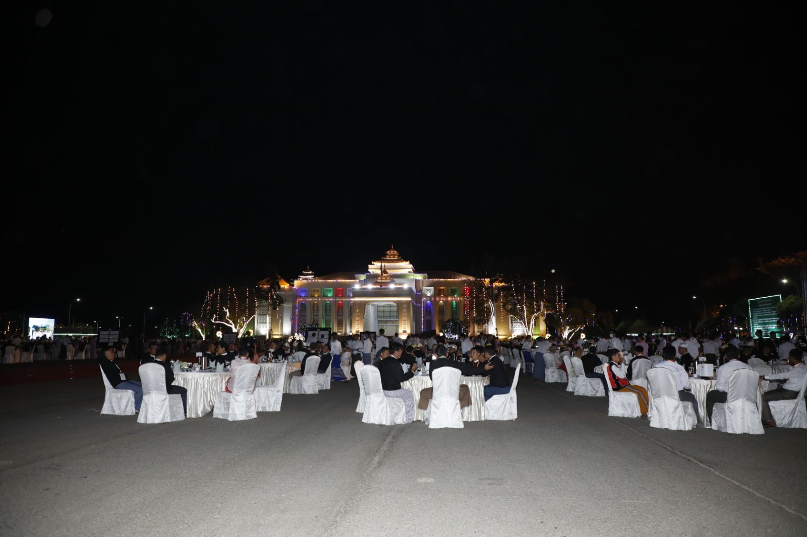 ဦးစွာ နိုင်ငံတော်ယာယီသမ္မတ နိုင်ငံတော်လုံခြုံရေးနှင့် အေးချမ်းသာယာရေး ကော်မရှင်ဥက္ကဋ္ဌ ဗိုလ်ချုပ်မှူးကြီး သတိုးမဟာသရေစည်သူ သတိုးသီရိသုဓမ္မ မင်းအောင်လှိုင် နှင့် ဇနီးဒေါ်ကြူကြူလှ တို့သည် ဂုဏ်ပြုညစာစားပွဲ အခမ်းအနား ကျင်းပမည့်မြို့တော်ခန်းမ ဥပစာရင်ပြင်သို့ရောက်ရှိကြရာ နိုင်ငံတော်လုံခြုံရေးနှင့် အေးချမ်းသာယာရေးကော်မရှင် ဒုတိယဥက္ကဋ္ဌ ဒုတိယဗိုလ်ချုပ်မှူးကြီး သီရိပျံချီ မဟာသရေစည်သူ စိုးဝင်းနှင့် ဇနီး ဒေါ်သန်းသန်းနွယ်၊ ကော်မရှင်အဖွဲ့ဝင် နိုင်ငံတော် ဝန်ကြီးချုပ် ဇေယျကျော်ထင် သရေစည်သူ ဦးညိုစောနှင့်ဇနီး၊ ကော်မရှင်အတွင်းရေး မှူးနှင့်ဇနီး၊ ပြည်ထောင်စုဝန်ကြီးများနှင့် ဇနီးများ၊ နေပြည်တော်ကောင်စီဥက္ကဋ္ဌနှင့် ဇနီး တို့က ကြိုဆိုနှုတ်ဆက်ကြသည်။