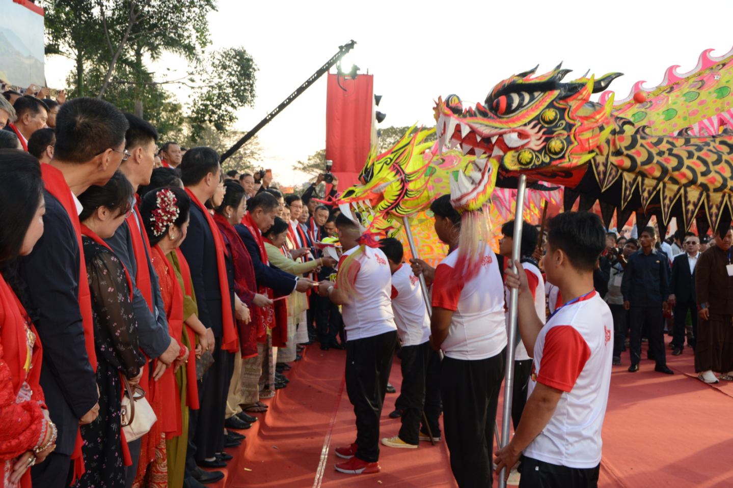 ယင်းနောက် နိုင်ငံတော်လုံခြုံရေးနှင့်အေးချမ်းသာယာရေးကော်မရှင် ဒုတိယ ဥက္ကဋ္ဌနှင့် ဇနီး၊ မြန်မာနိုင်ငံဆိုင်ရာတရုတ်ပြည်သူ့သမ္မတနိုင်ငံသံအမတ်ကြီးတို့အား ခြင်္သေ့ရှစ်ကောင်က မင်္ဂလာဂါရဝပြုကြိုဆိုကြပြီး တရုတ်ရိုးရာနှစ်သစ်ကူး အထိမ်း အမှတ်ပုဝါများဖြင့် ဂါရဝပြုသည်။